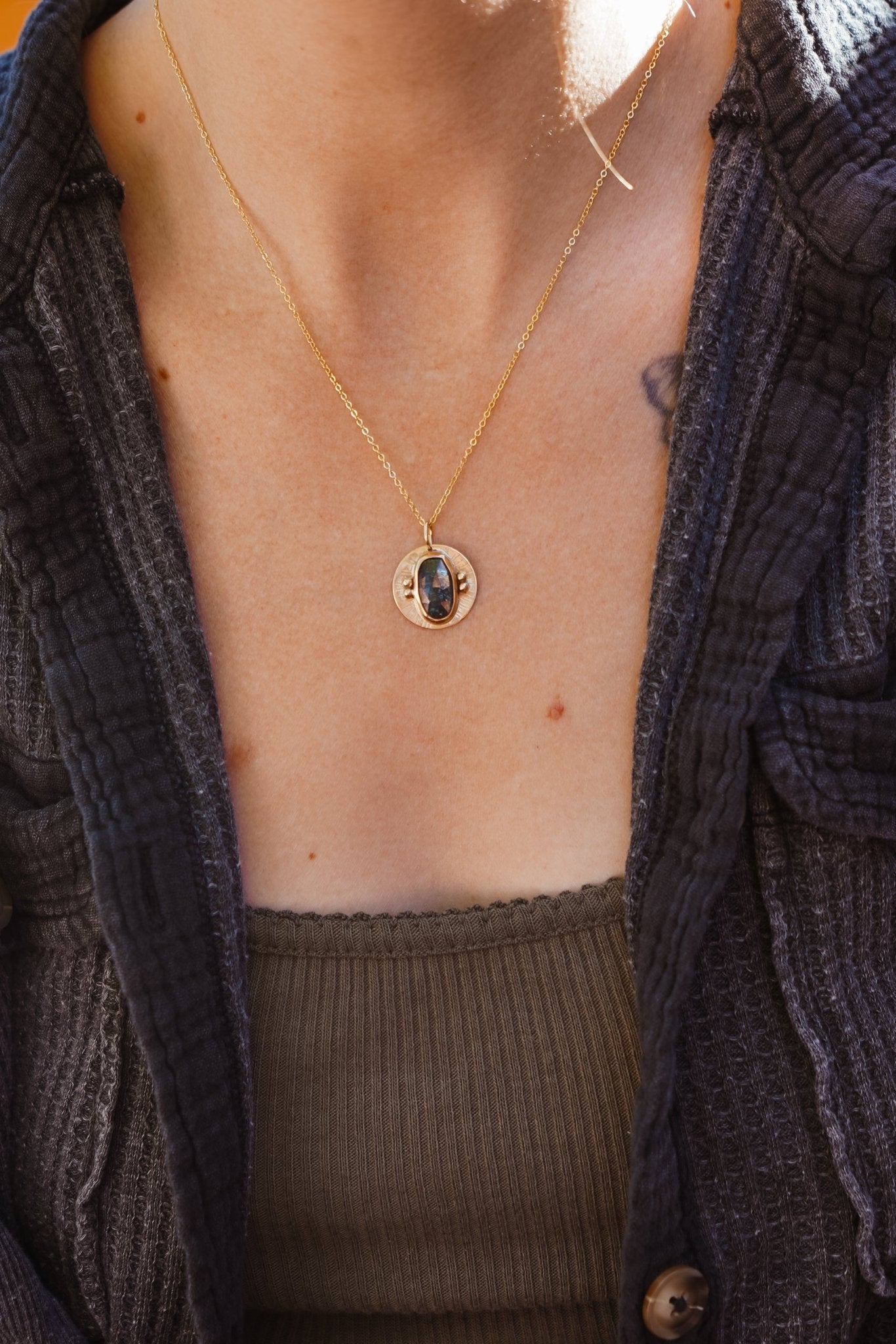 This gold-fill chain and pendant is such a vibe with this magical Kyanite stone. We've been so excited about all the great feedback we got from you guys on these gold-fill necklaces. This is a piece that can be worn with a dress for a special occasion or just as easily for casual everyday wear. Can't wait to see who ends up with this one!