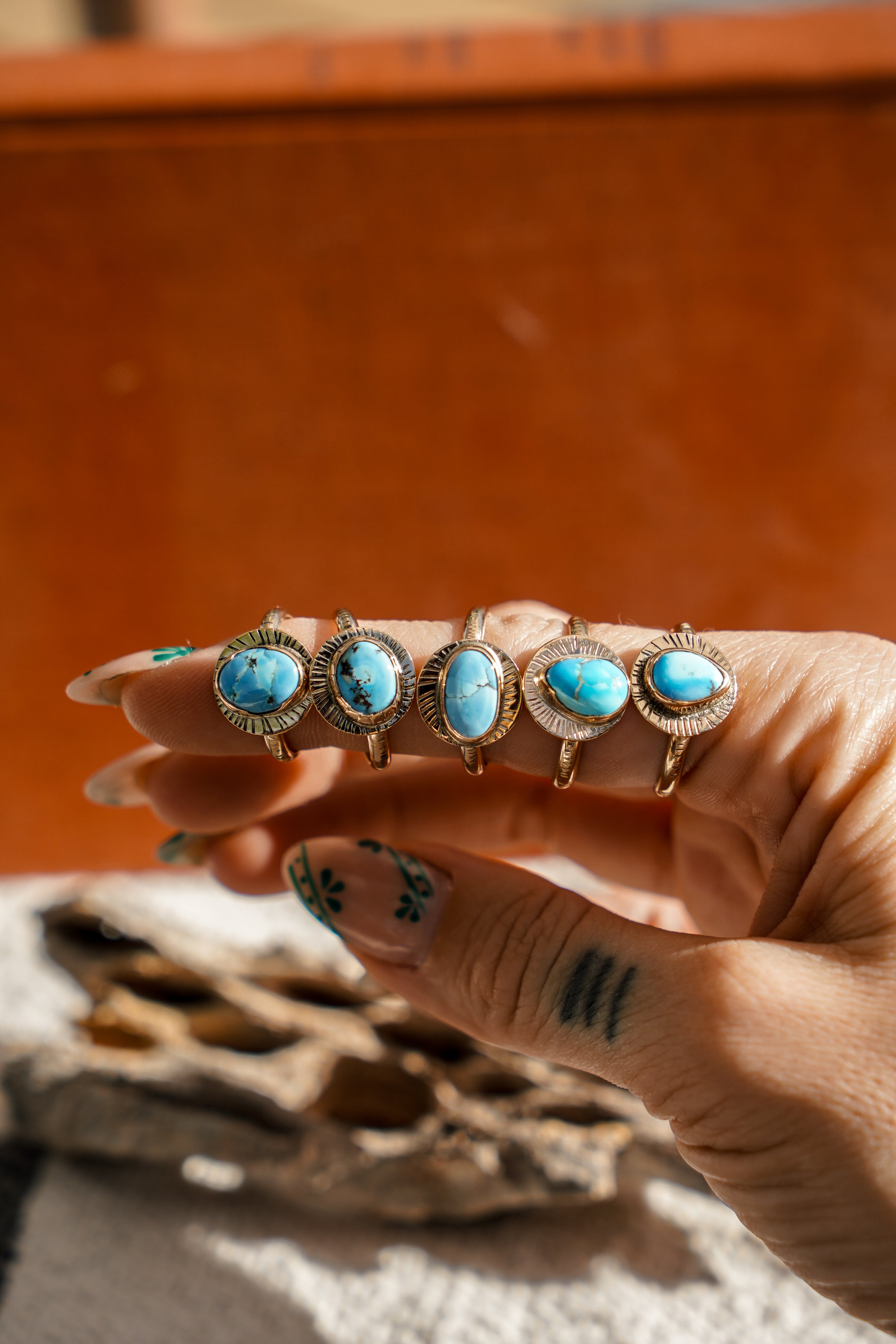 This dainty 14k gold-fill ring with hand stamped sun rays has us drooling. The light blue and matrix of this high-quality Golden Hills Turquoise makes this piece truly one-of-a-kind.