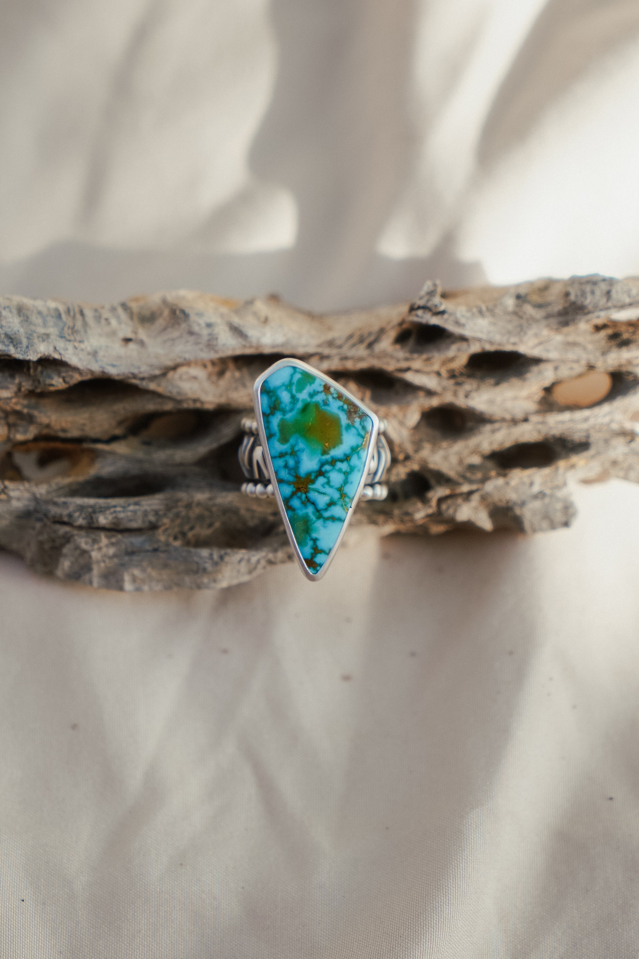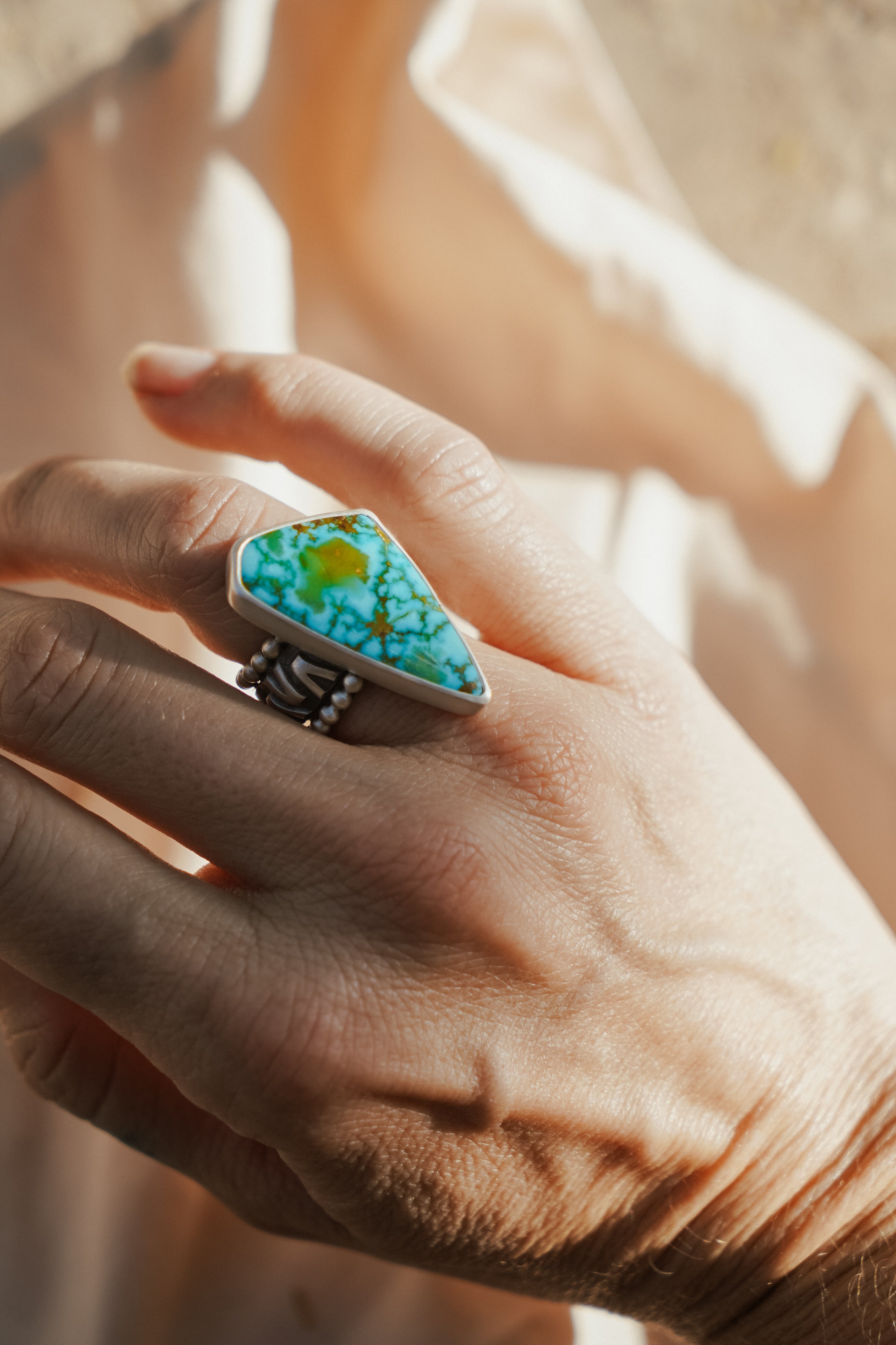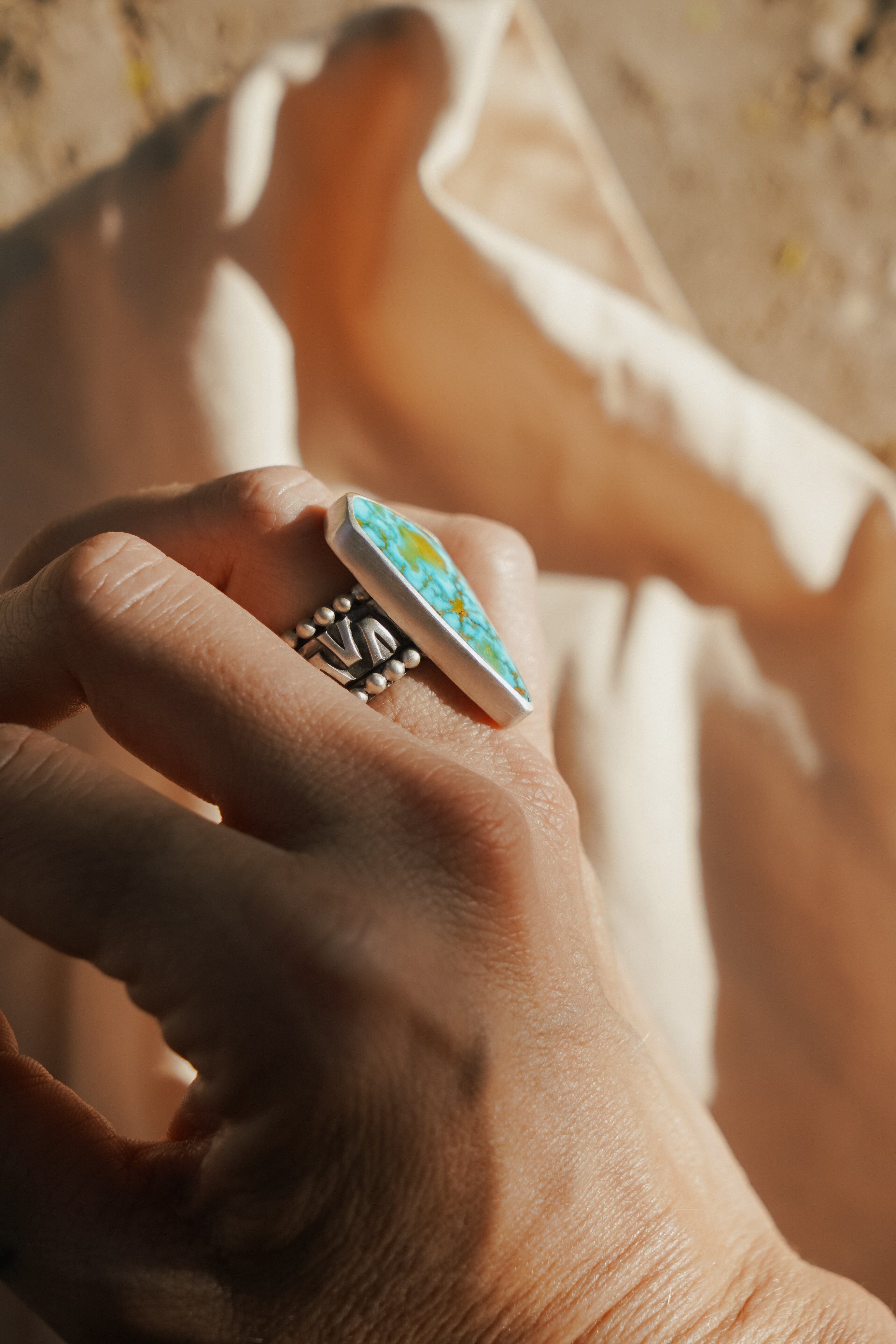 This high-grade piece of Kingman Turquoise is from our favorite lapidary artist here in Tucson that we've been saving for a special piece. I mean the color, matrix, and shape of this stone are unreal. We gave it a special new band design that turned out better than we could have hoped. The matte finish is the chef's kiss.