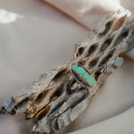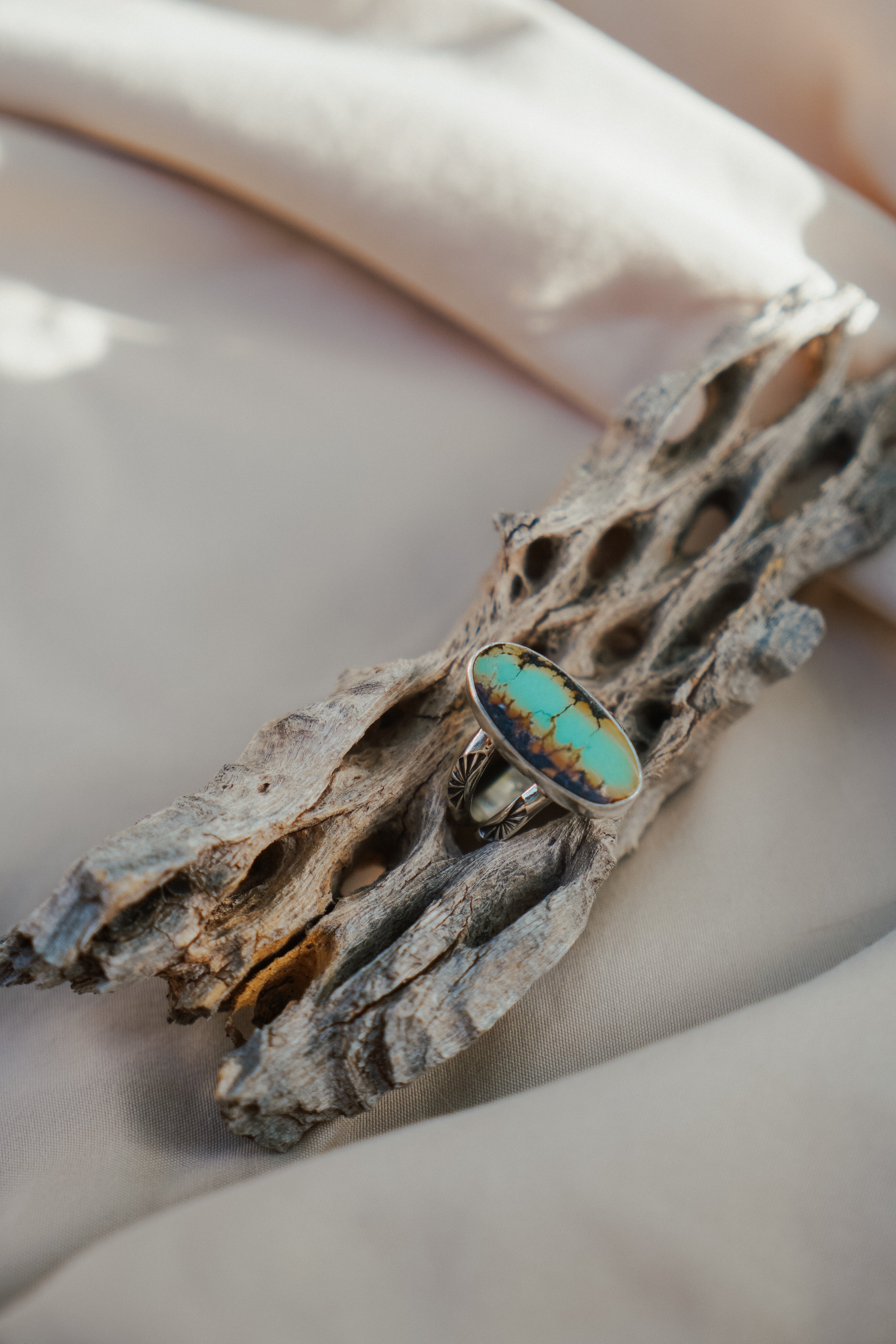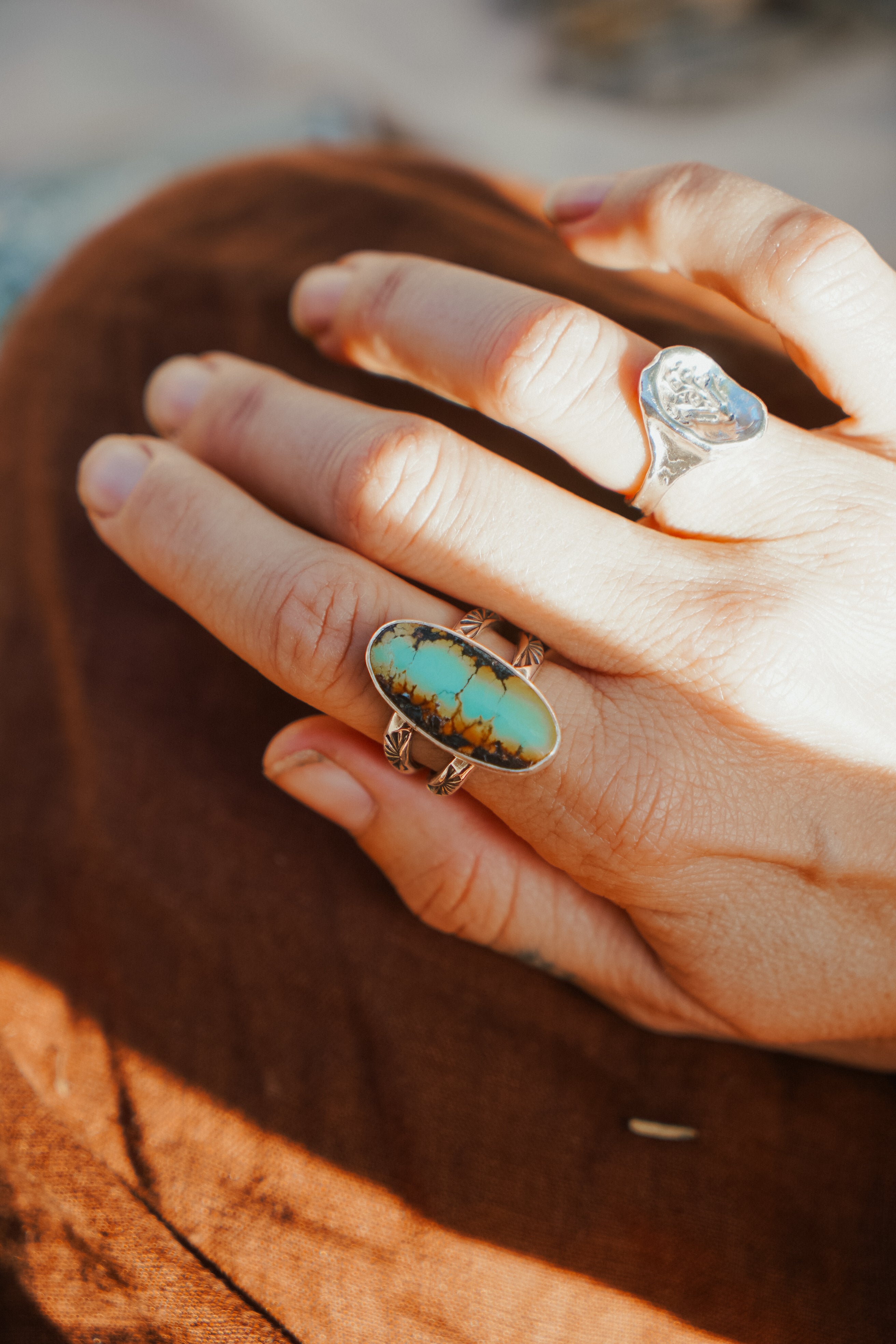The Hubei Turquoise ring features a distinctive double ring band with stamped detailing, accentuating the natural beauty of the turquoise stone. Highlighting the vibrant hues and unique patterns of the turquoise, this ring blends timeless style with artisanal quality. For those appreciating refined design and authentic materials.