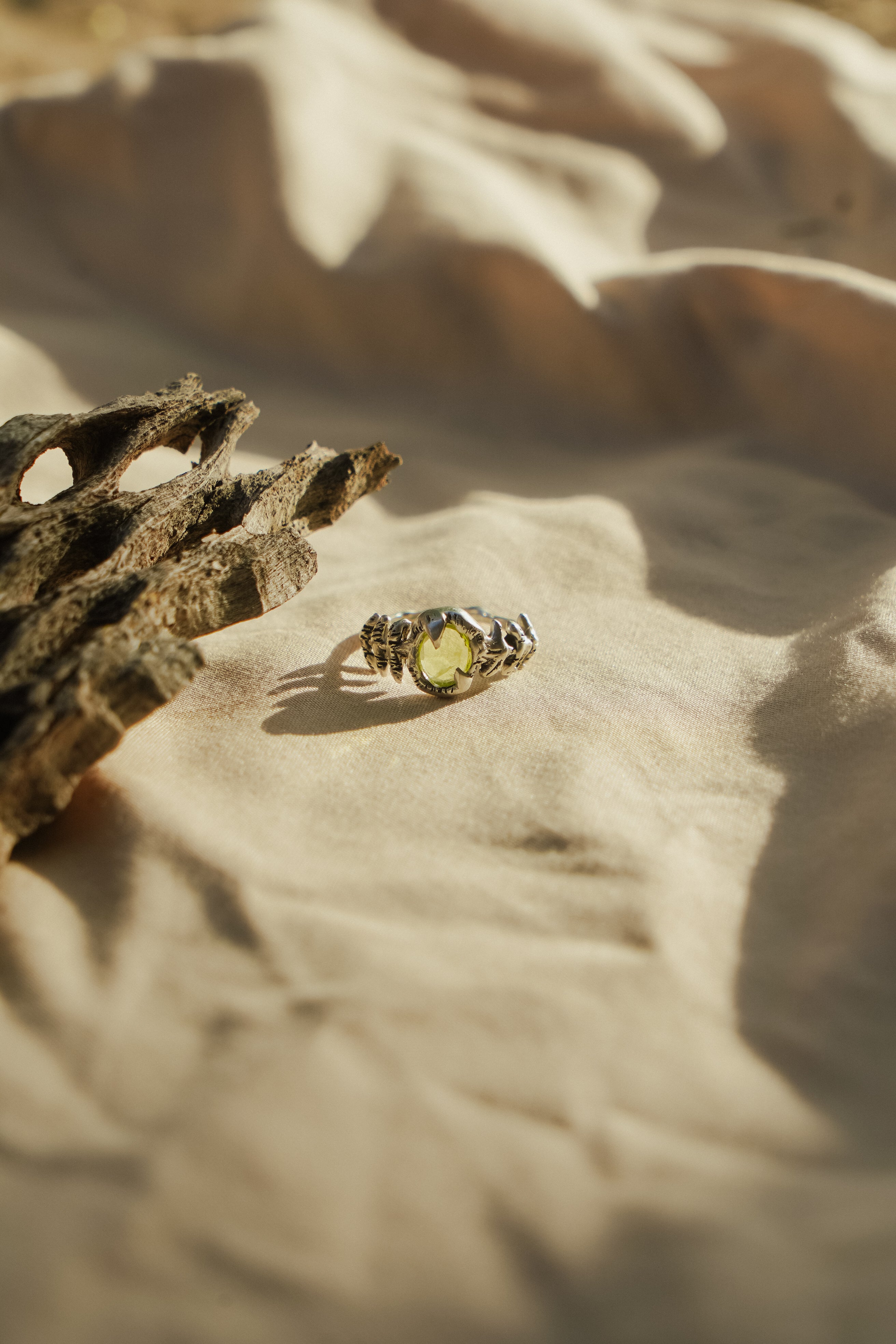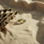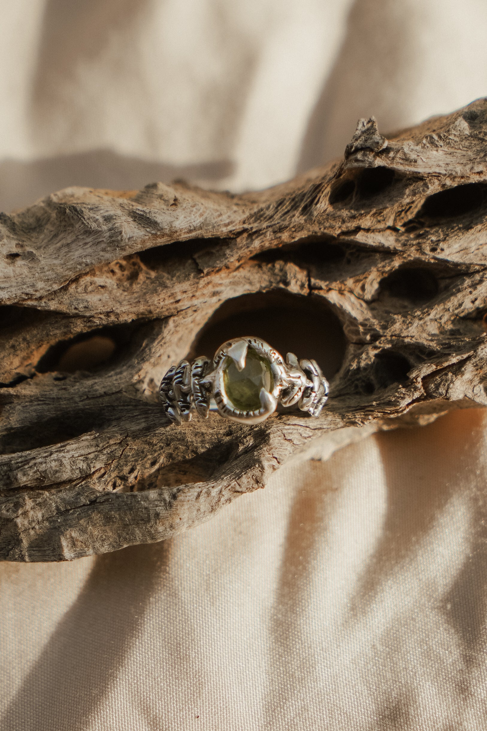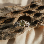 This Sylvaris Ring features sterling silver securely holding a delicate peridot stone, combining refined comfort with a sense of protection. The expertly crafted piece balances elegance and durability.
