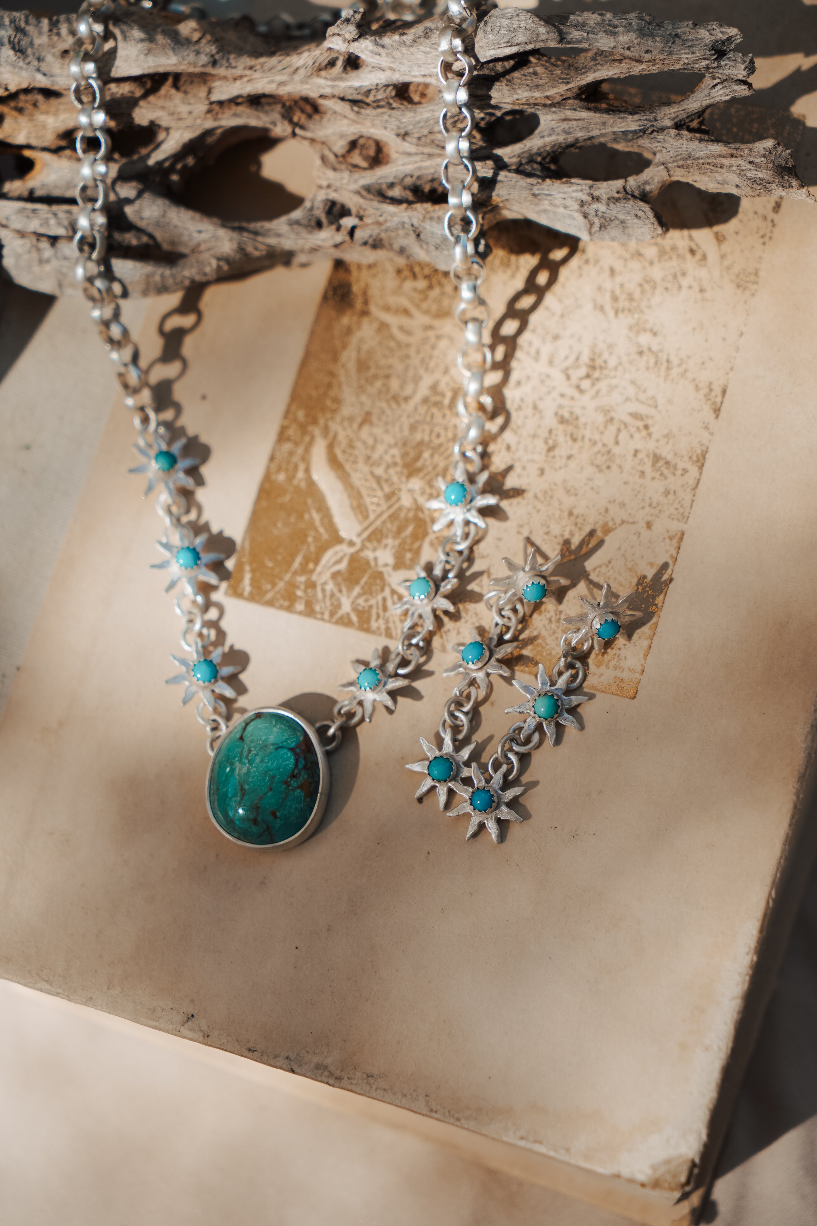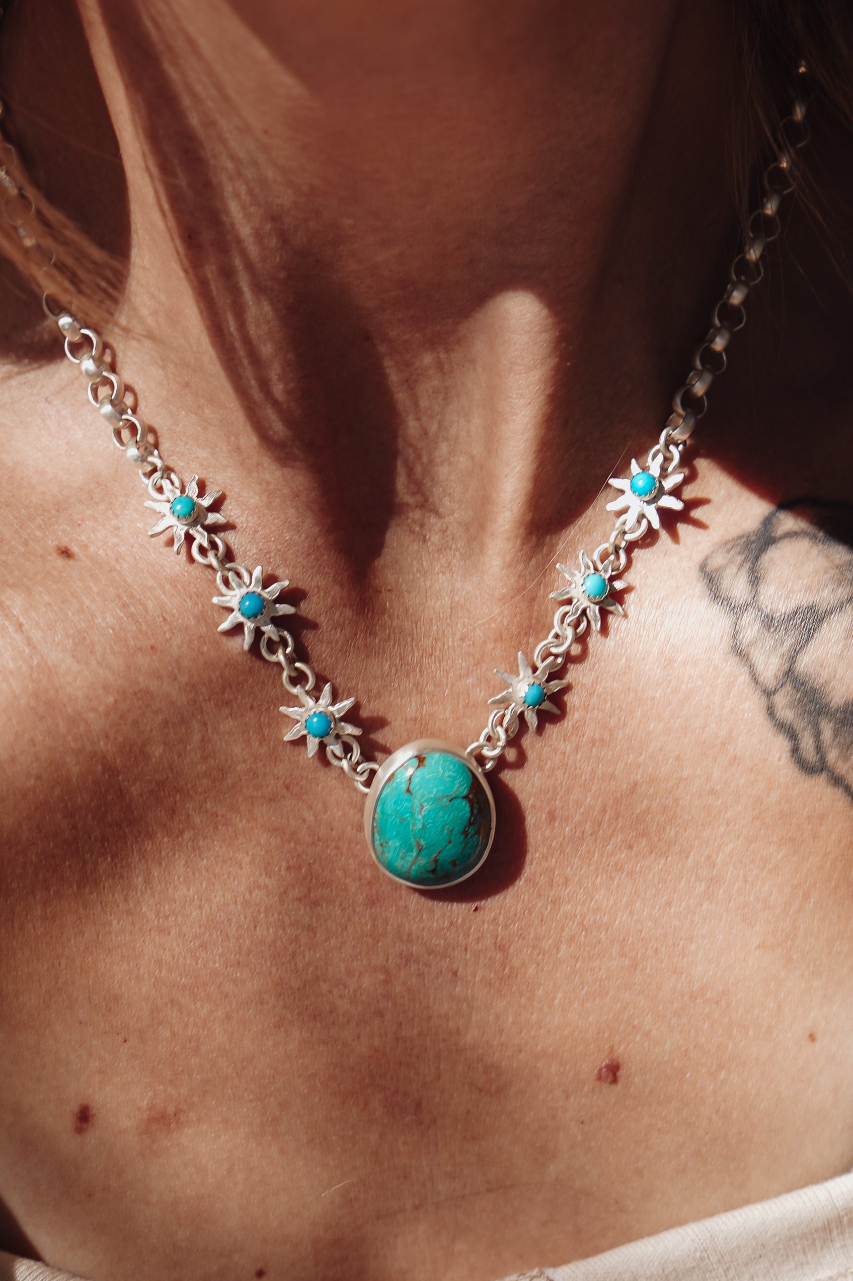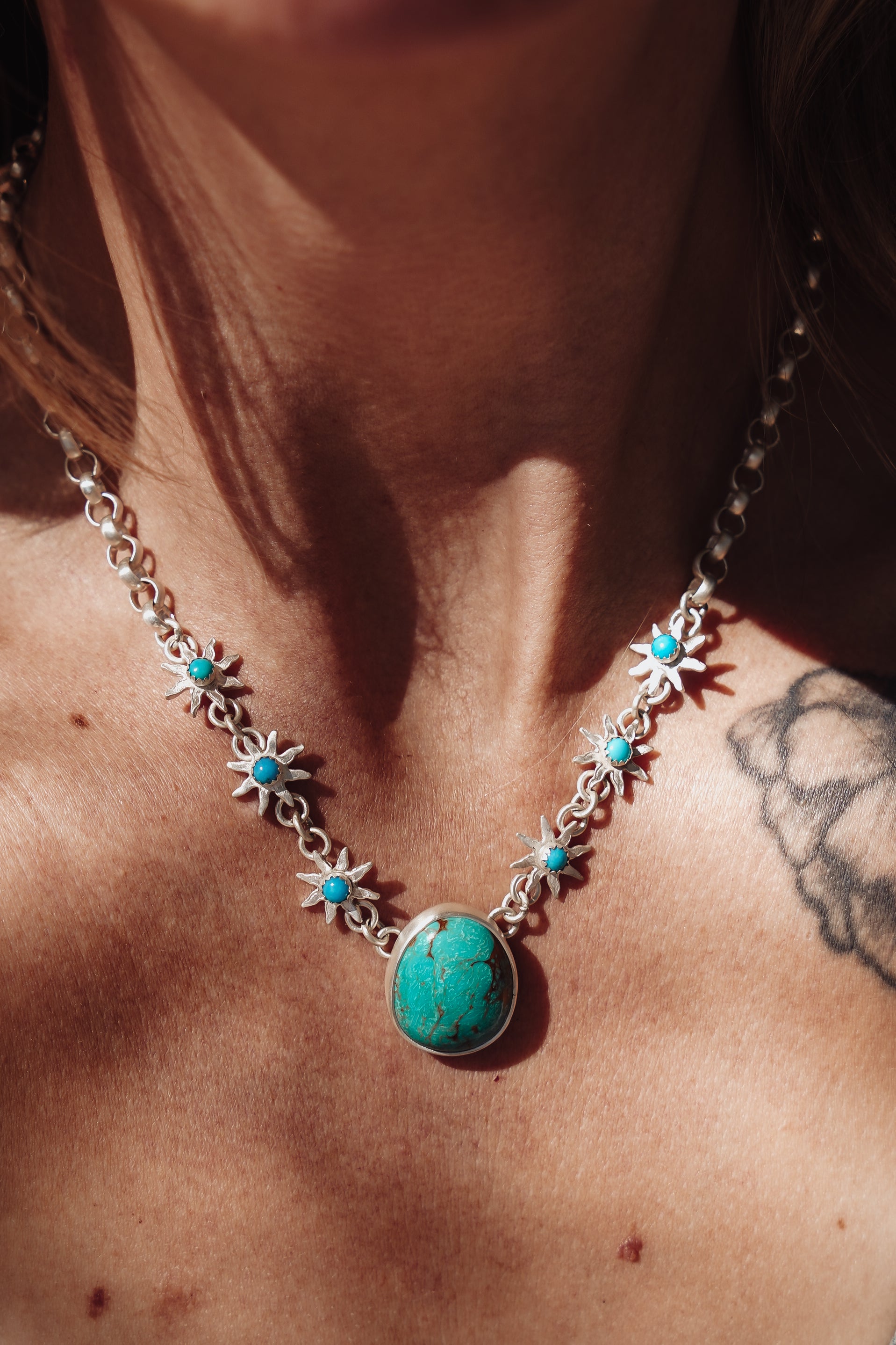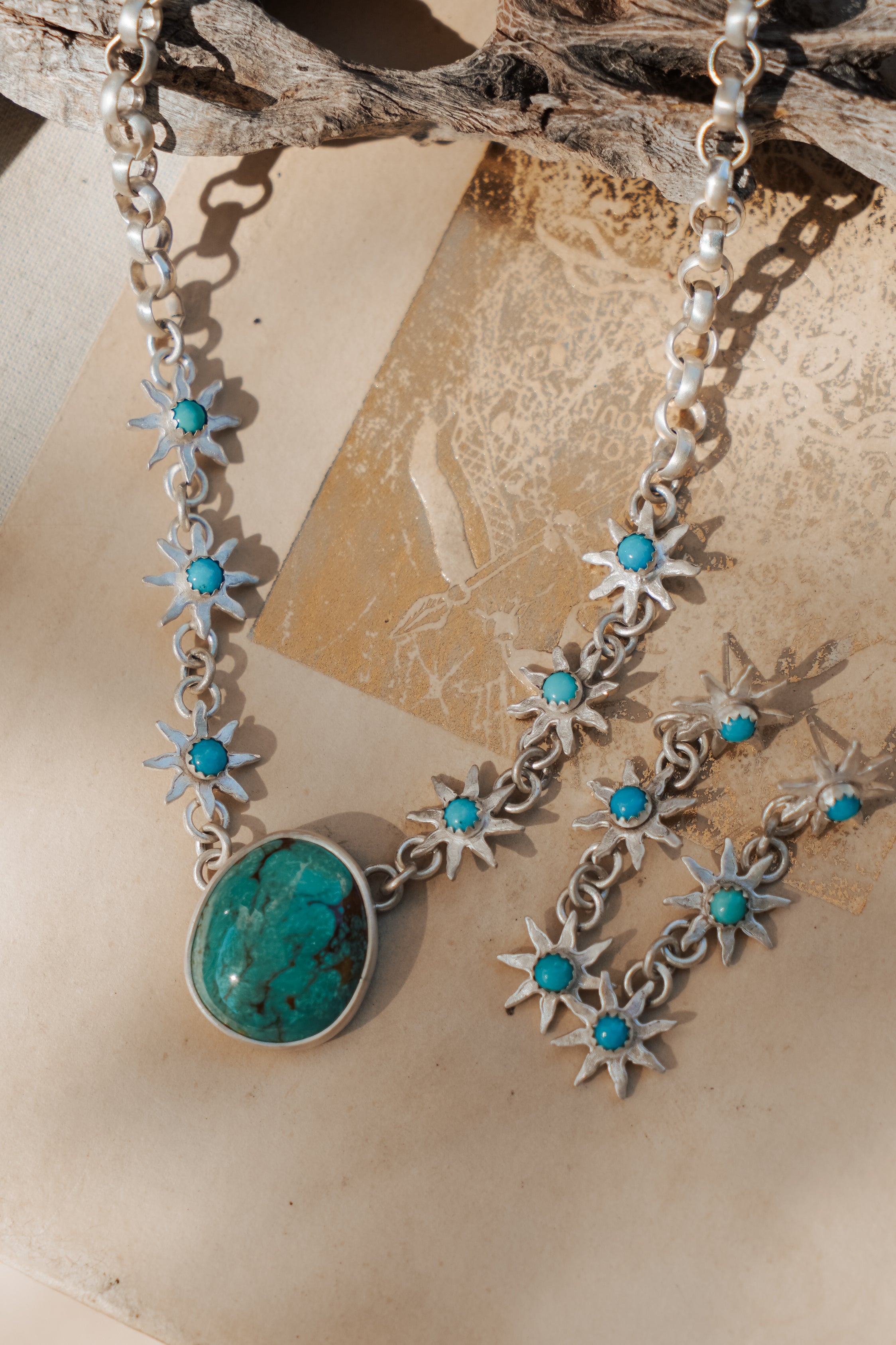 This stunning piece of turquoise does all the talking, but when paired with these handmade sterling silver elements and small turquoise stones it's a truly one-of-a-kind, heirloom piece. This was designed together with the Desert Sun Drip Earrings and would be an amazing duo worn together!