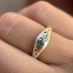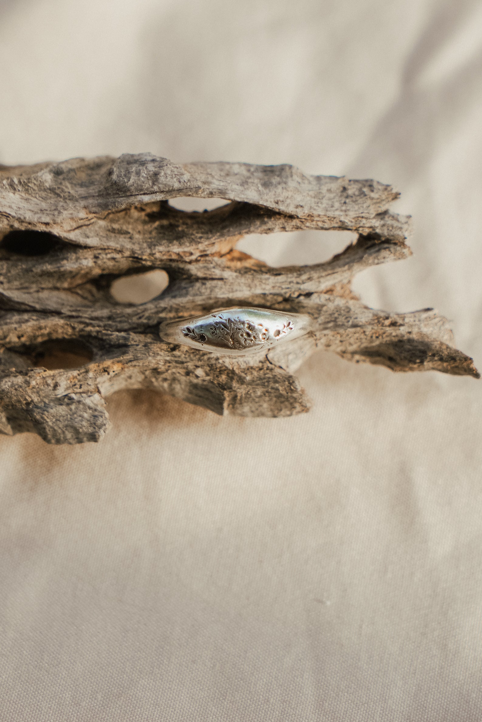 The Garden Song Ring features a subtle, etched floral design that captures a romantic, timeless elegance. Its signet style offers a classic silhouette, perfect for everyday wear or special occasions.