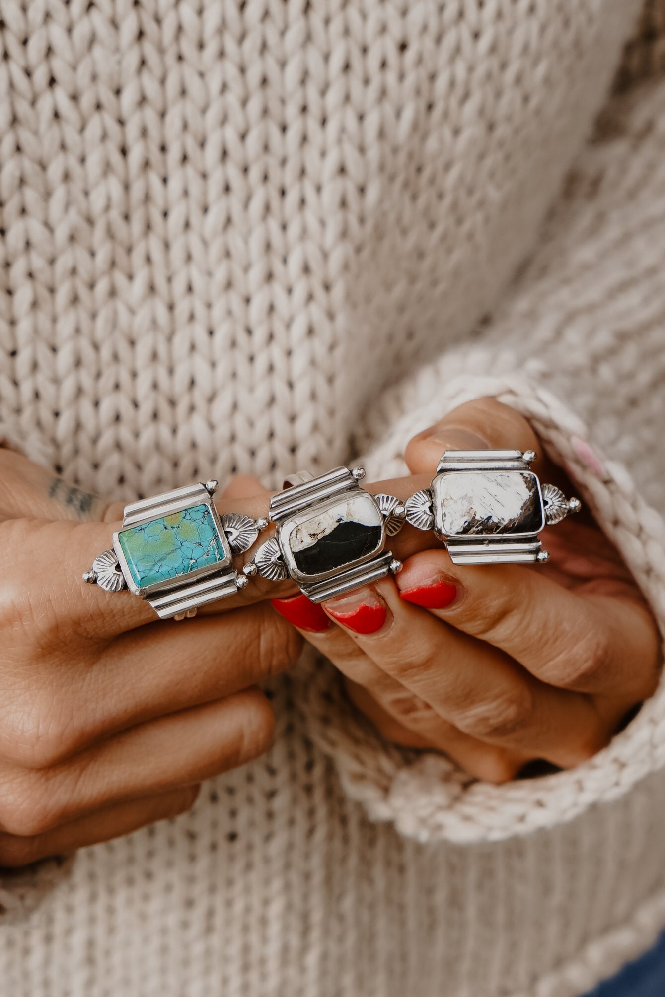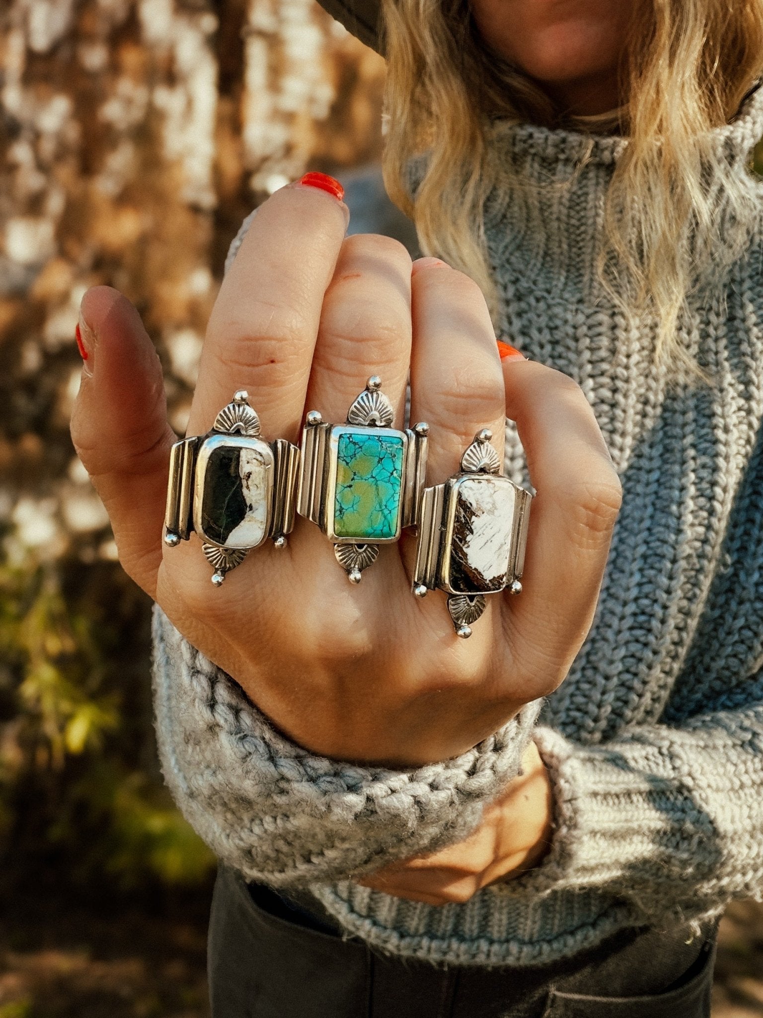 We're loving this funky new design- so much fun to dream up and create! The unique matrix of this white buffalo stone is the perfect touch with the vibe of this design. We hope you guys love it as much as we do so we can bring this one back for future collections.