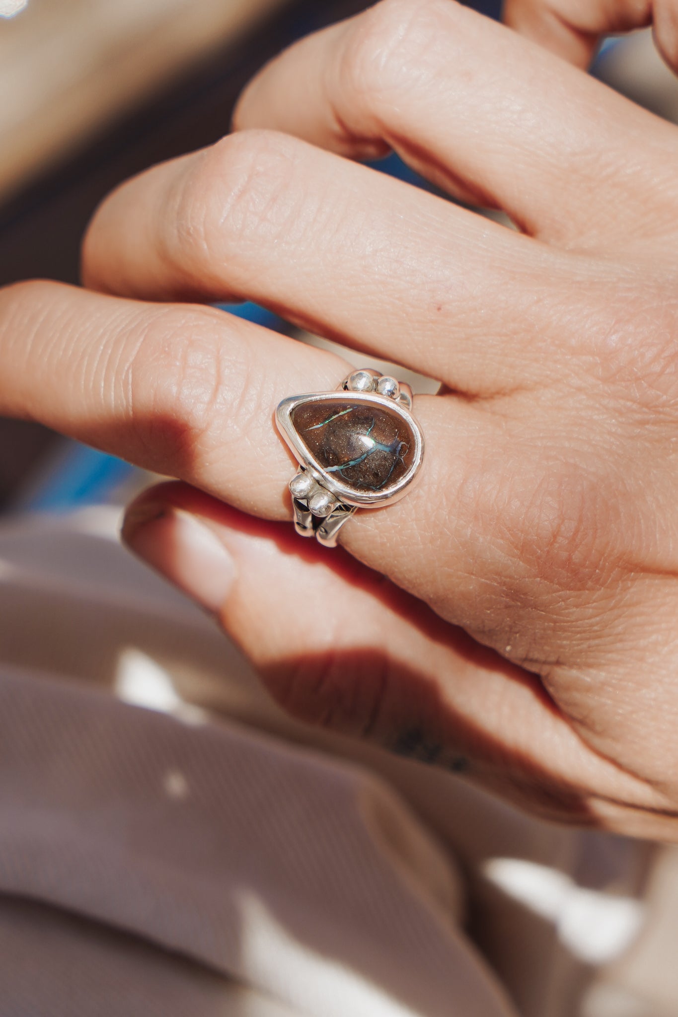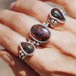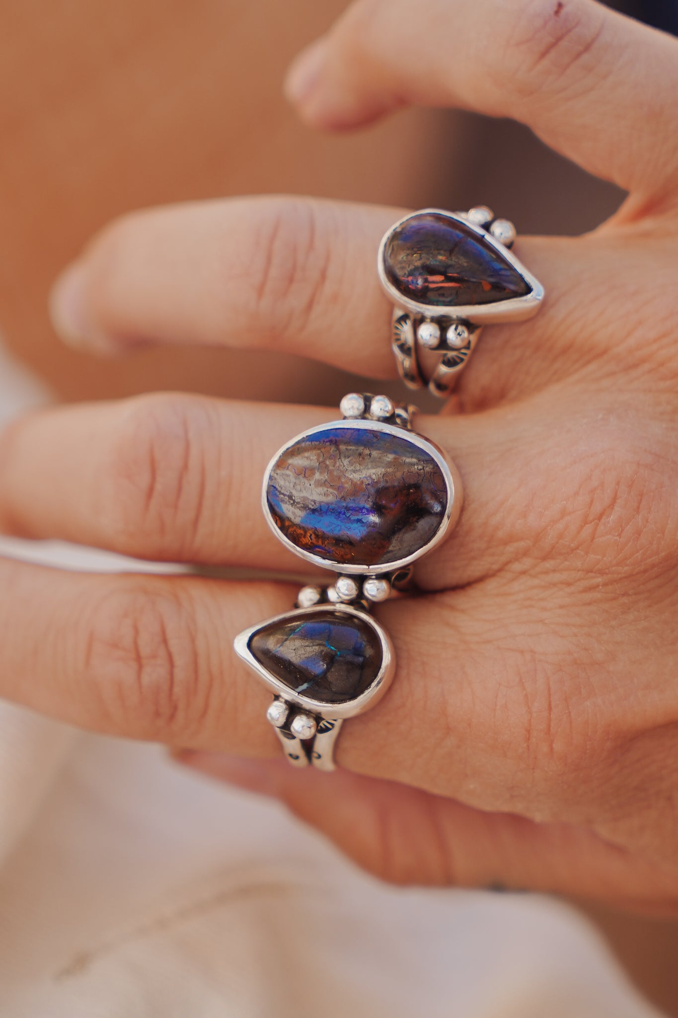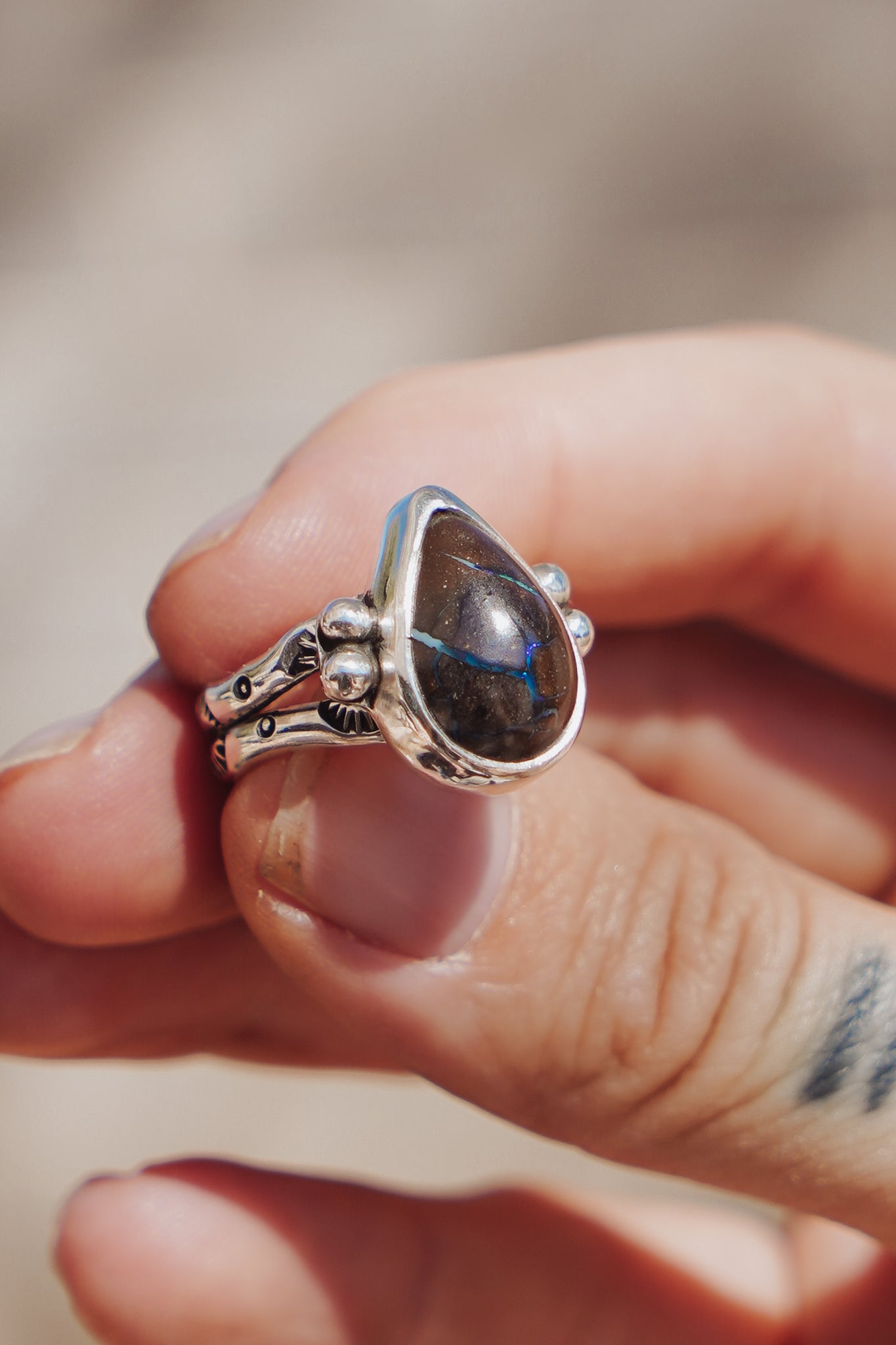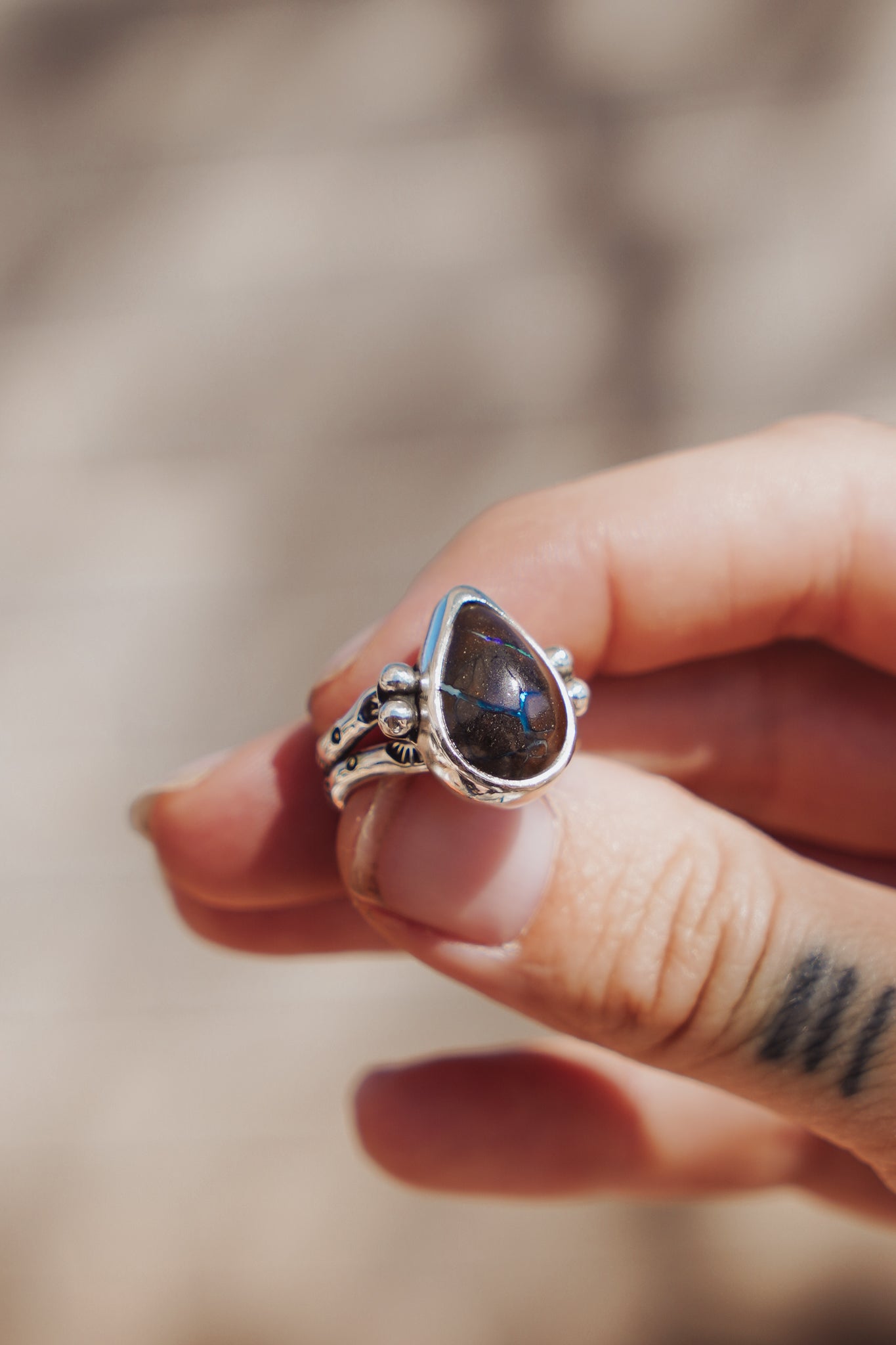 Look at those streaks of rainbow across the dark brown face of this boulder opal stone. The reflective specks remind us of a starry night sky. We love the way this ring turned out with the hand-stamped, split band and this one-of-a-kind stone.