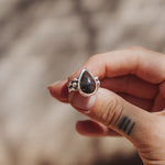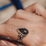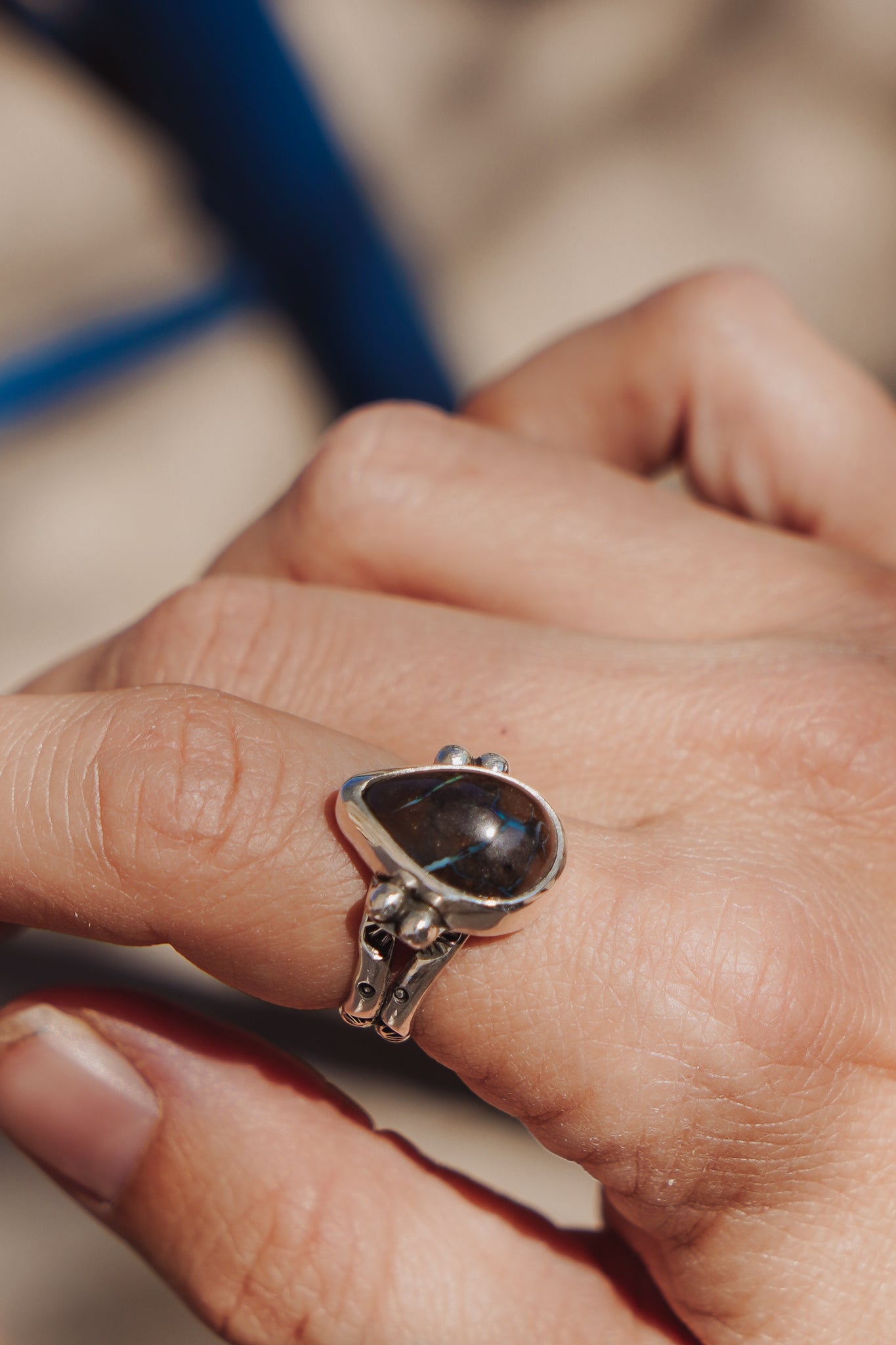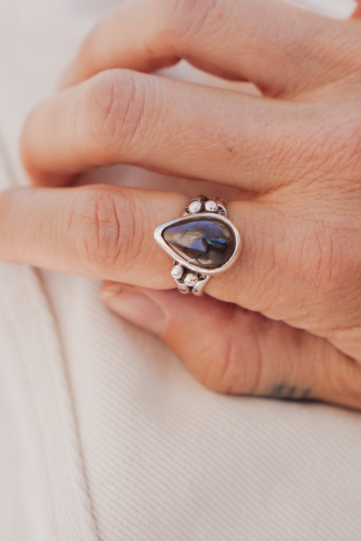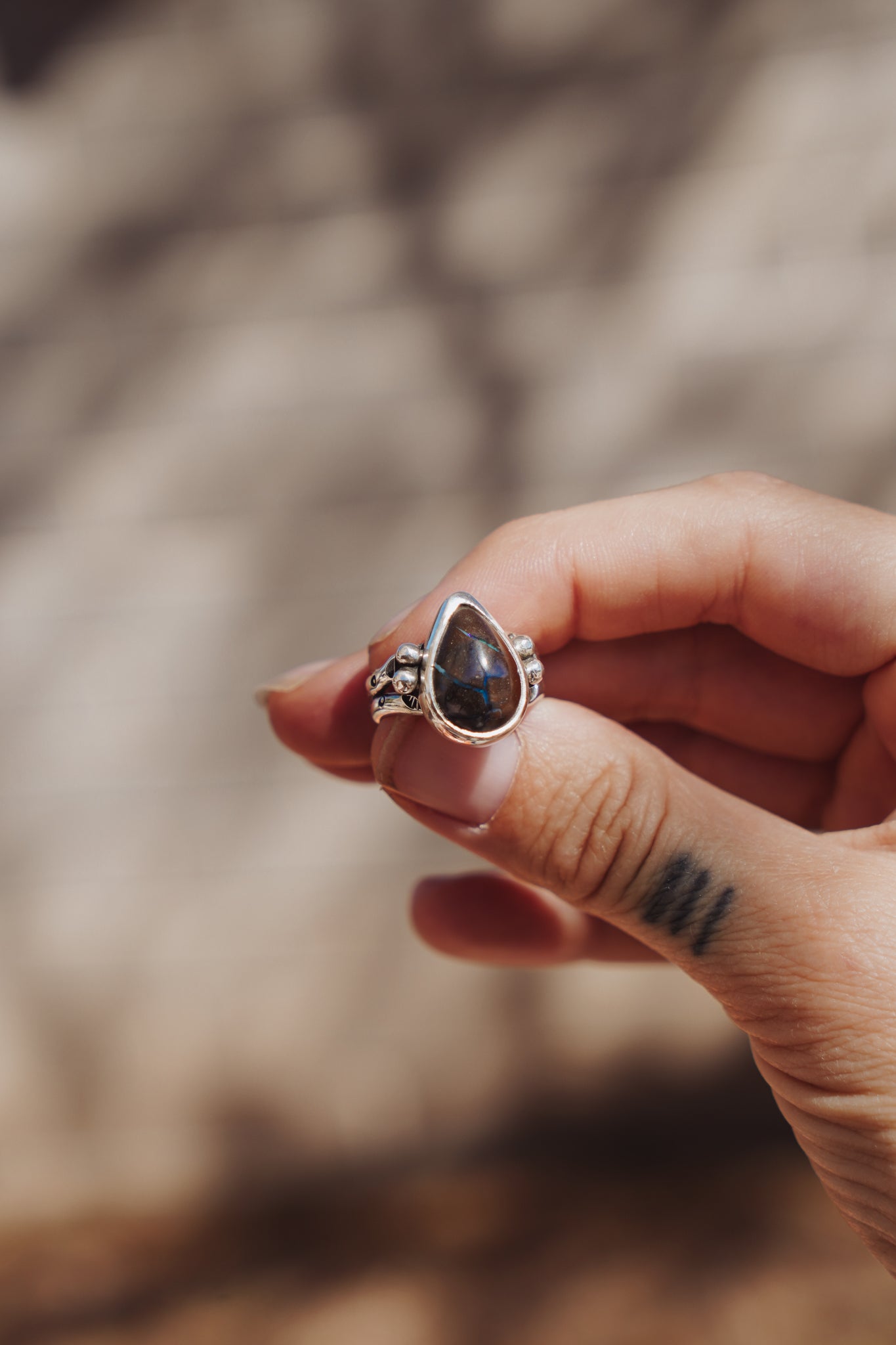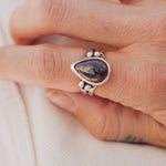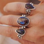 Look at those streaks of rainbow across the dark brown face of this boulder opal stone. The reflective specks remind us of a starry night sky. We love the way this ring turned out with the hand-stamped, split band and this one-of-a-kind stone.
