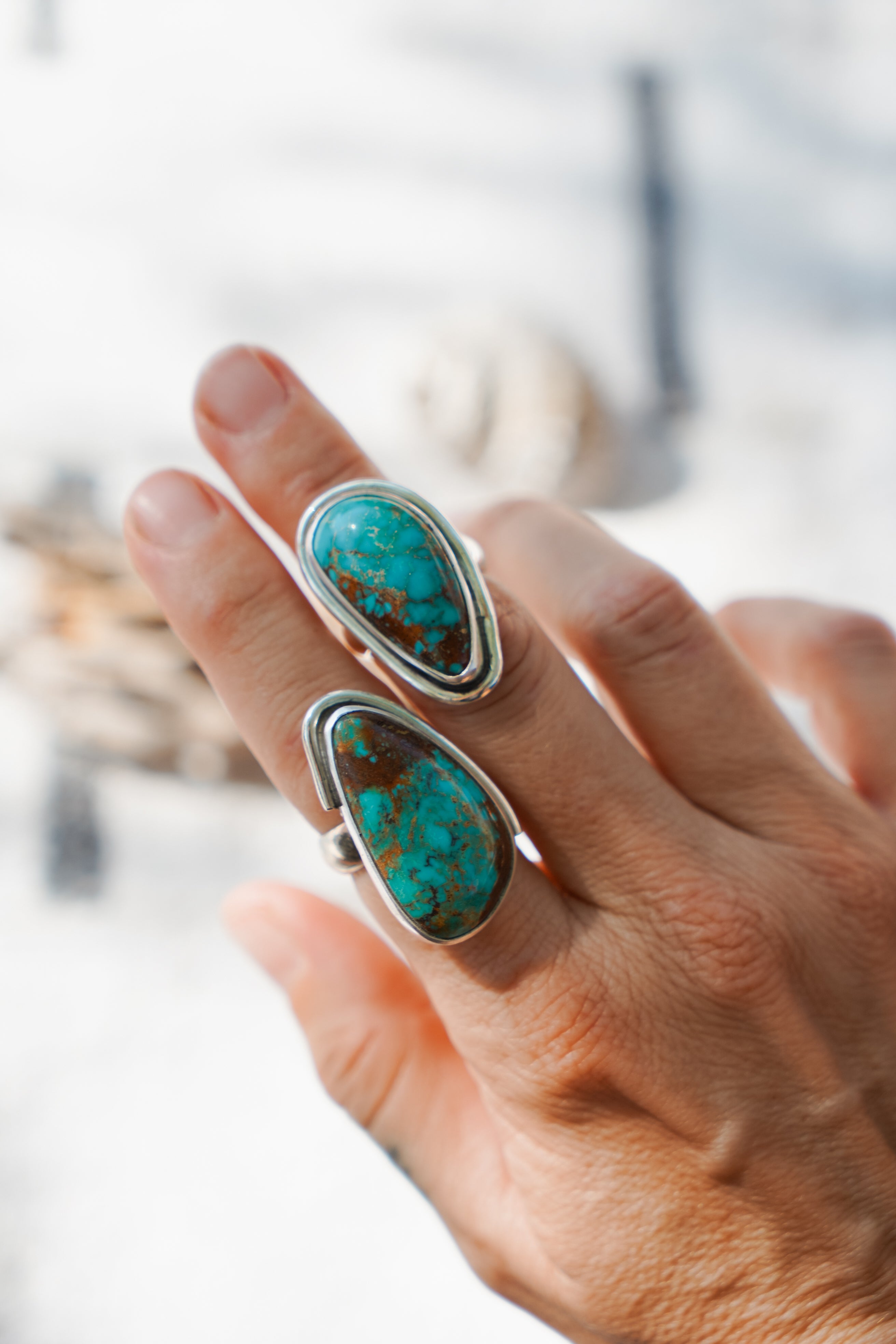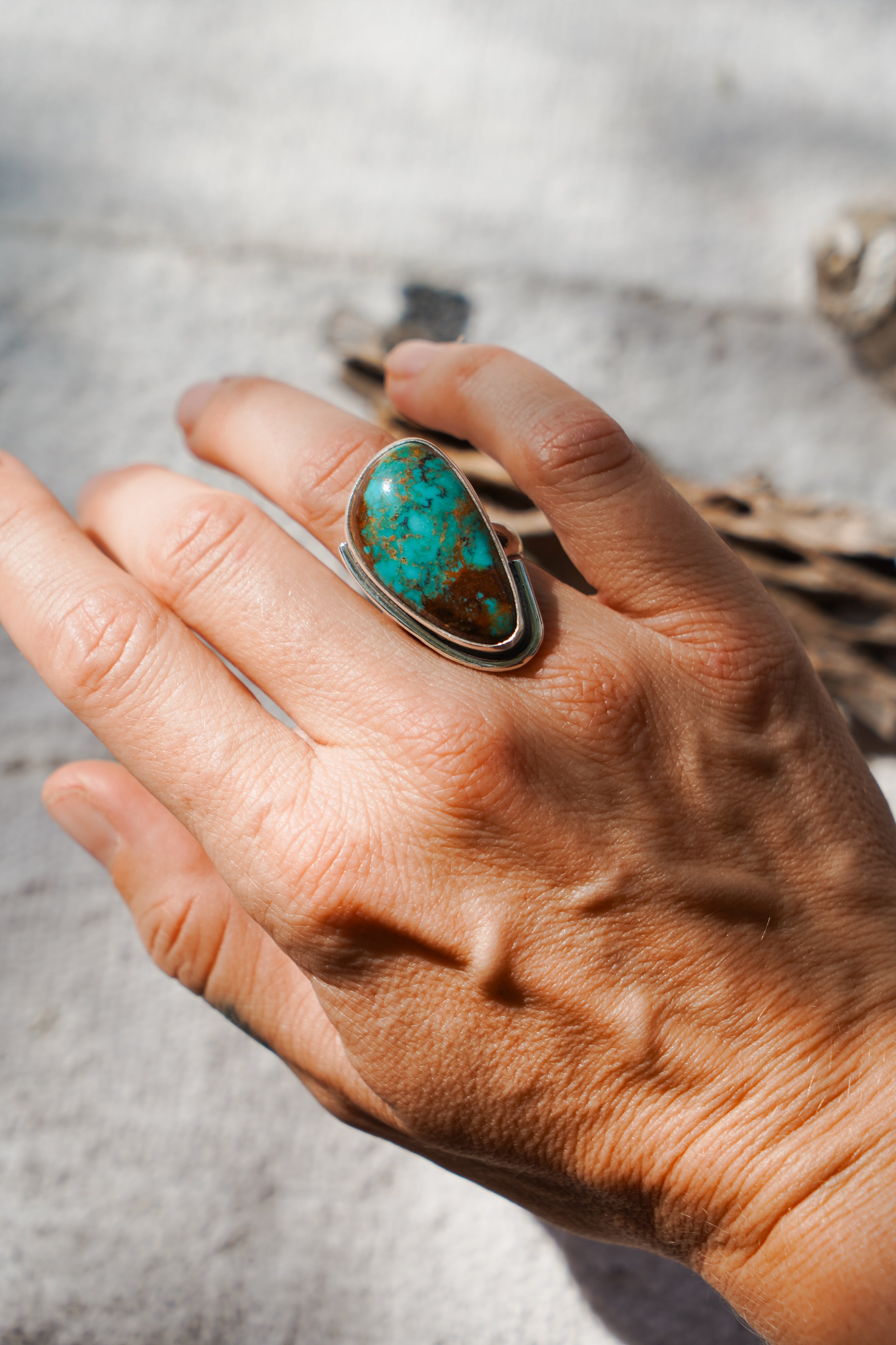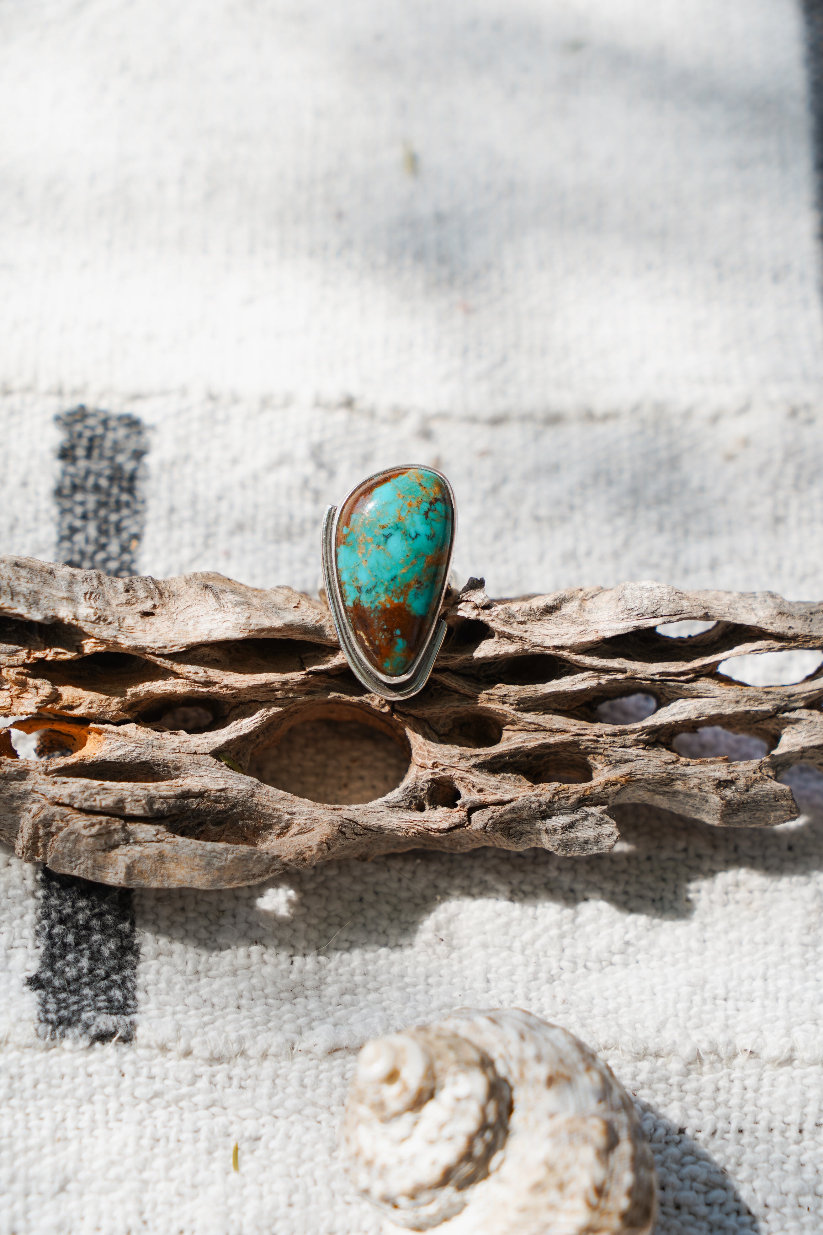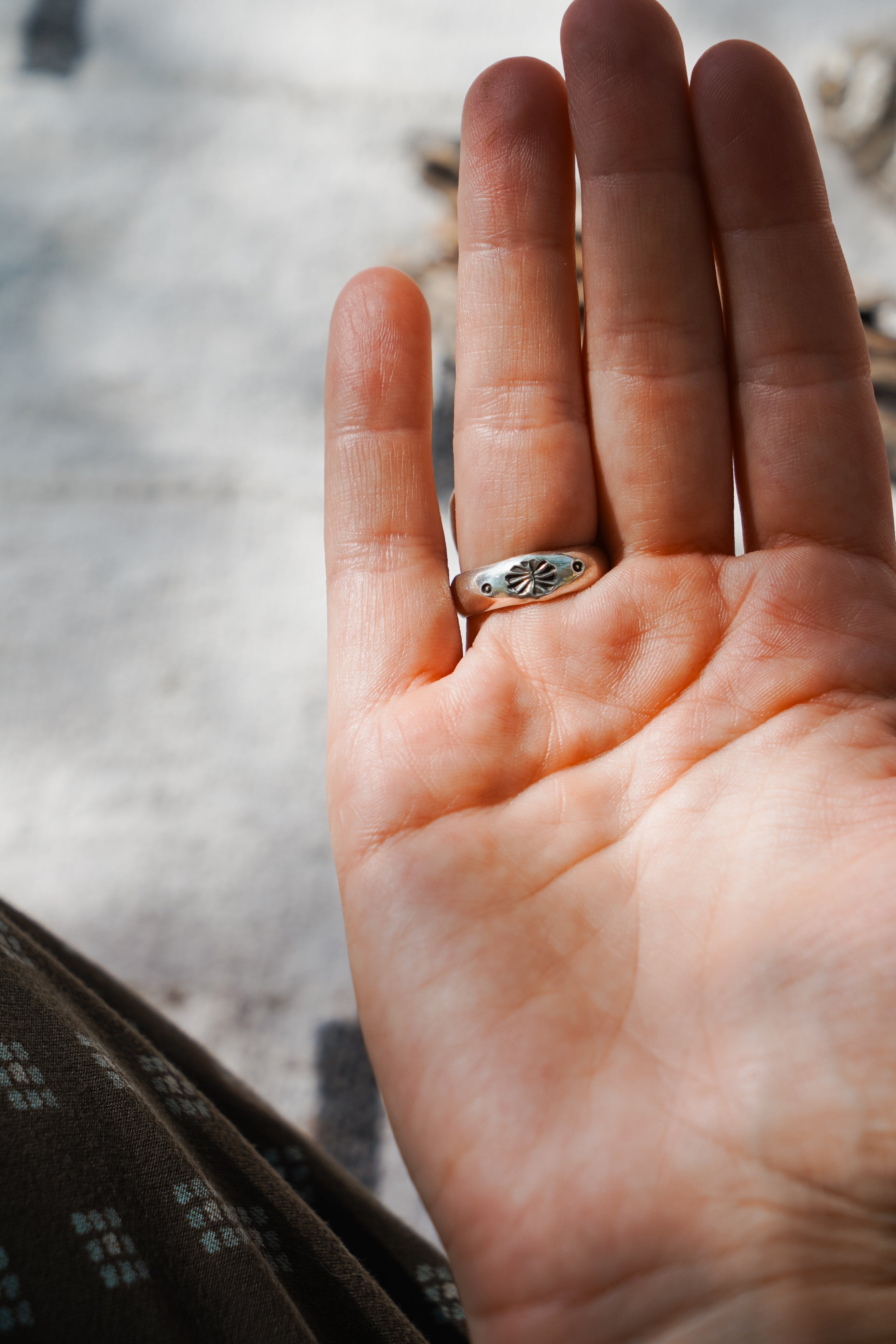 The color and matrix on this juicy piece of turquoise deserved all the attention, so we kept it simple with this partial half-round border. We love the smooth, polished look of the bezel, border, and hand-stamped band.