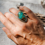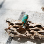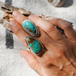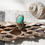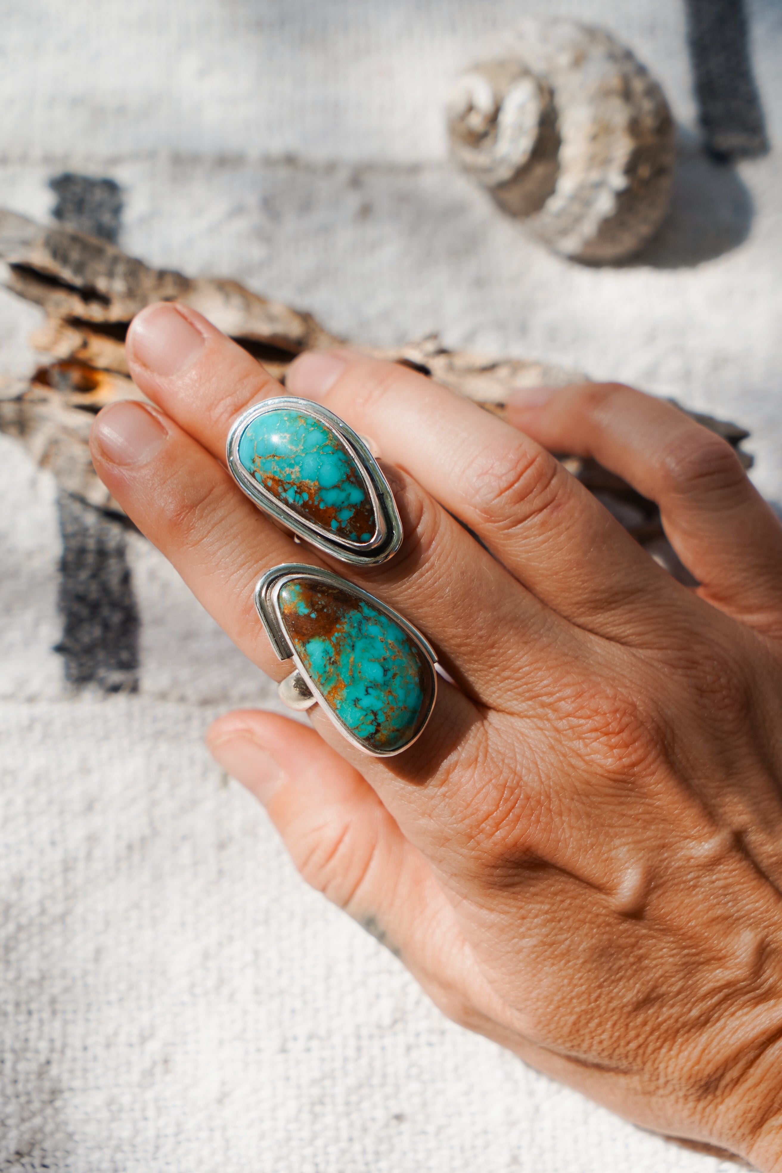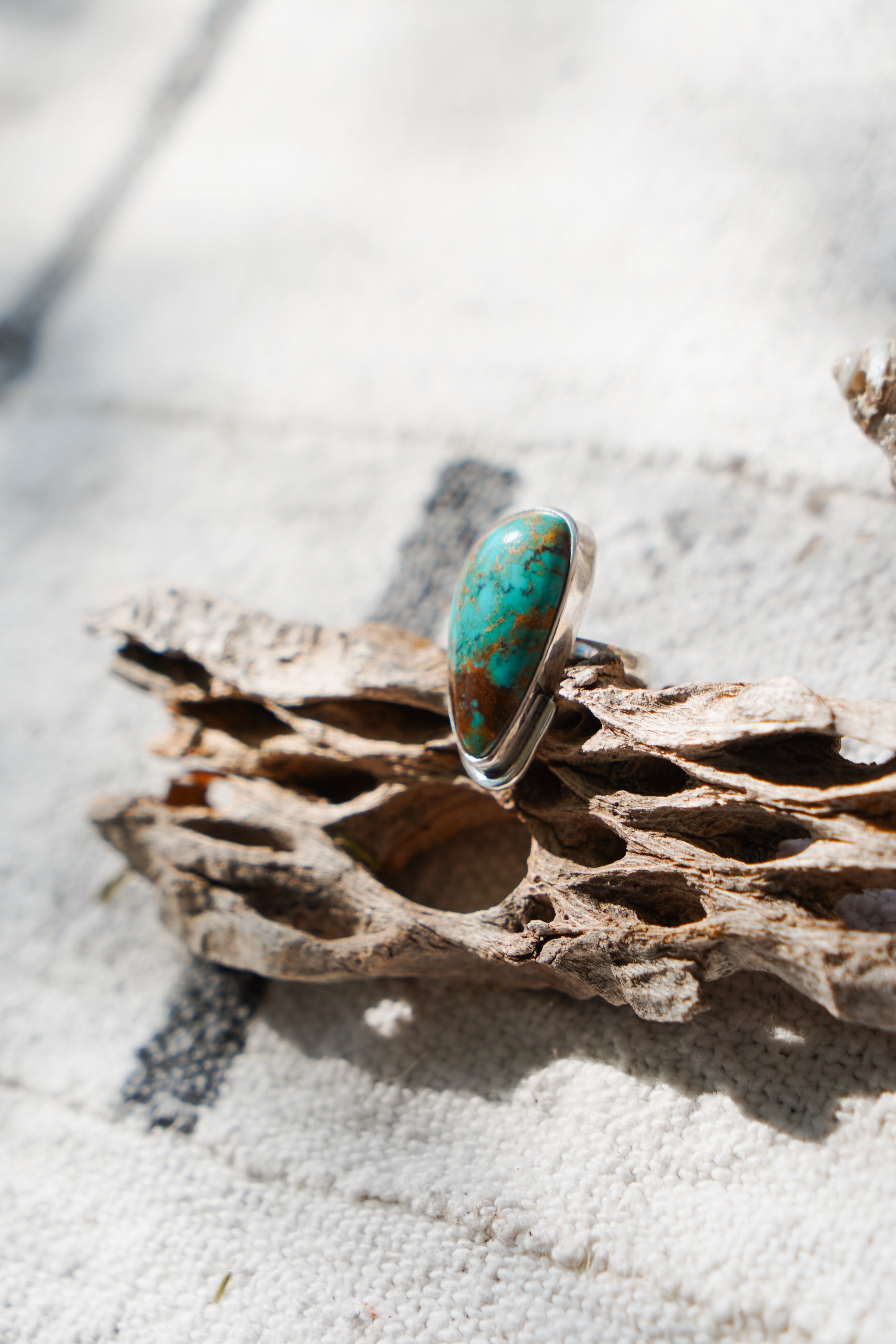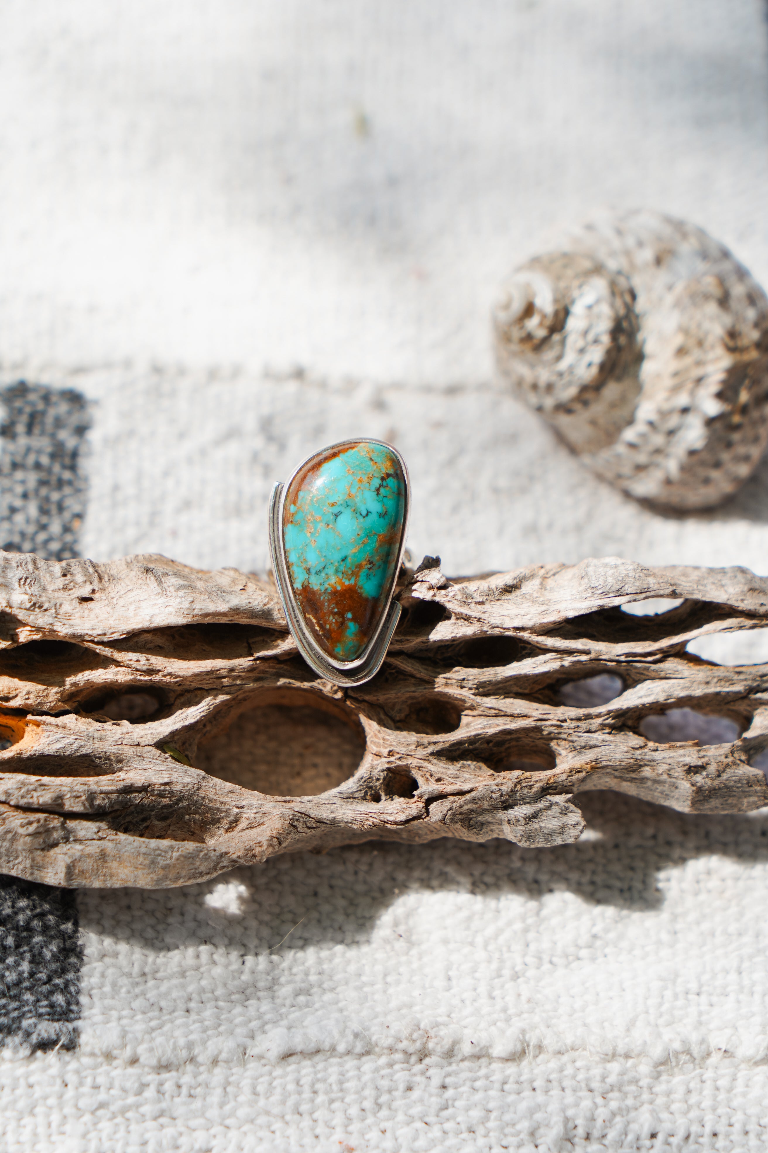 The color and matrix on this juicy piece of turquoise deserved all the attention, so we kept it simple with this partial half-round border. We love the smooth, polished look of the bezel, border, and hand-stamped band.