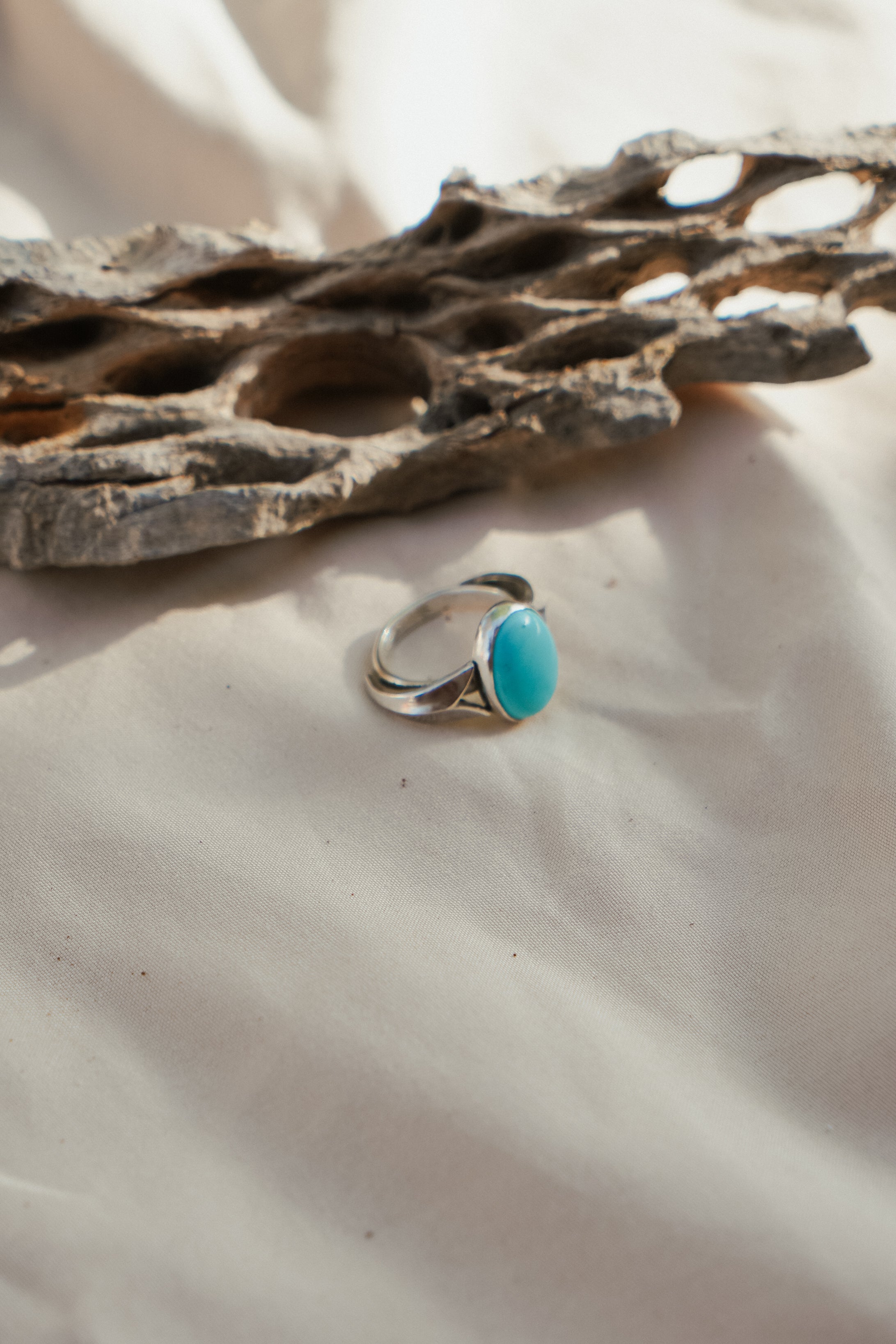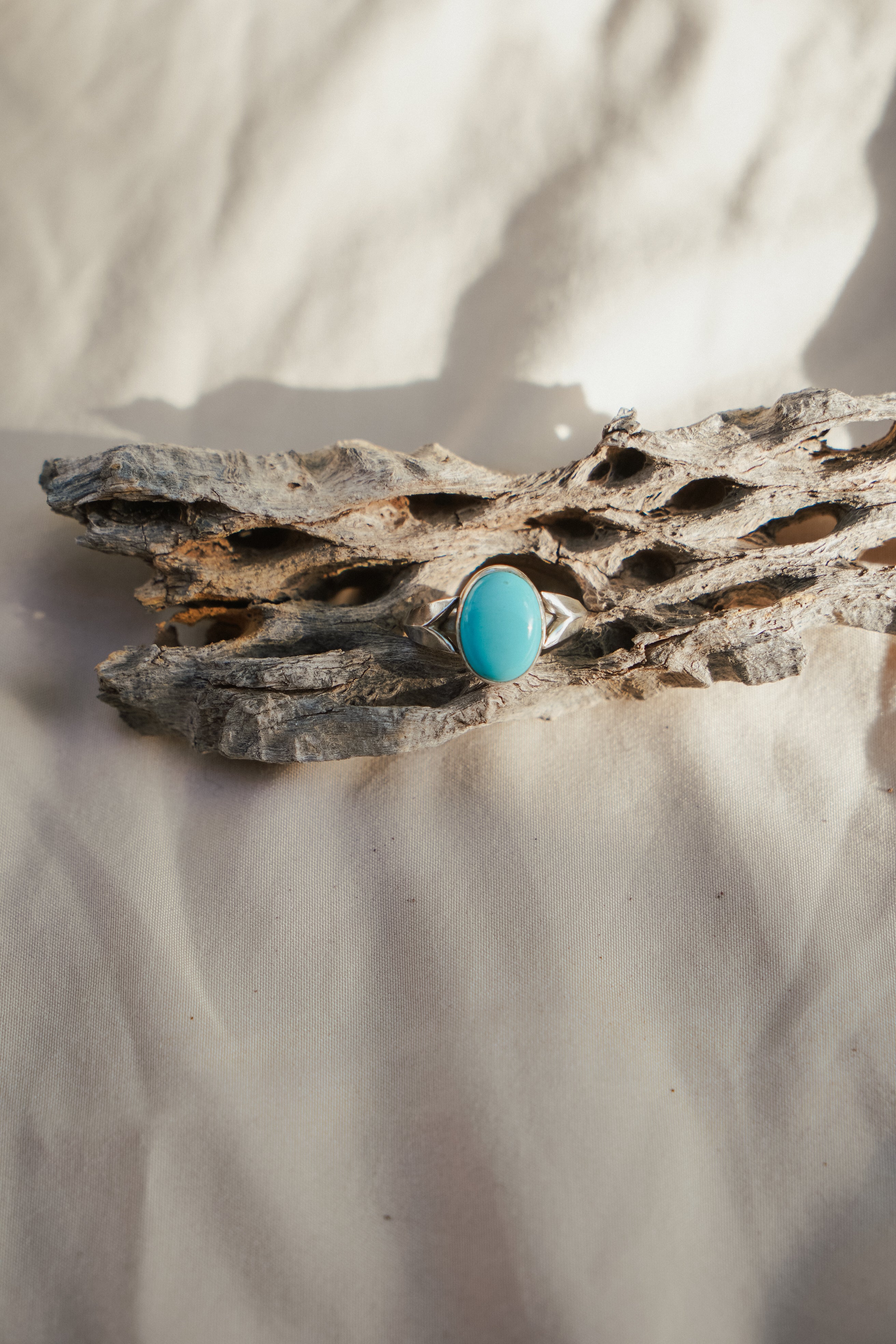 We've had so much fun experimenting with new design elements in our pieces these past few months and we're so excited about how the arrow elements turned out on the side of this ring band. The polished sterling silver with this incredible soft light blue Campitos stone make for a beautiful design.