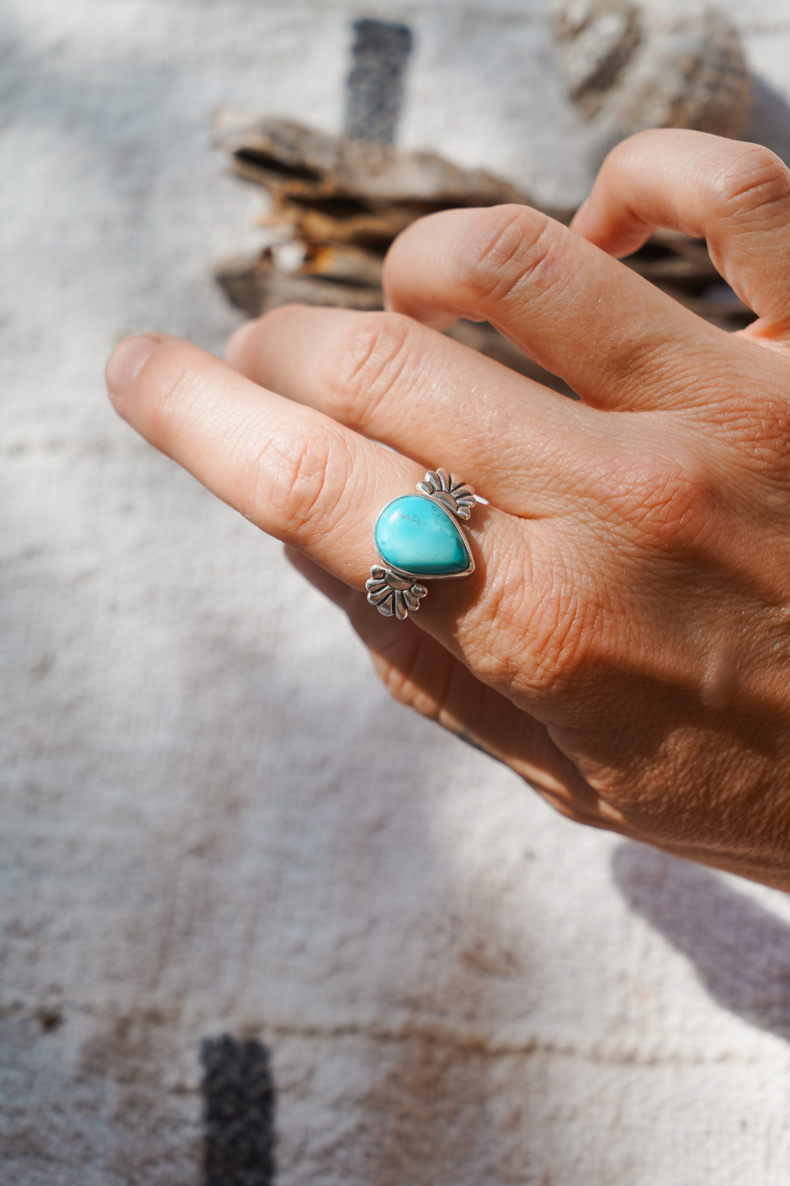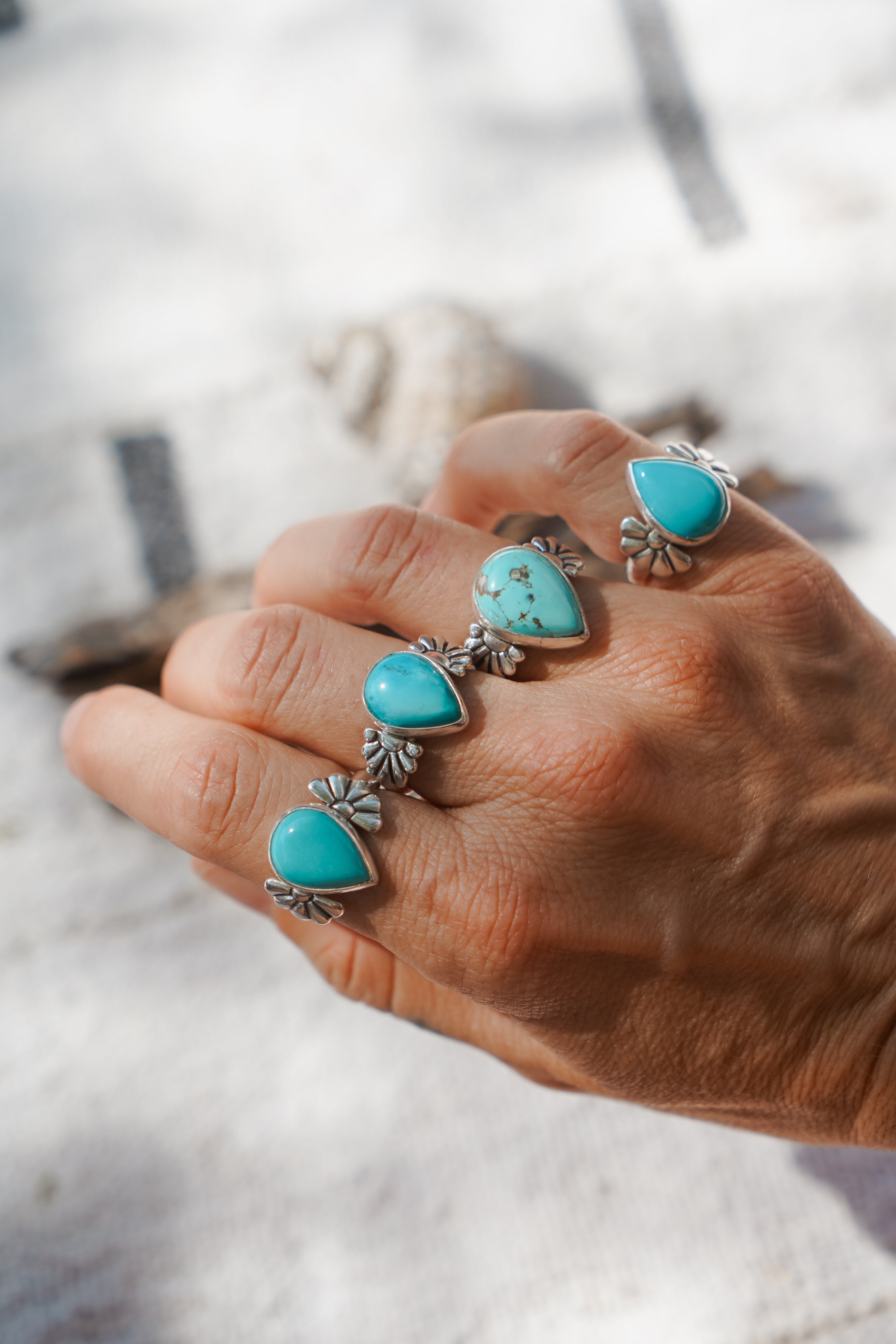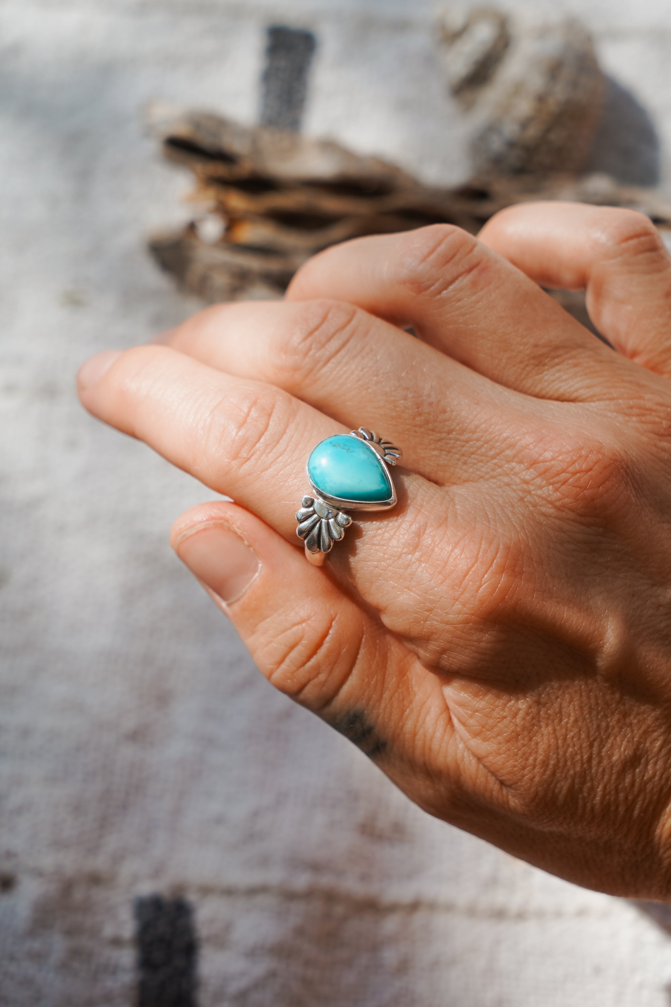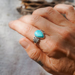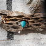 Check this beauty out! We love the smooth, light blue of this turquoise and the decorative ring band. We loved making these and can't wait to see who ends up with them.