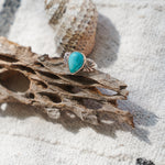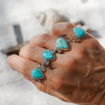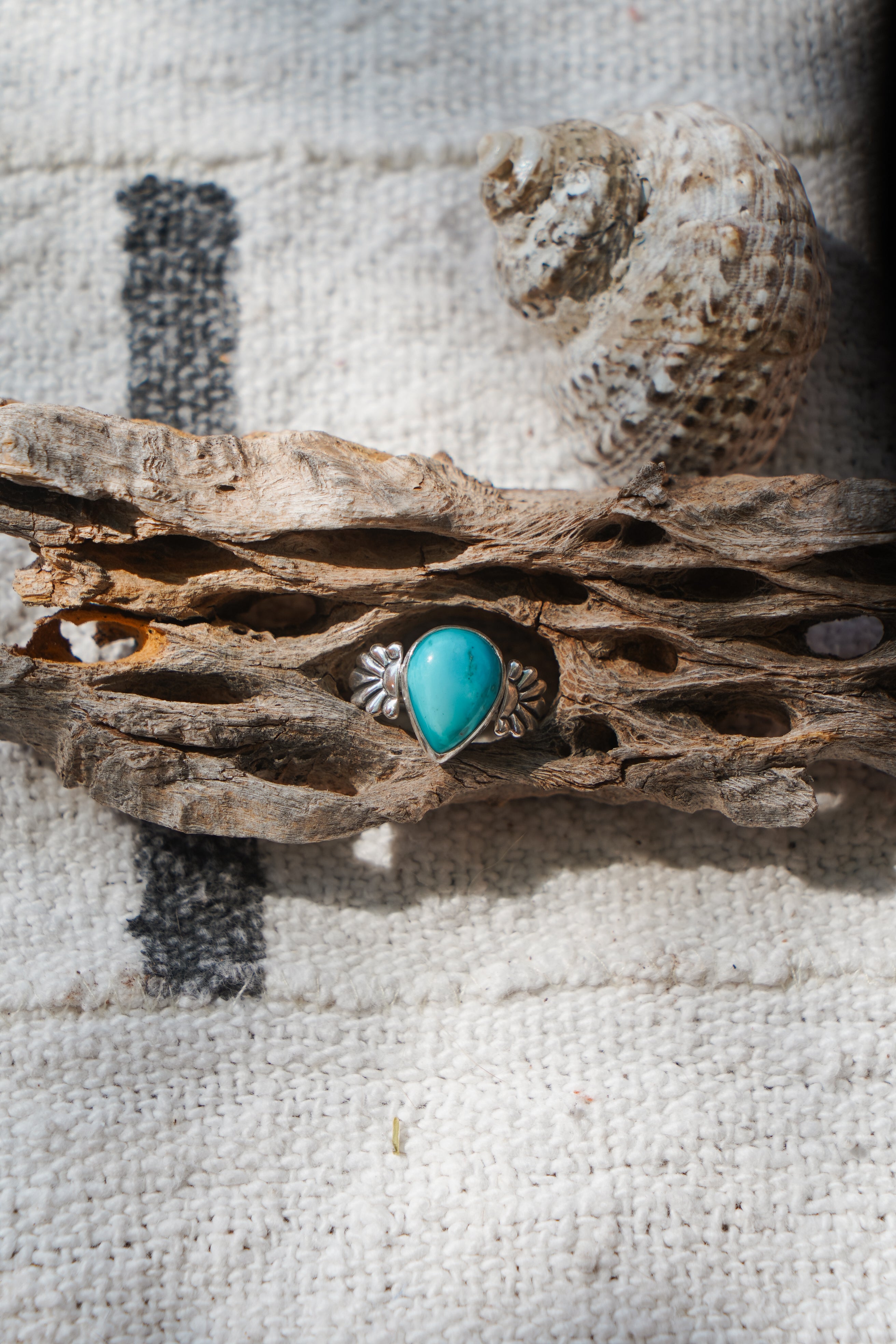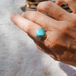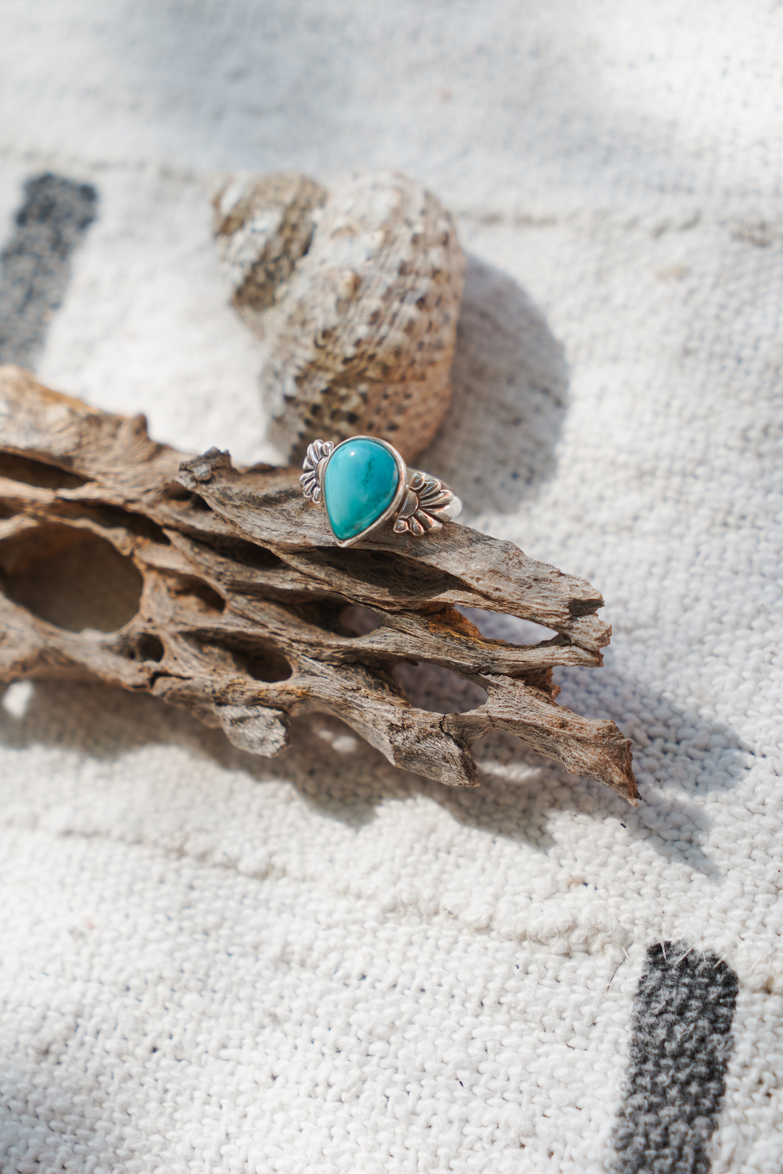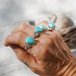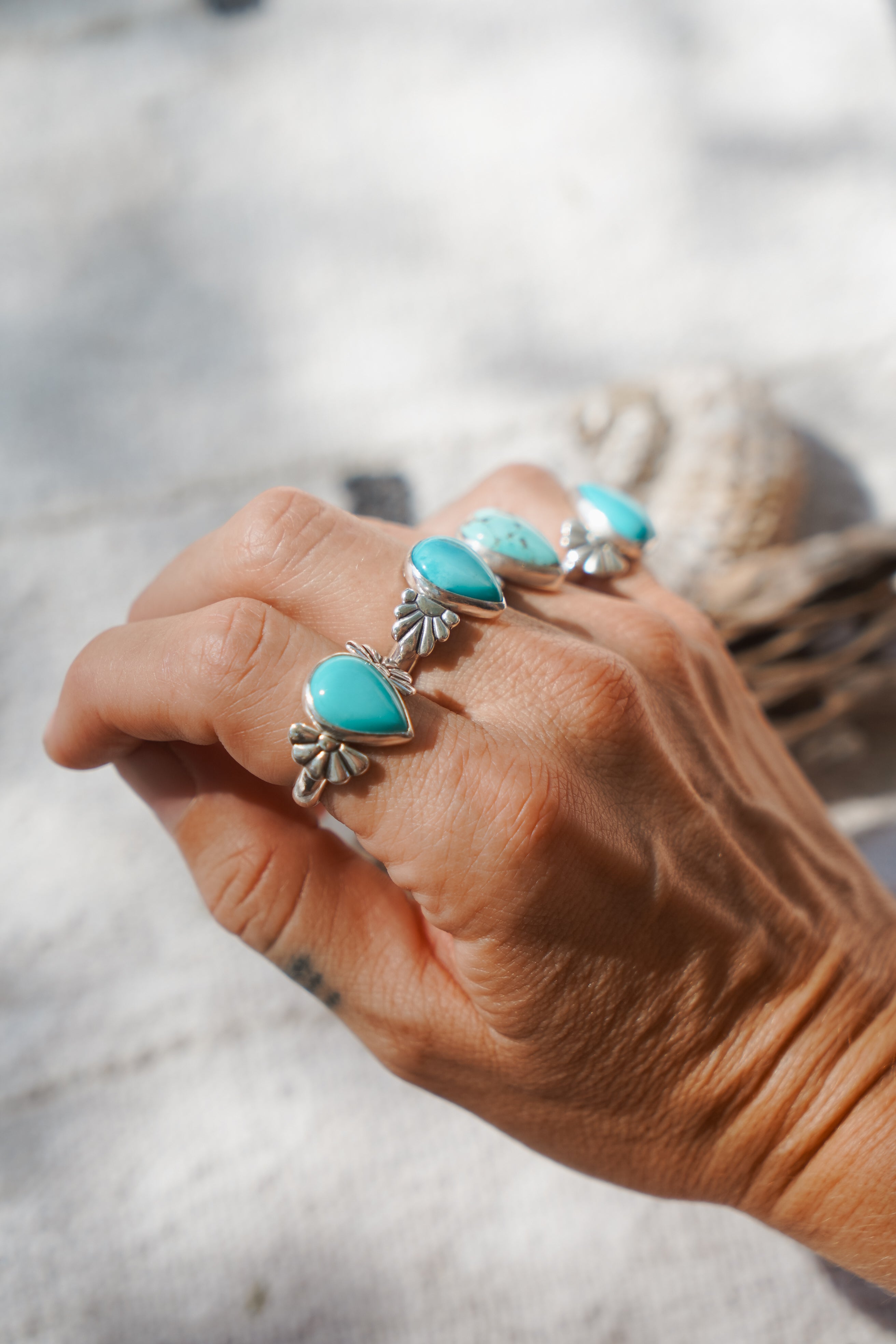 Check this beauty out! We love the smooth, light blue of this turquoise and the decorative ring band. We loved making these and can't wait to see who ends up with them.