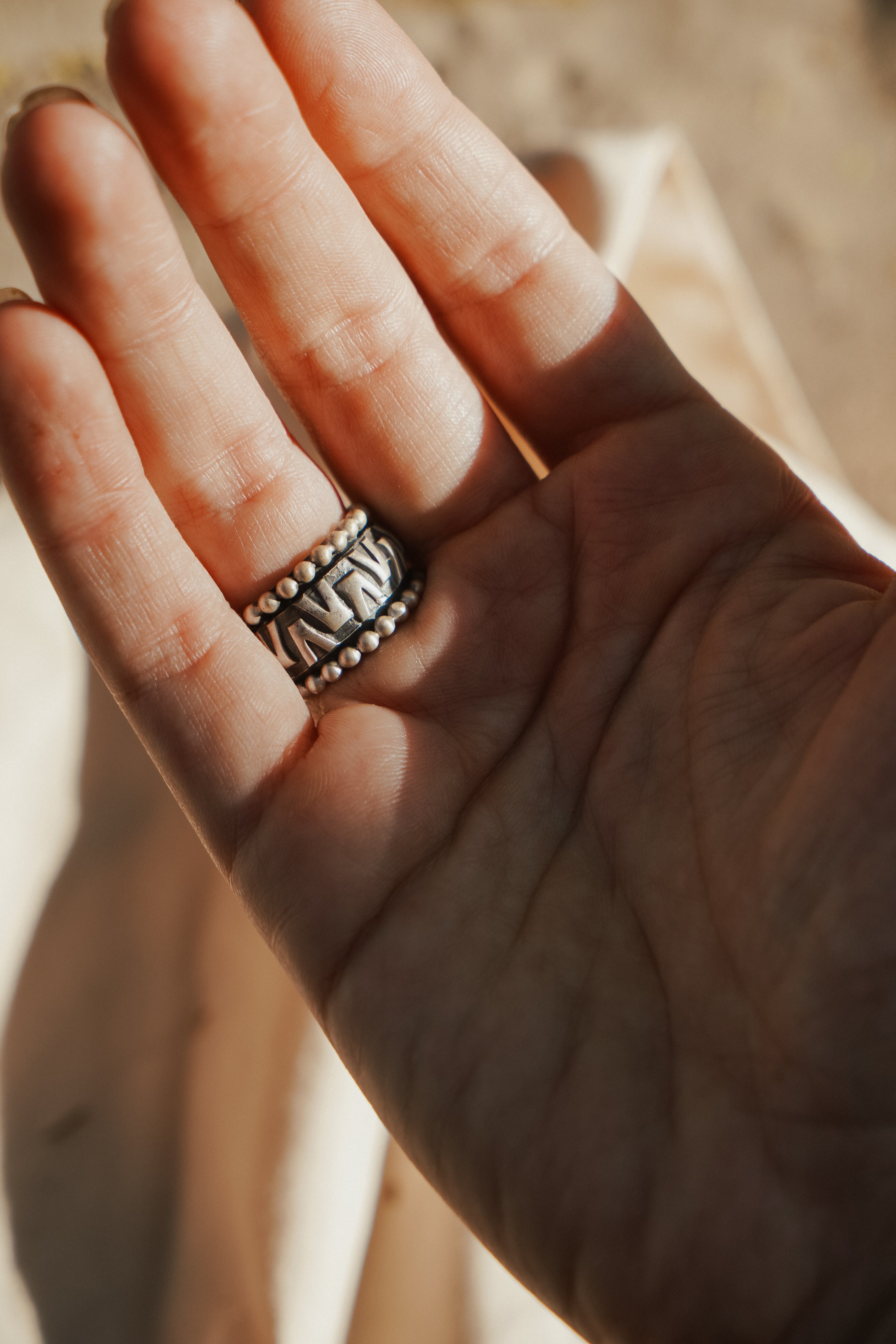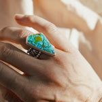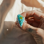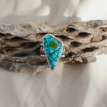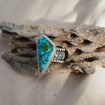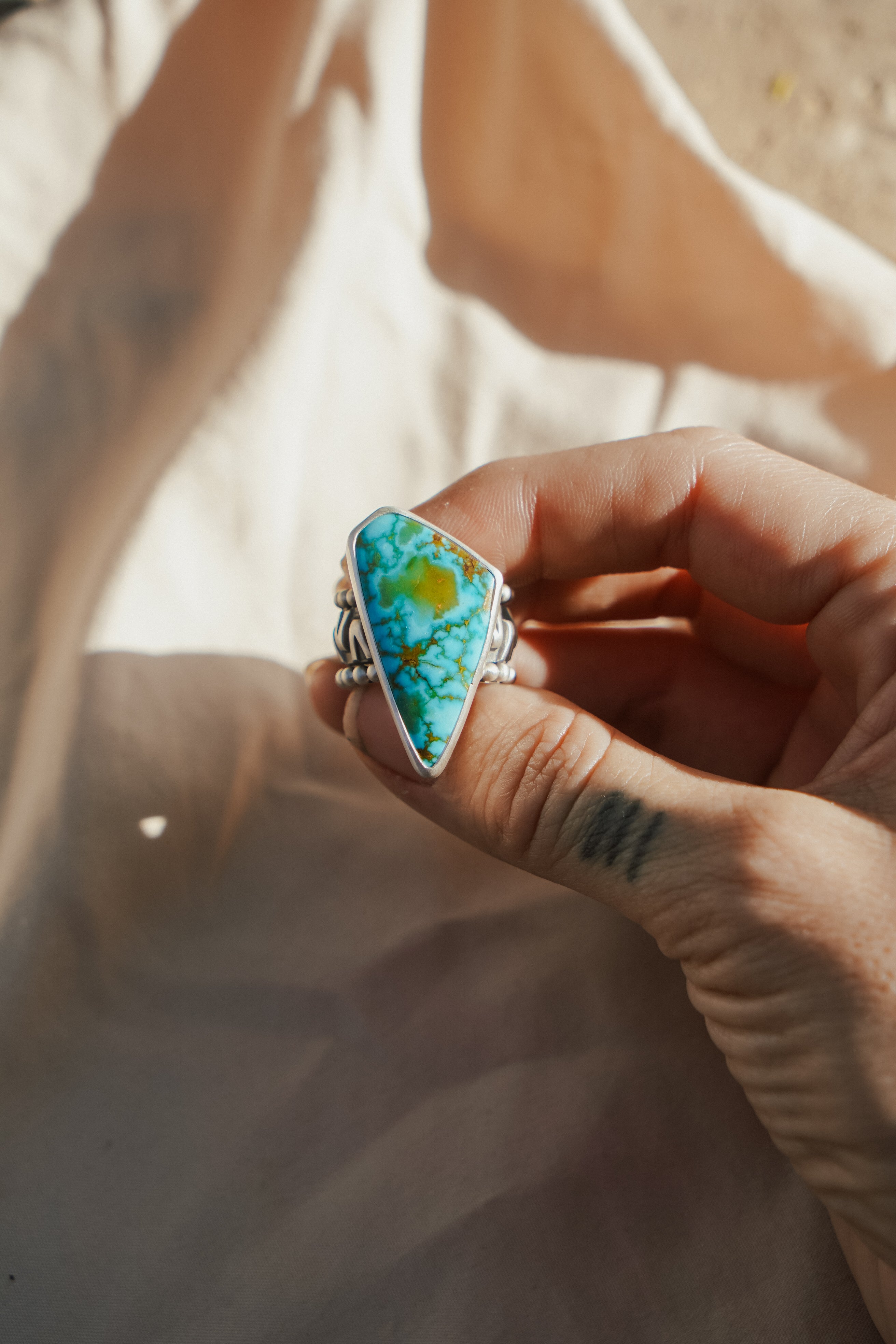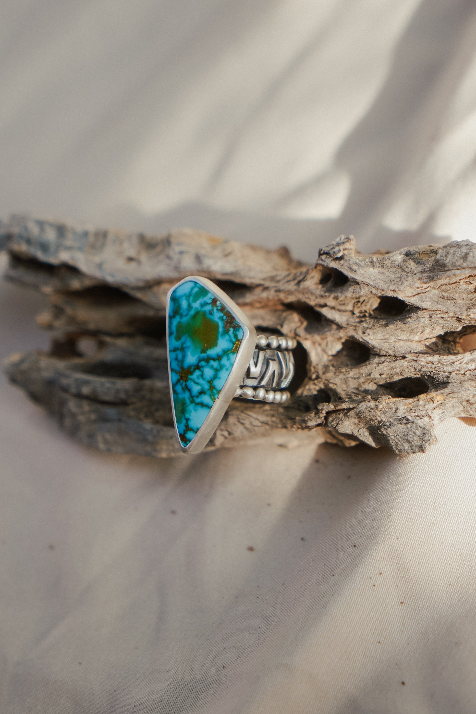This high-grade piece of Kingman Turquoise is from our favorite lapidary artist here in Tucson that we've been saving for a special piece. I mean the color, matrix, and shape of this stone are unreal. We gave it a special new band design that turned out better than we could have hoped. The matte finish is the chef's kiss.