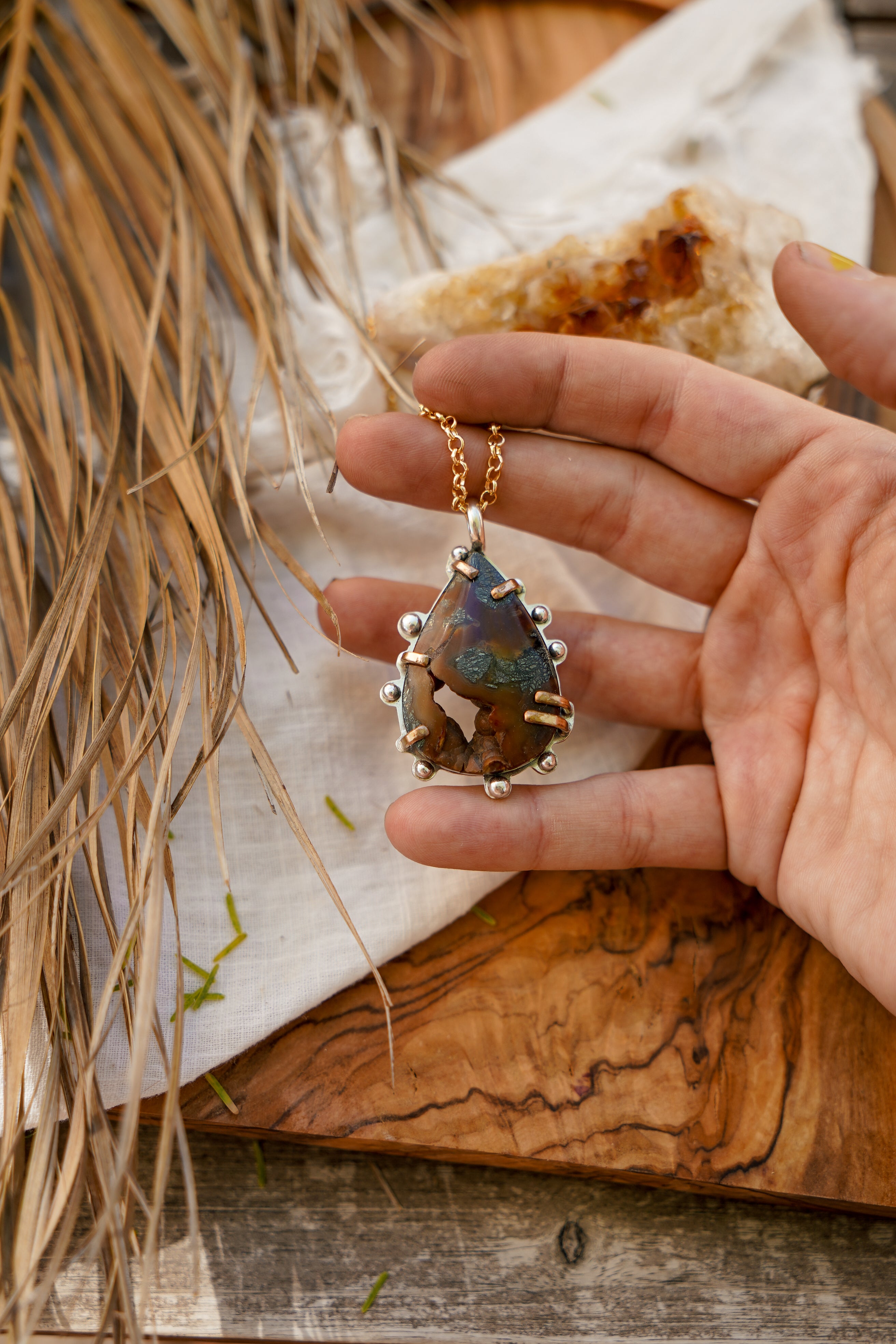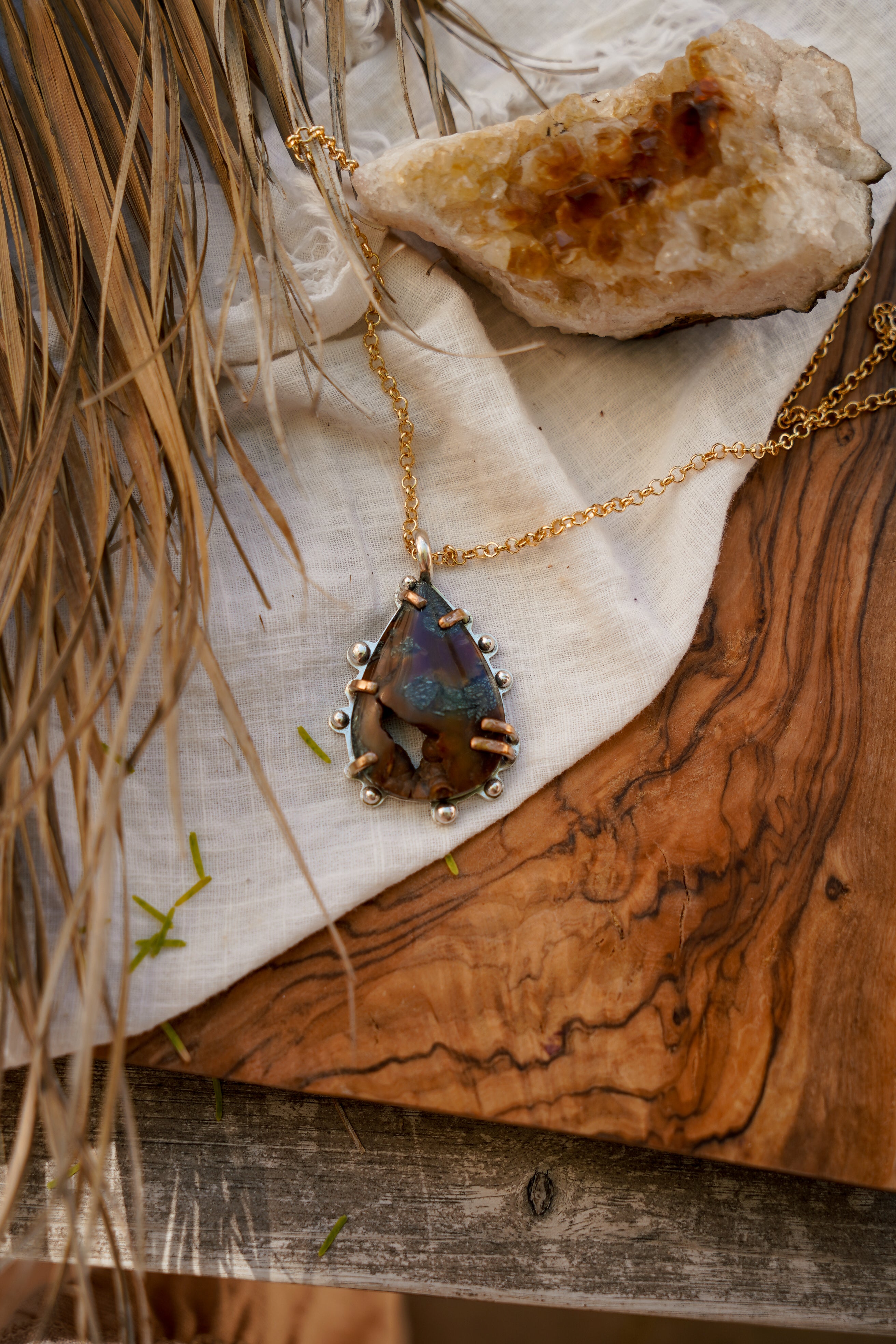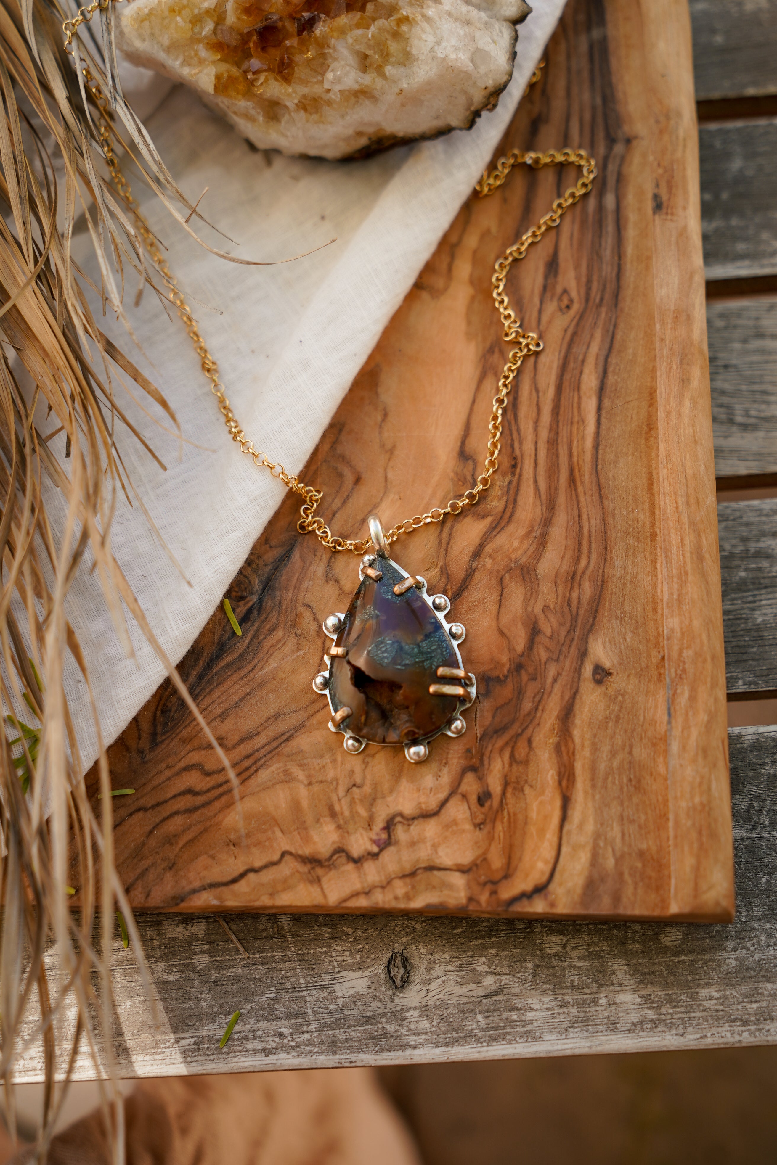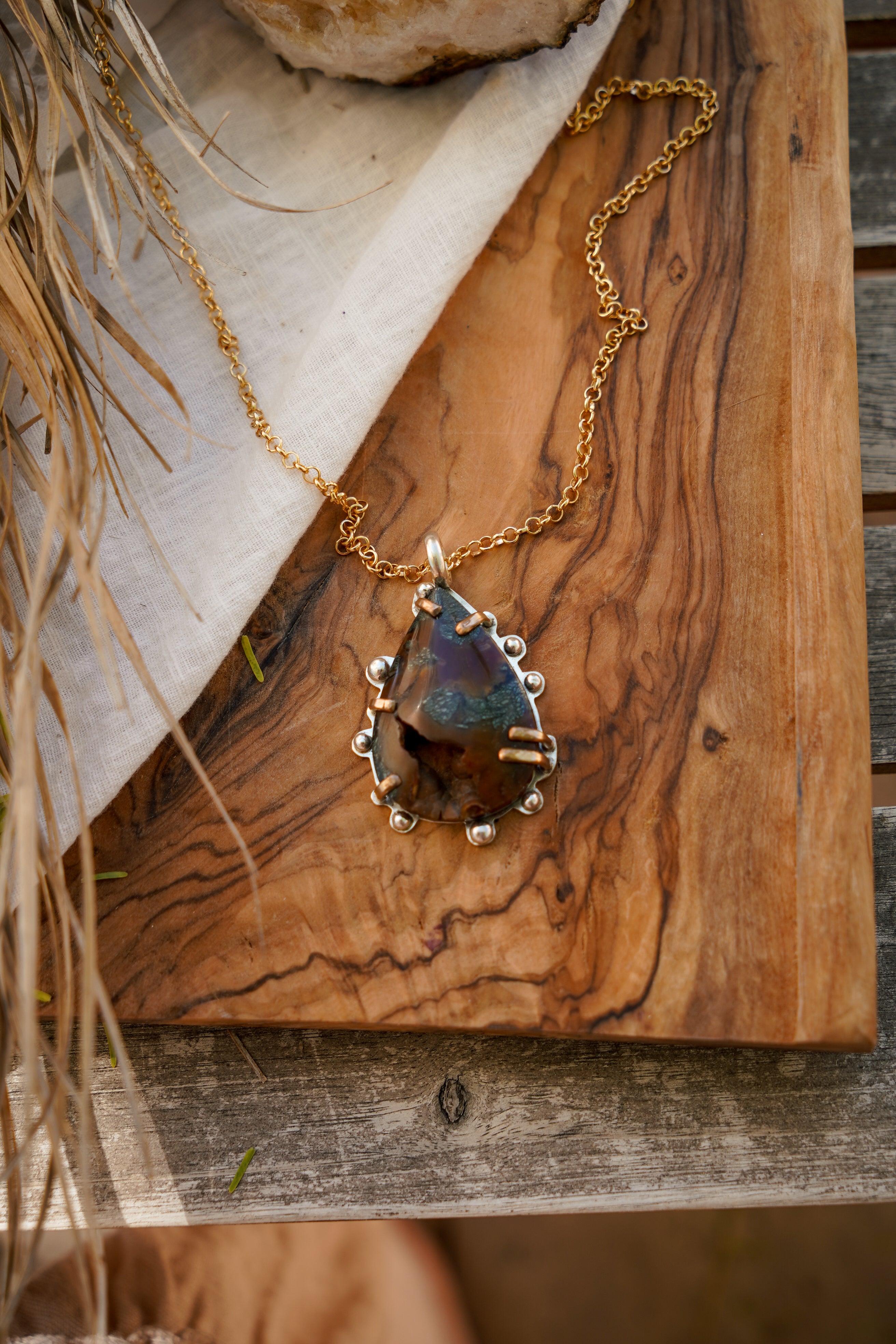 When we found these beautiful stones at the recent gem show, we knew we wanted to do a sawed out backplate design so you could see through the hole in the stone. We love the effect this created. The way the gold-fill prongs stand out against the dark colors in the stone make this pendant really pop!