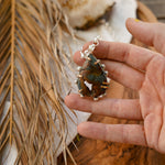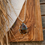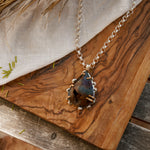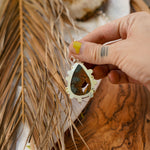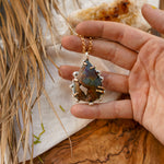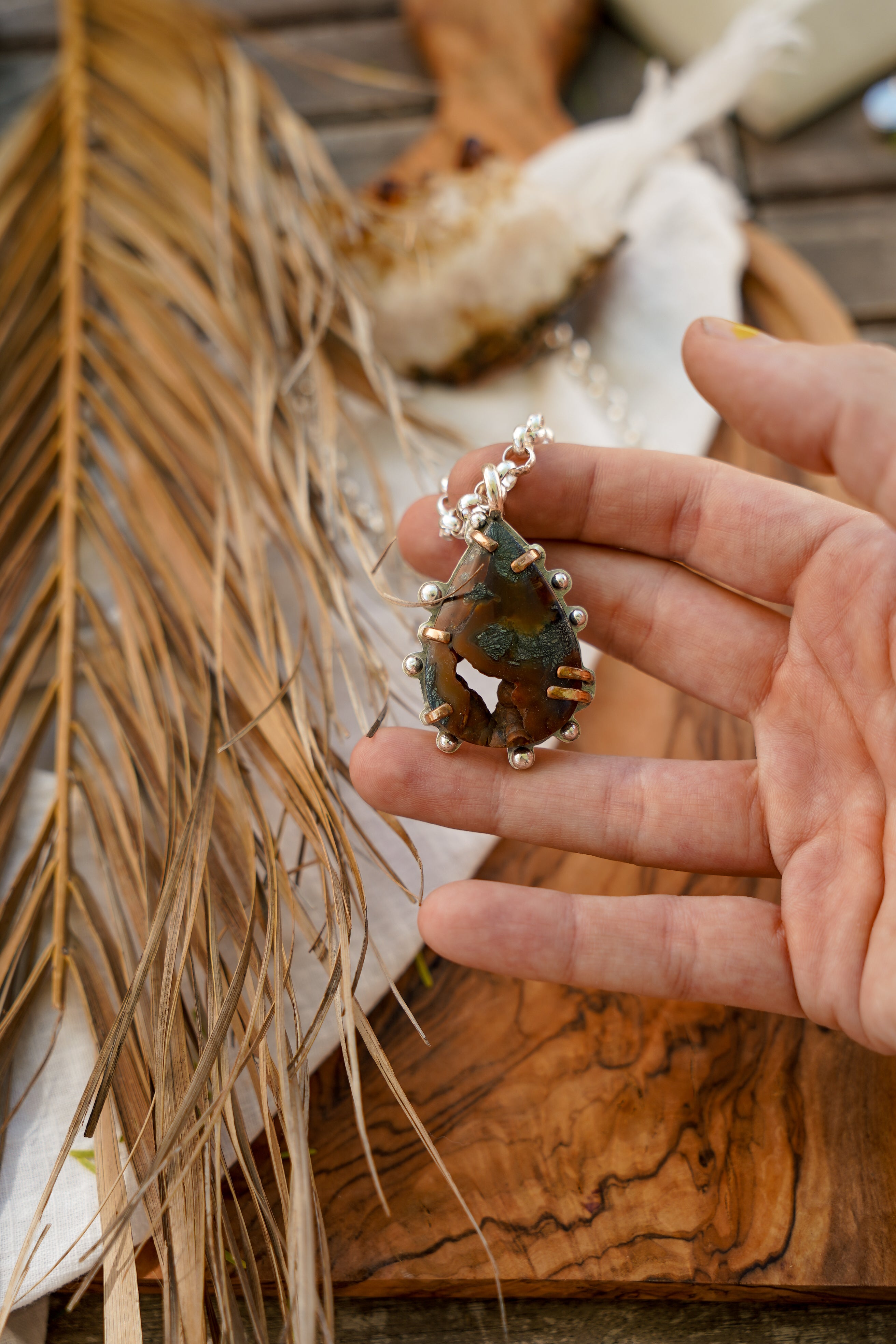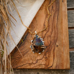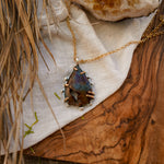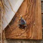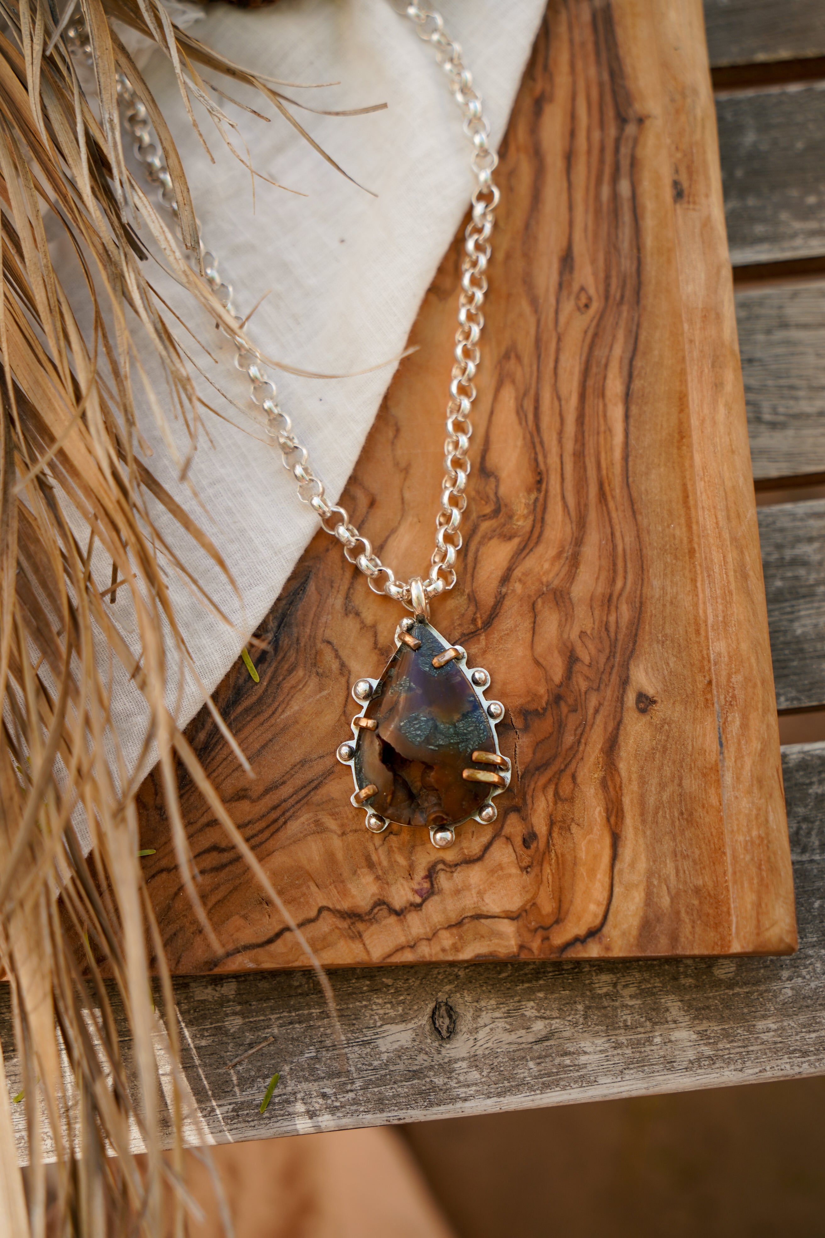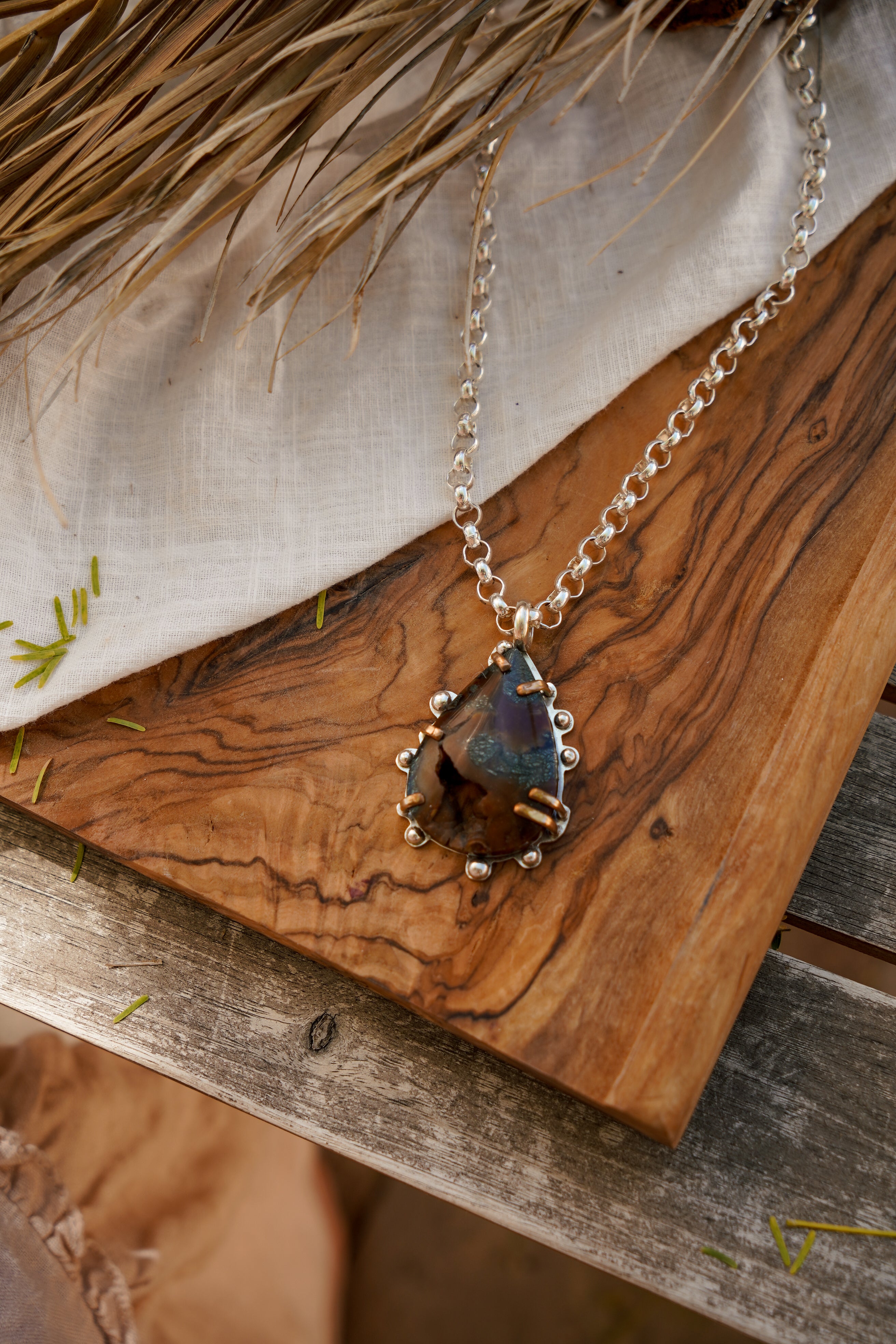 When we found these beautiful stones at the recent gem show, we knew we wanted to do a sawed out backplate design so you could see through the hole in the stone. We love the effect this created. The way the gold-fill prongs stand out against the dark colors in the stone make this pendant really pop!