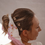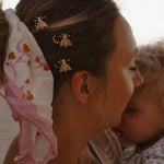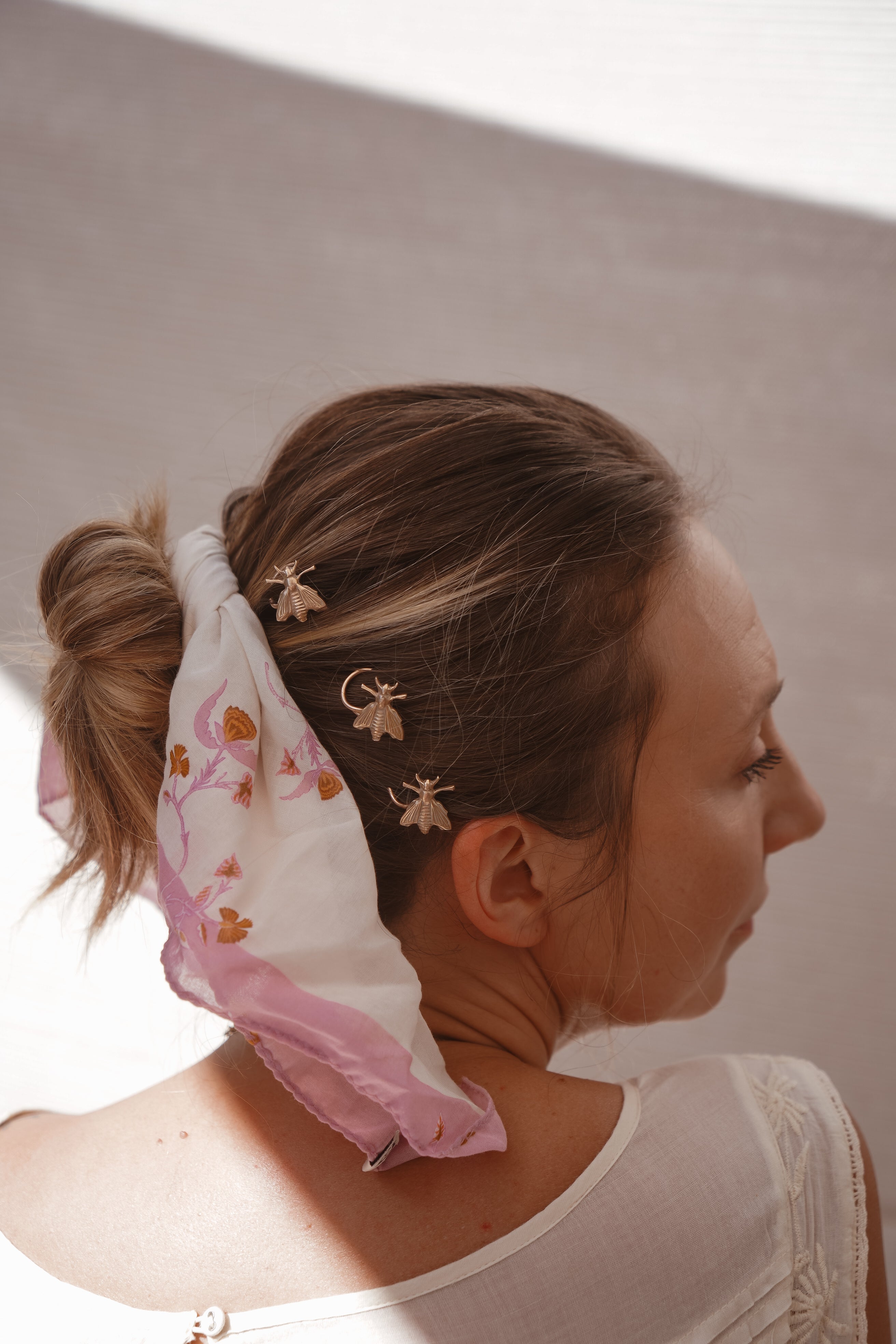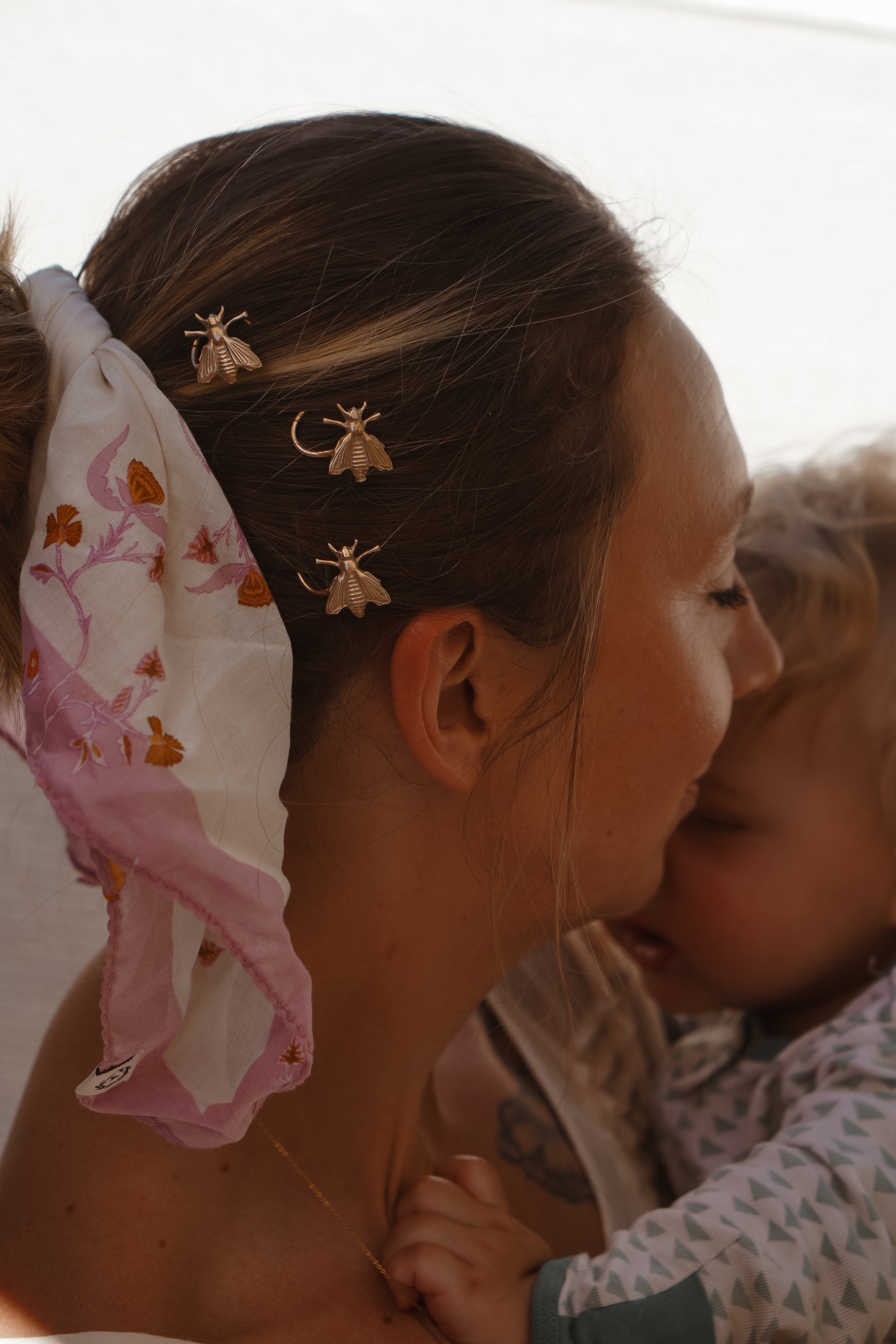 Bronze bee hair twists designed to add a playful, boho touch to your hairstyle. Inspired by the sun-drenched mornings, these little companions tuck seamlessly into brains, buns, or whatever else you come up with for an effortless statement.