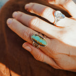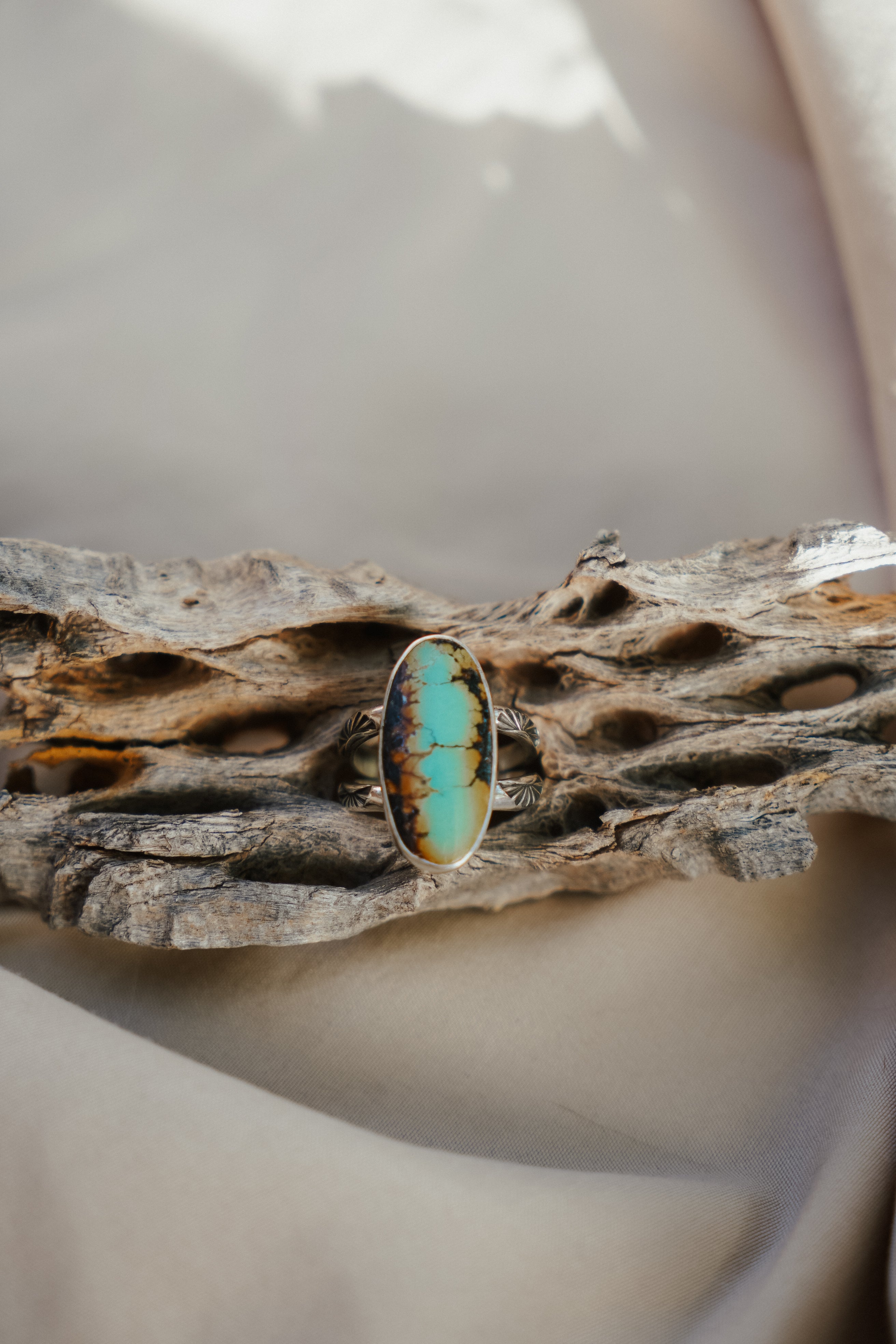 The Hubei Turquoise ring features a distinctive double ring band with stamped detailing, accentuating the natural beauty of the turquoise stone. Highlighting the vibrant hues and unique patterns of the turquoise, this ring blends timeless style with artisanal quality. For those appreciating refined design and authentic materials.