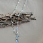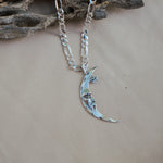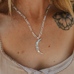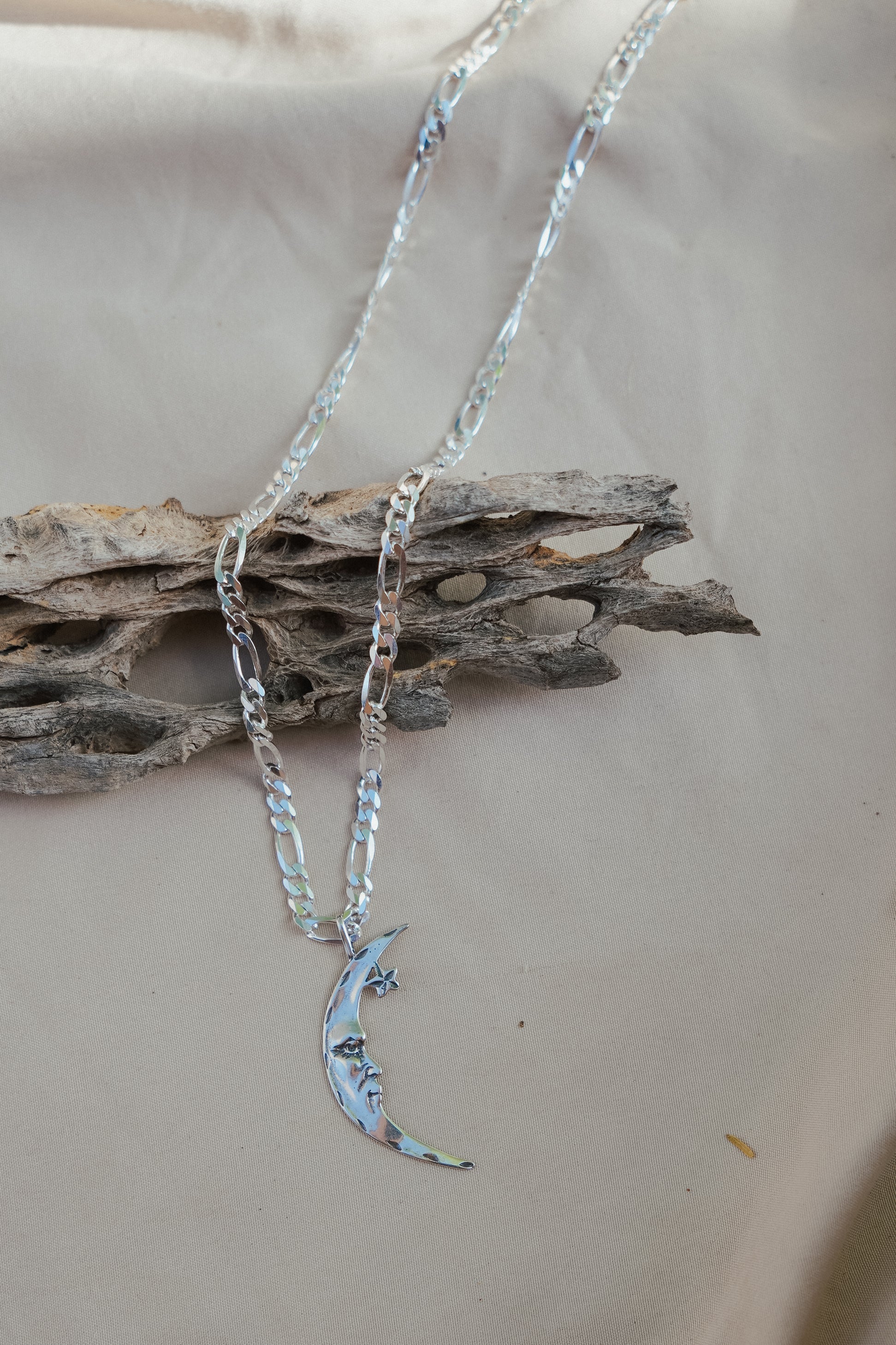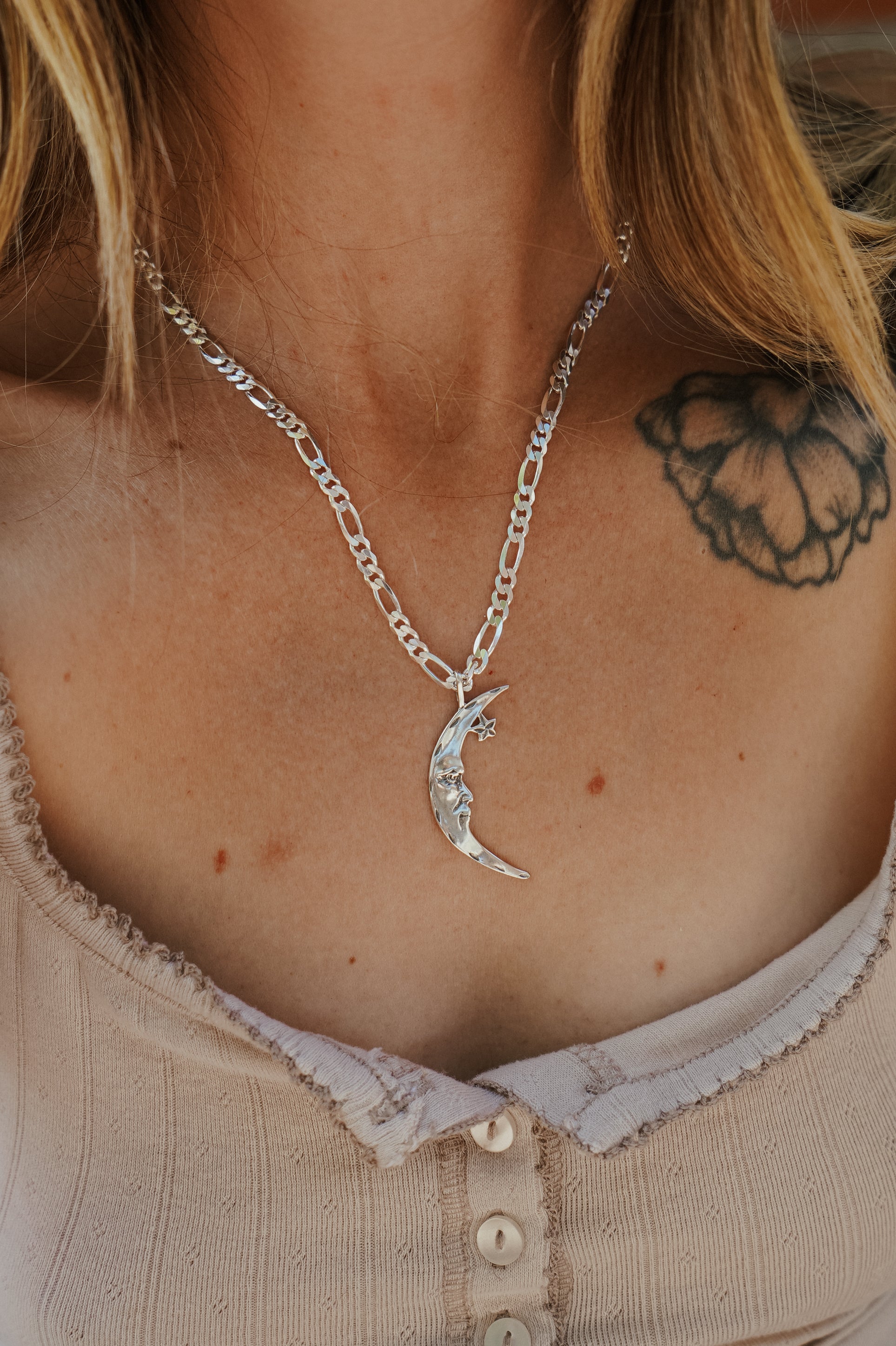 The Lunara Necklace features a playful sterling silver crescent moon centerpiece suspended on a chunky Figaro chain. This lovely design adds a whimsical touch to any outfit, perfect for wearing alone or layering with your favorite pieces.