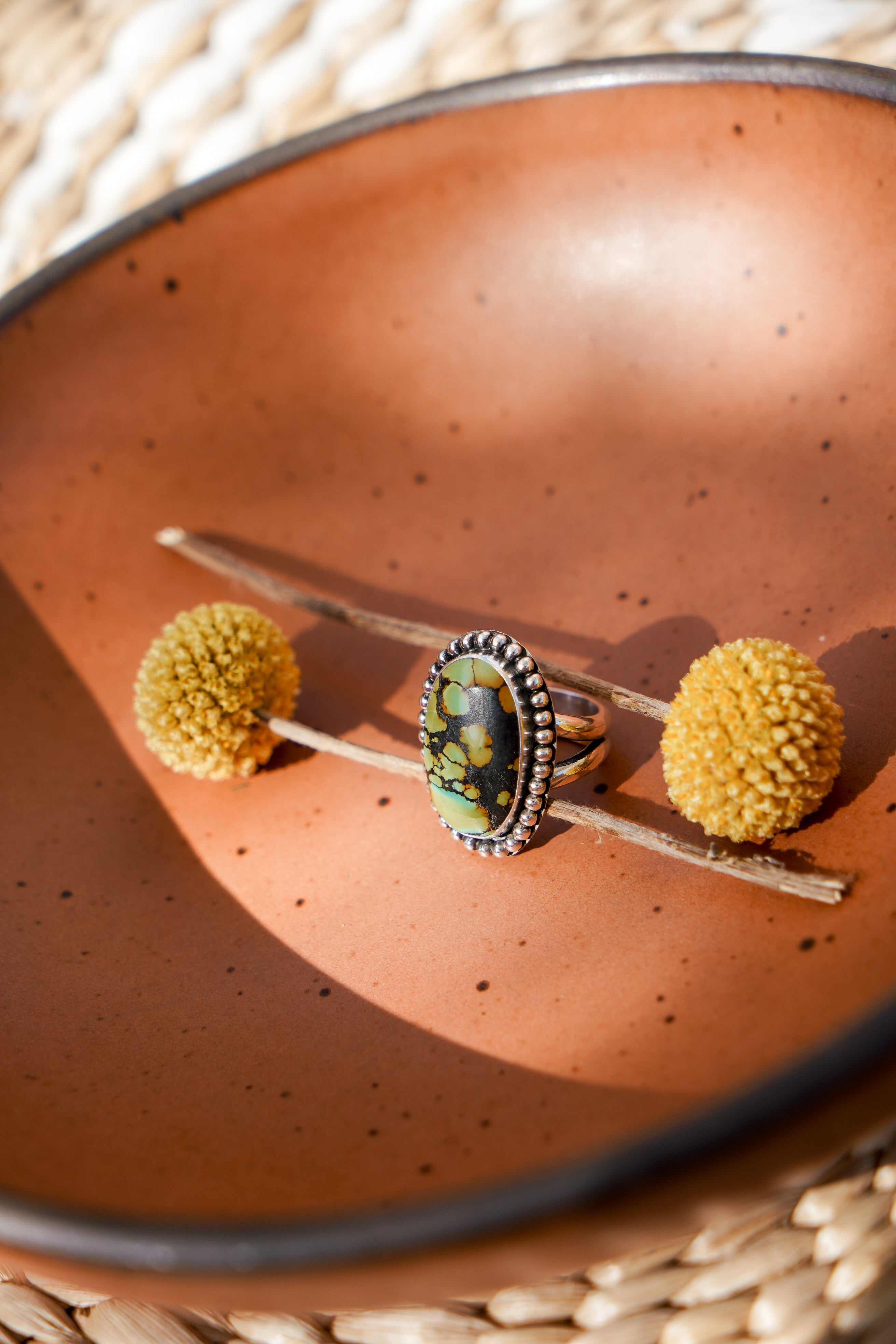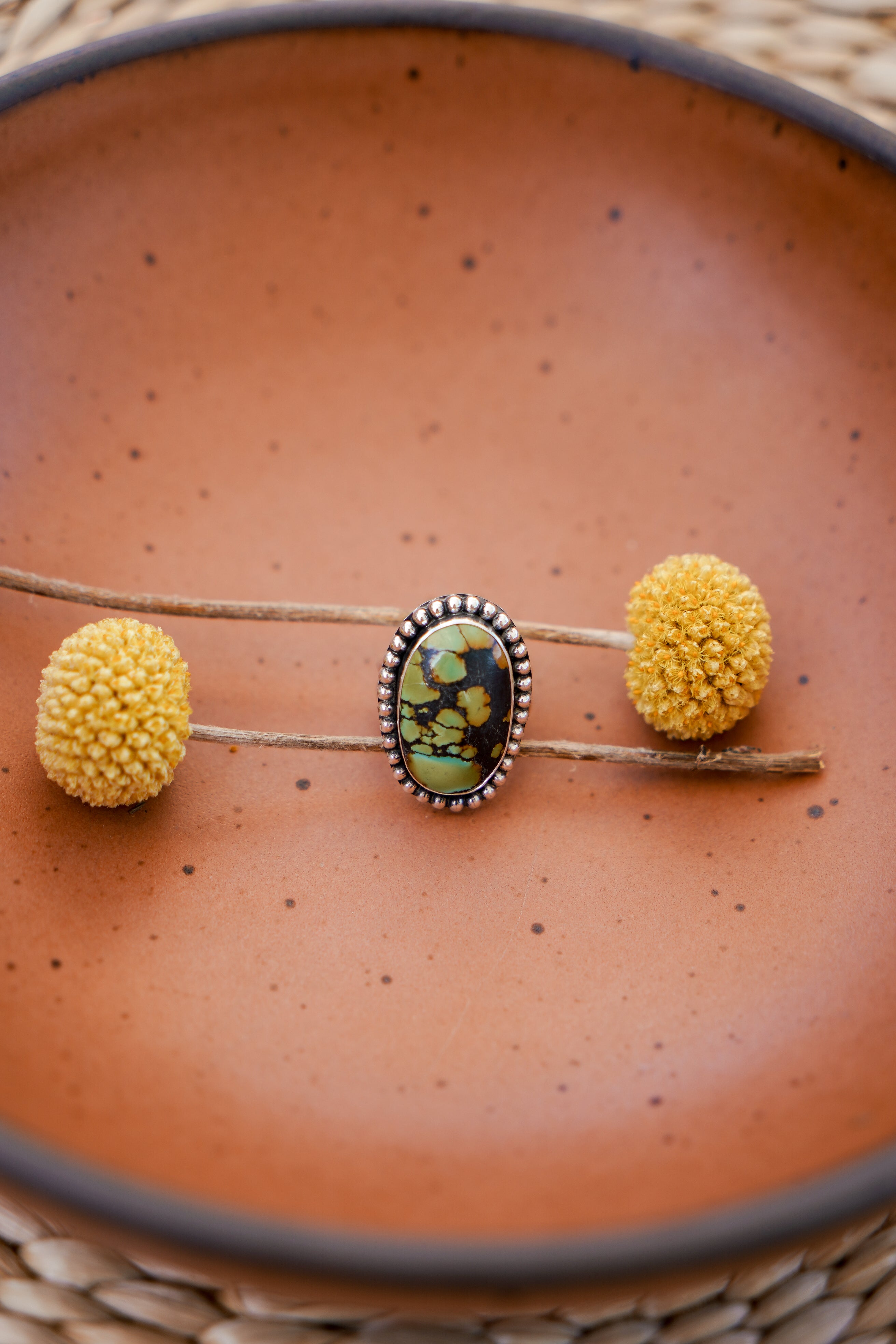 Simple, yet a statement. We're in love with this piece of turquoise! This bead wire beauty makes a great ring for everyday wear.