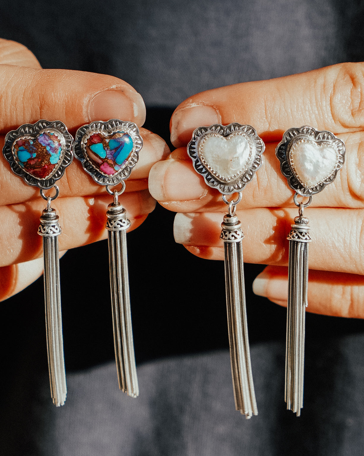We are obsessed with this new earring design! The heart-shaped Pink Dahlia stones, the hand-stamped border, the sterling silver fringe. This is a special one!
