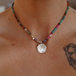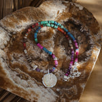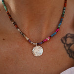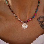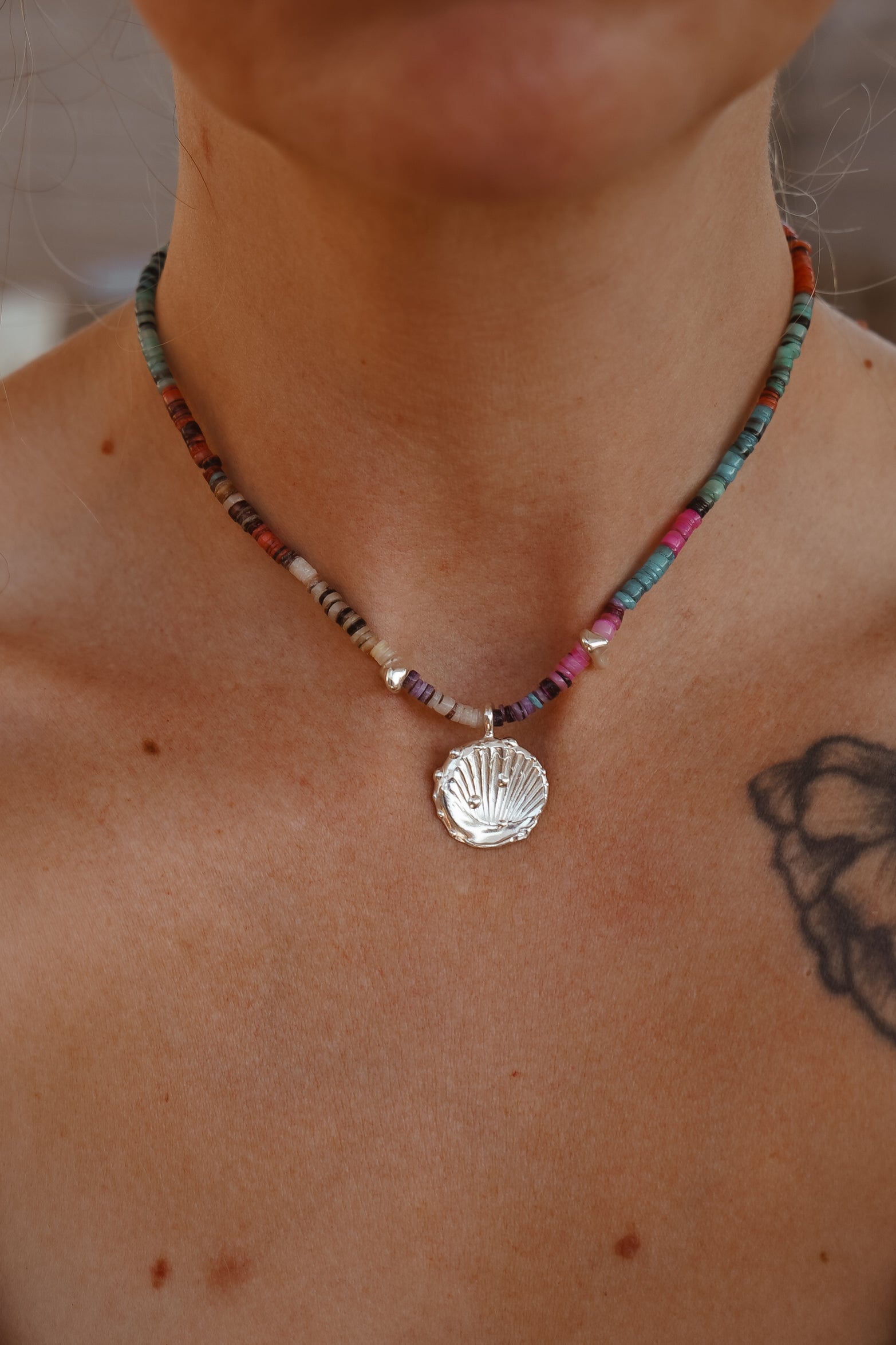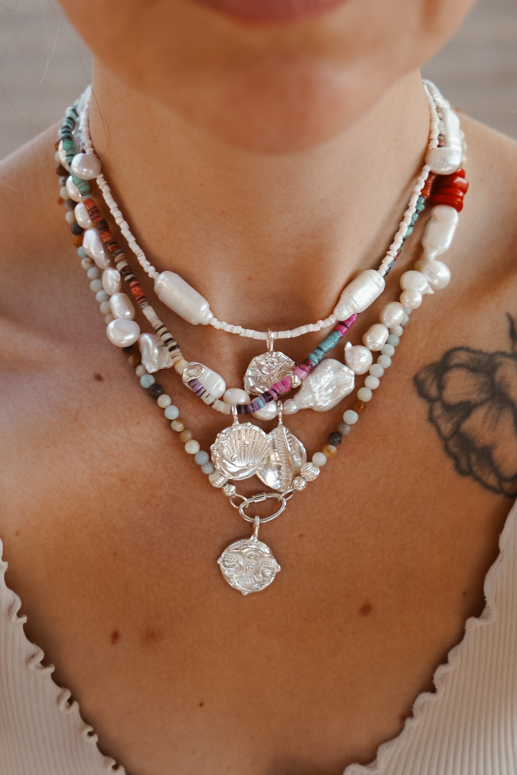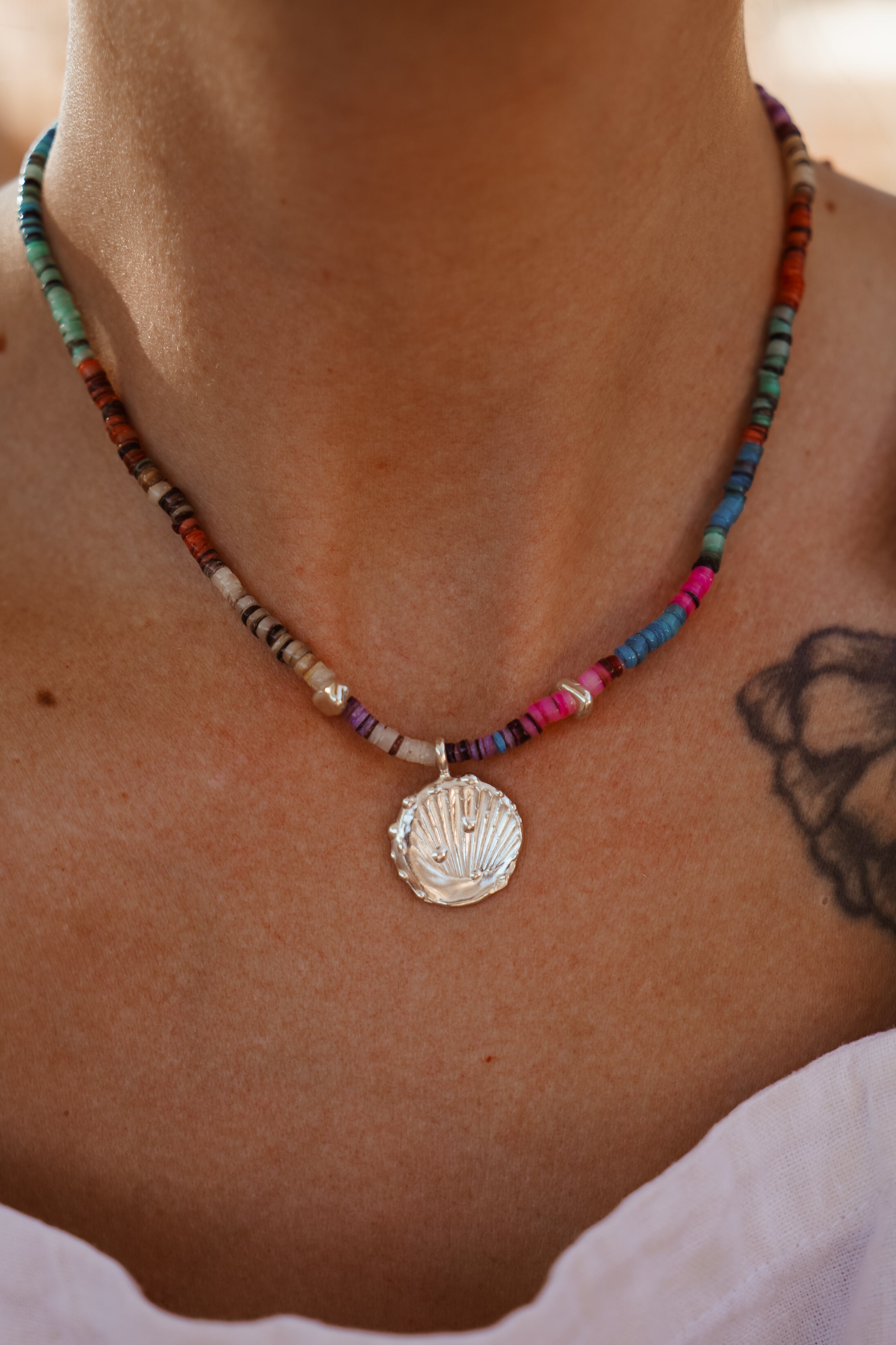 Oh la la! We're obsessed with these rainbow colored shell beads and we love how well they go with this sterling silver charm. We've been having so much fun hand-making these charms in wax and then casting them in silver- they're such a fun way to add something special to a necklace design.