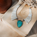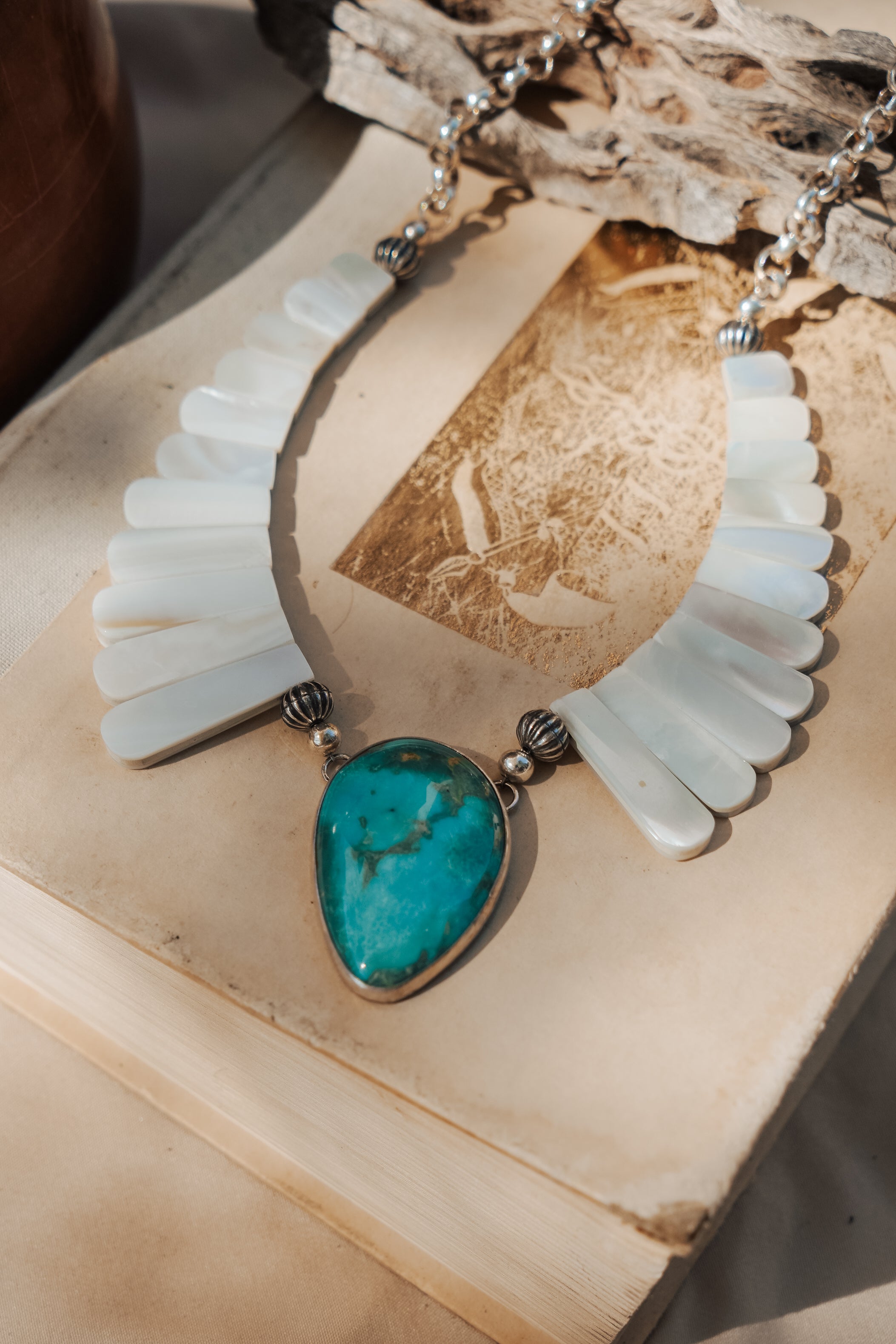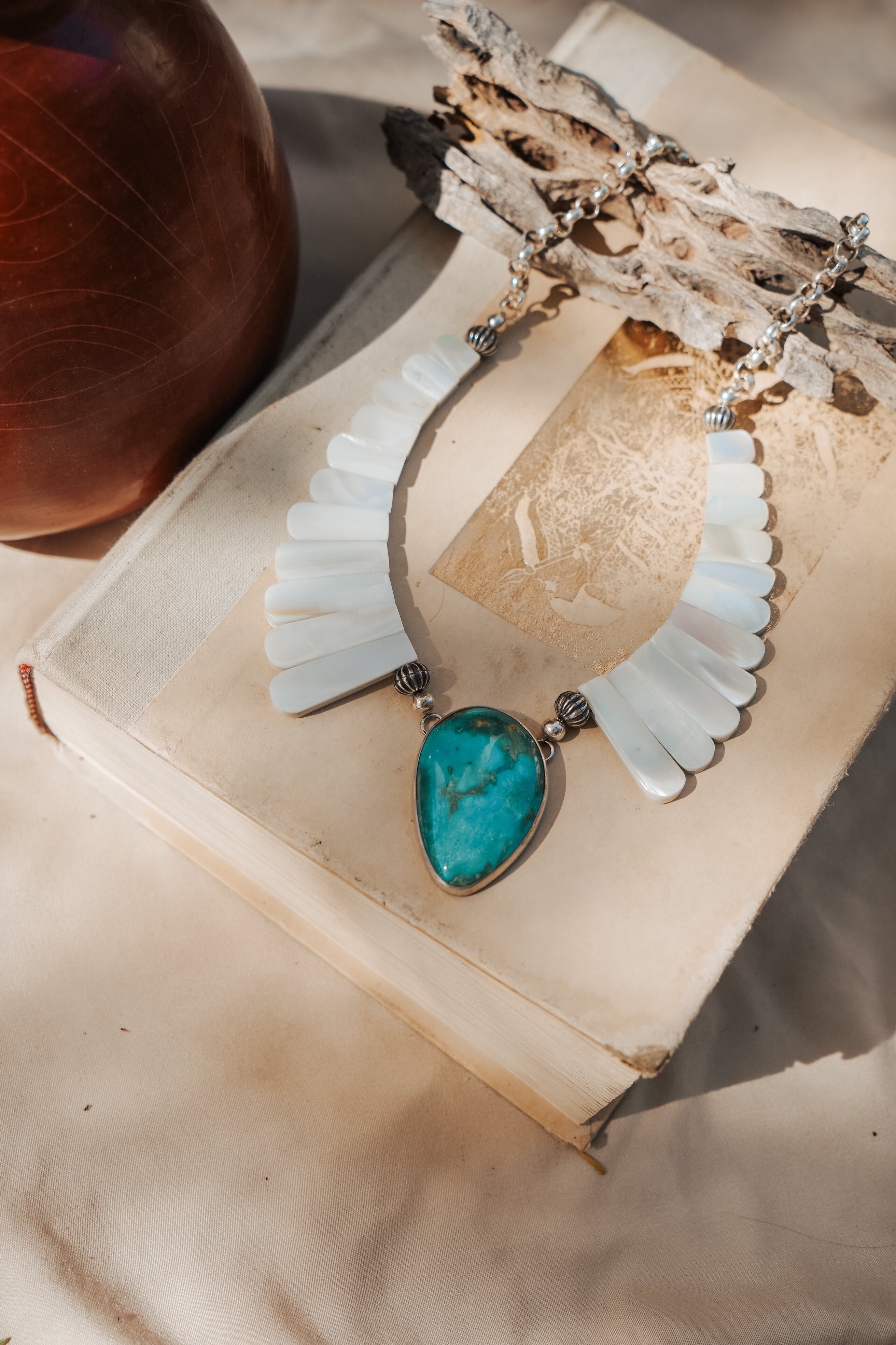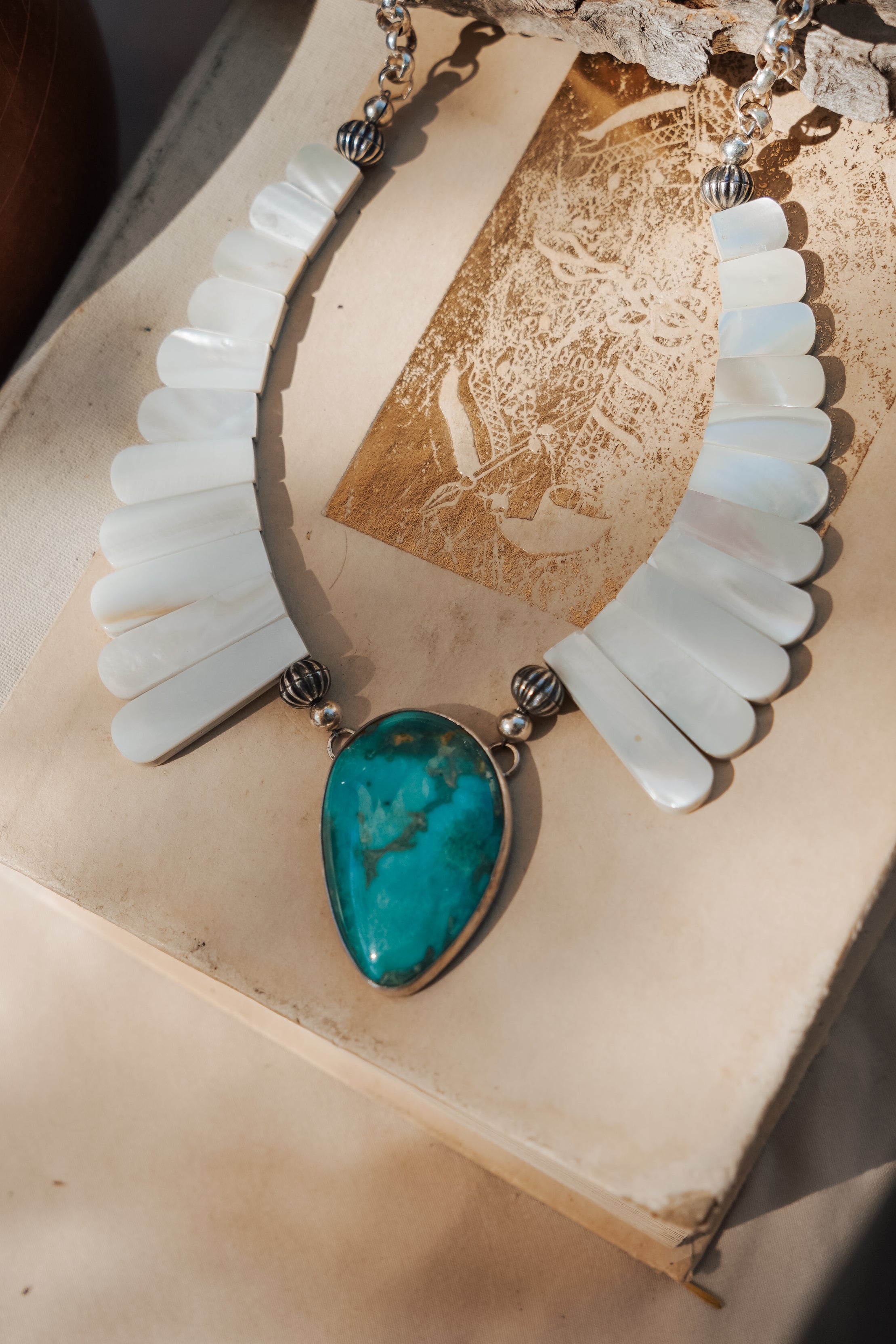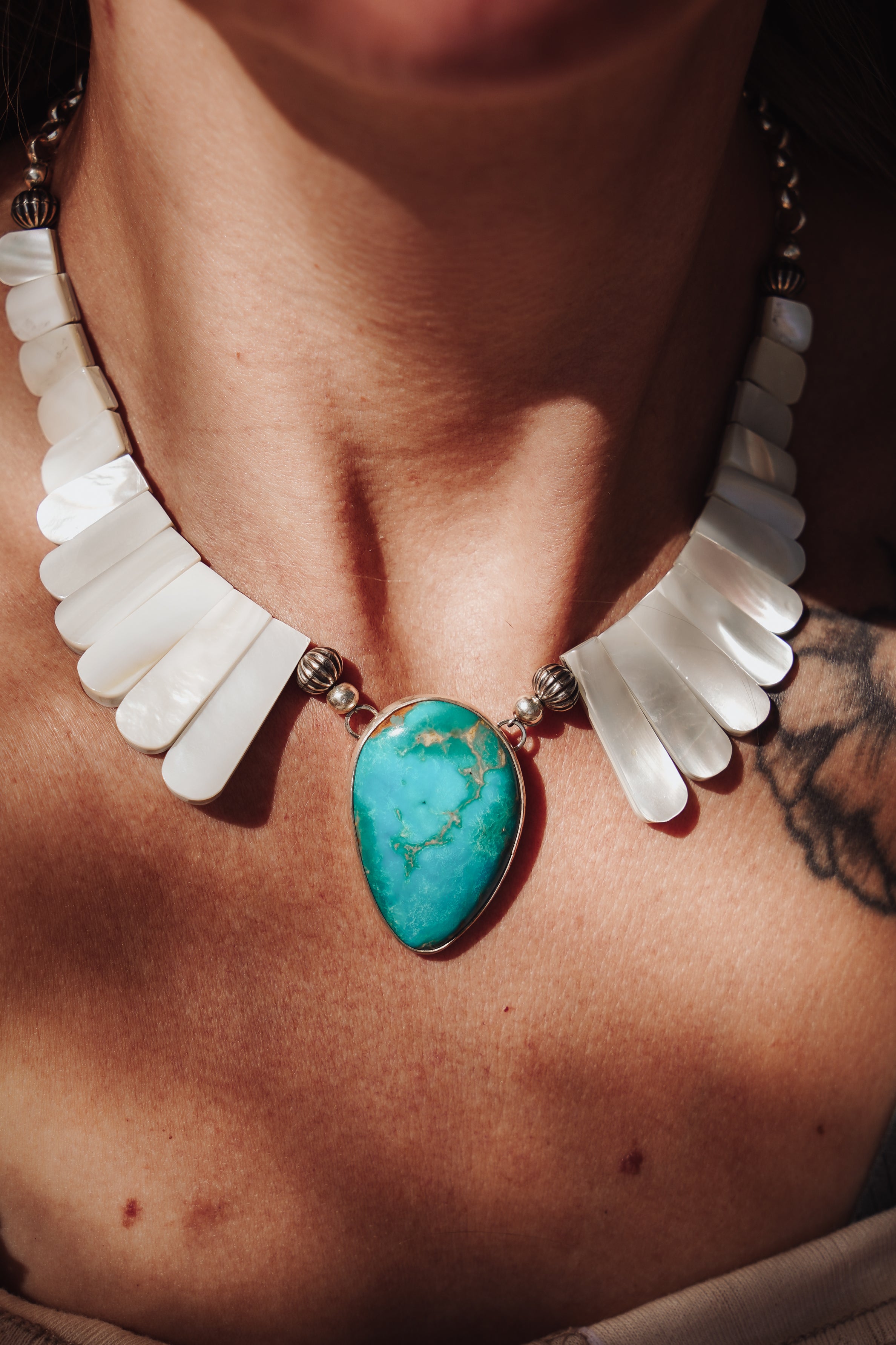 It's back! The Desert Wings Collar design sadly went away when we lost access to these pearl beads, but we've been able to get 3 more sets and we're so excited to use one set in this collection. Look at that juicy turquoise stone- an all-time great!