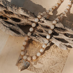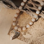 Oh, we're so excited about this new design! This die-struck 14k gold-fill heart pendant is gorgeous and we love it with the color and texture of this peach aquamarine + gold-fill chain. We can't wait to see who ends up with this beauty!