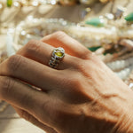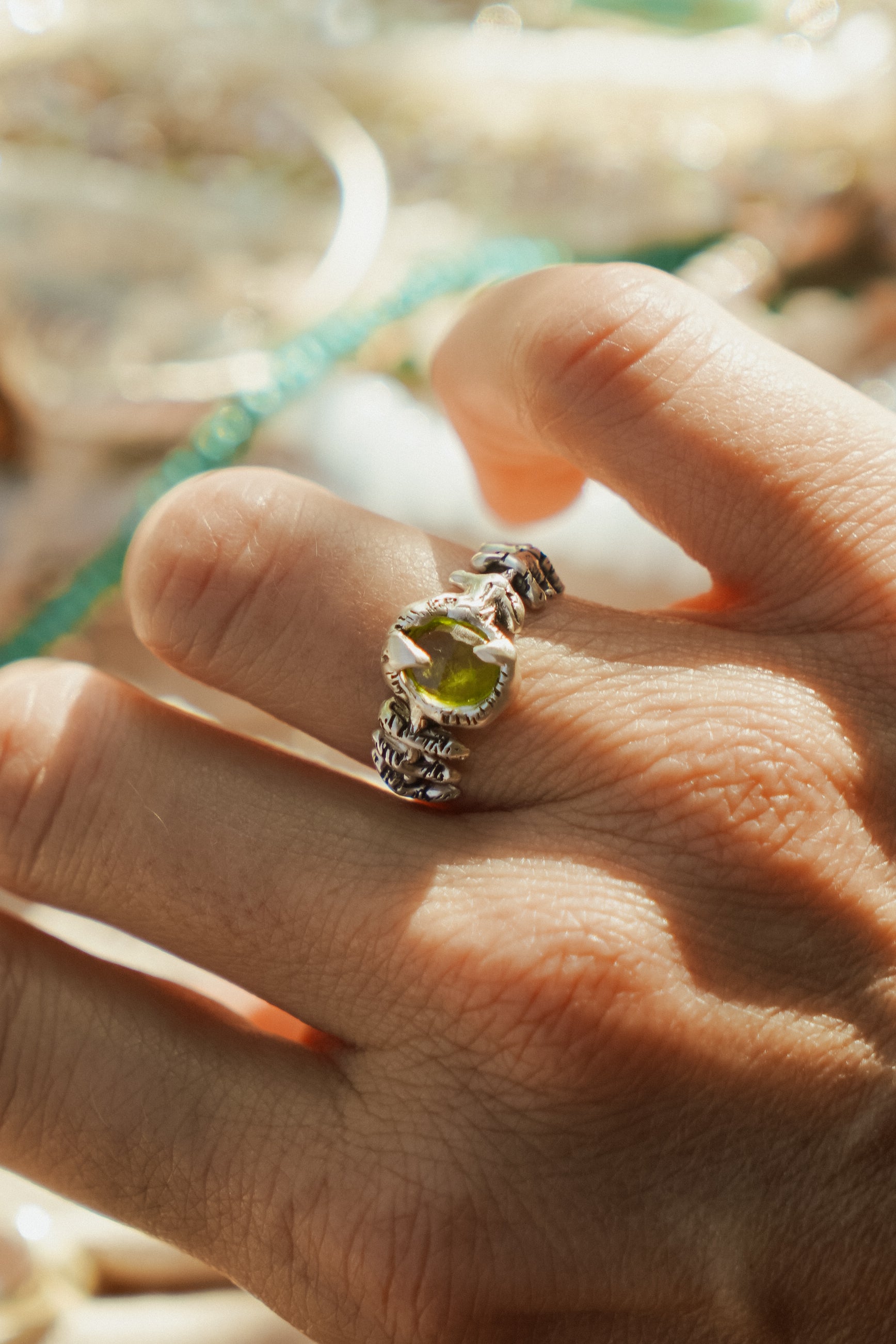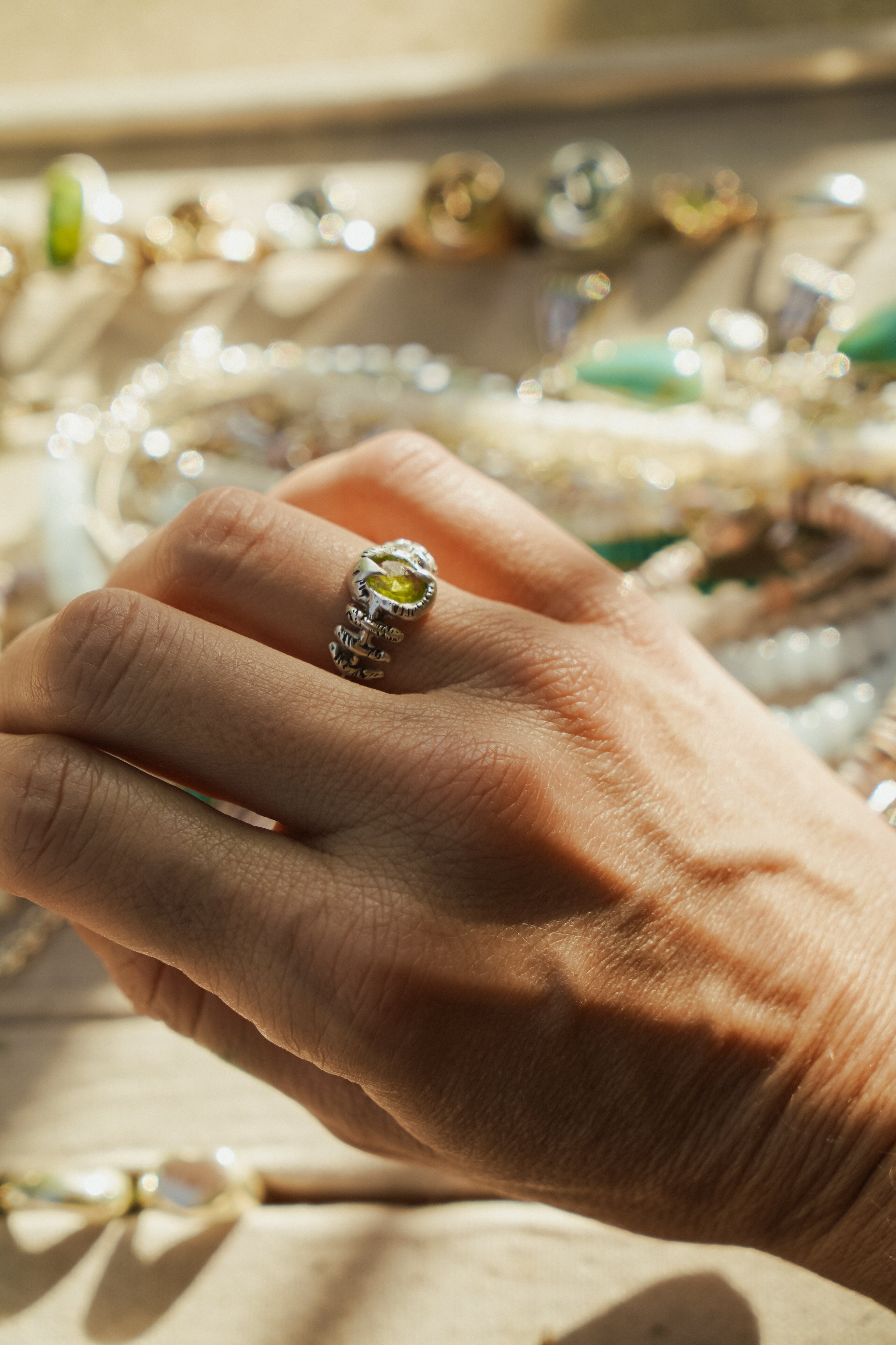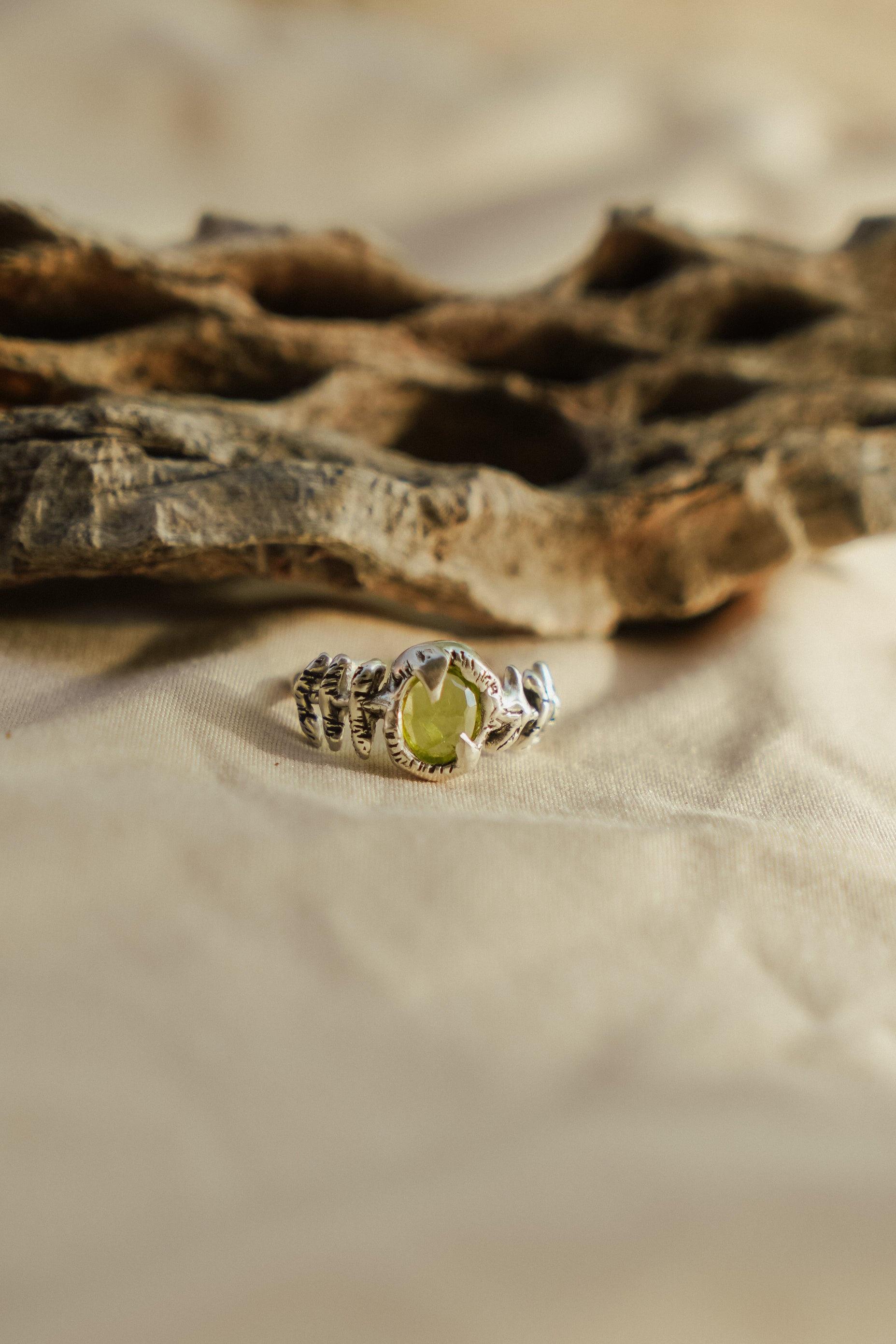 This Sylvaris Ring features sterling silver securely holding a delicate peridot stone, combining refined comfort with a sense of protection. The expertly crafted piece balances elegance and durability.