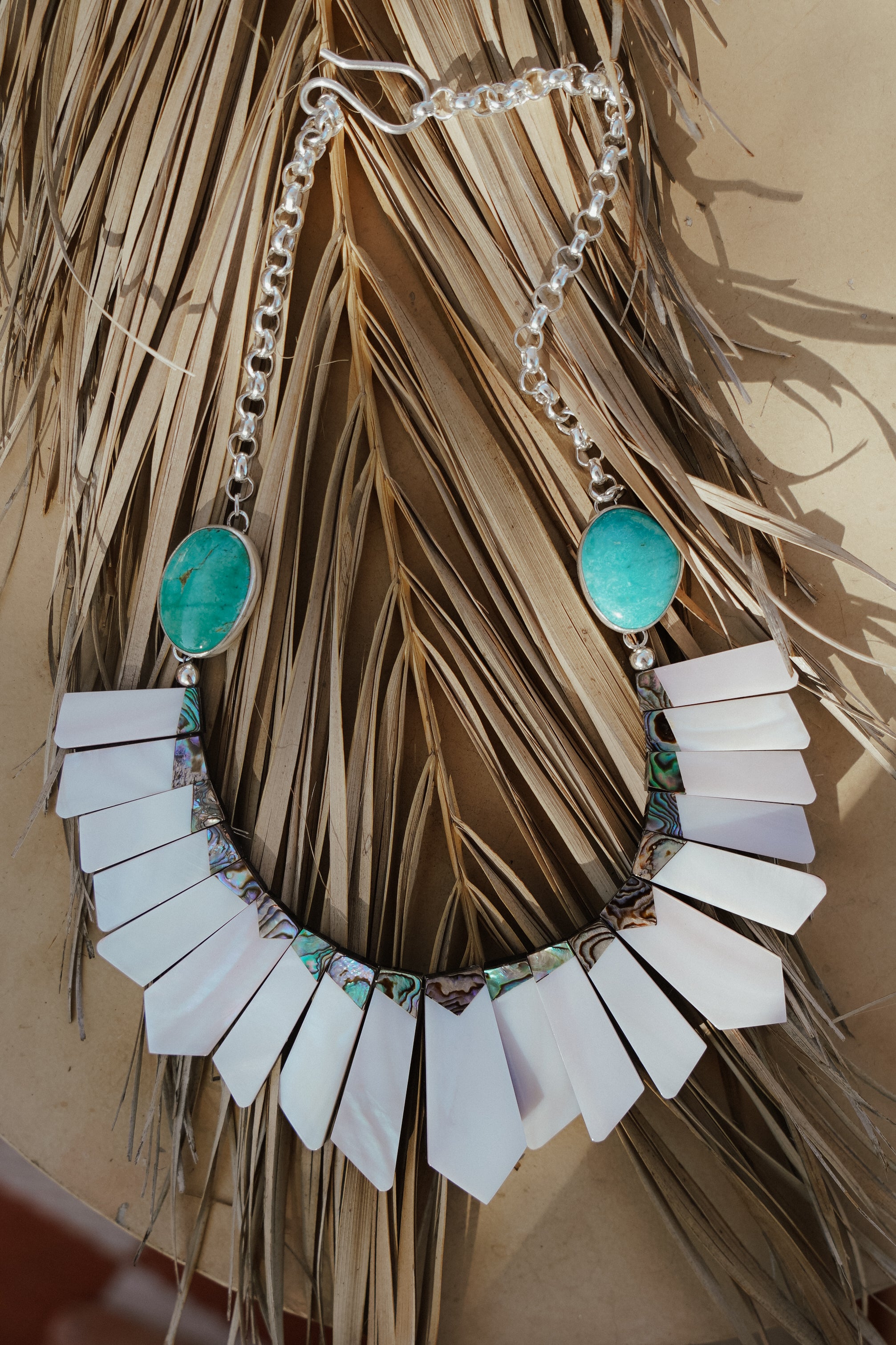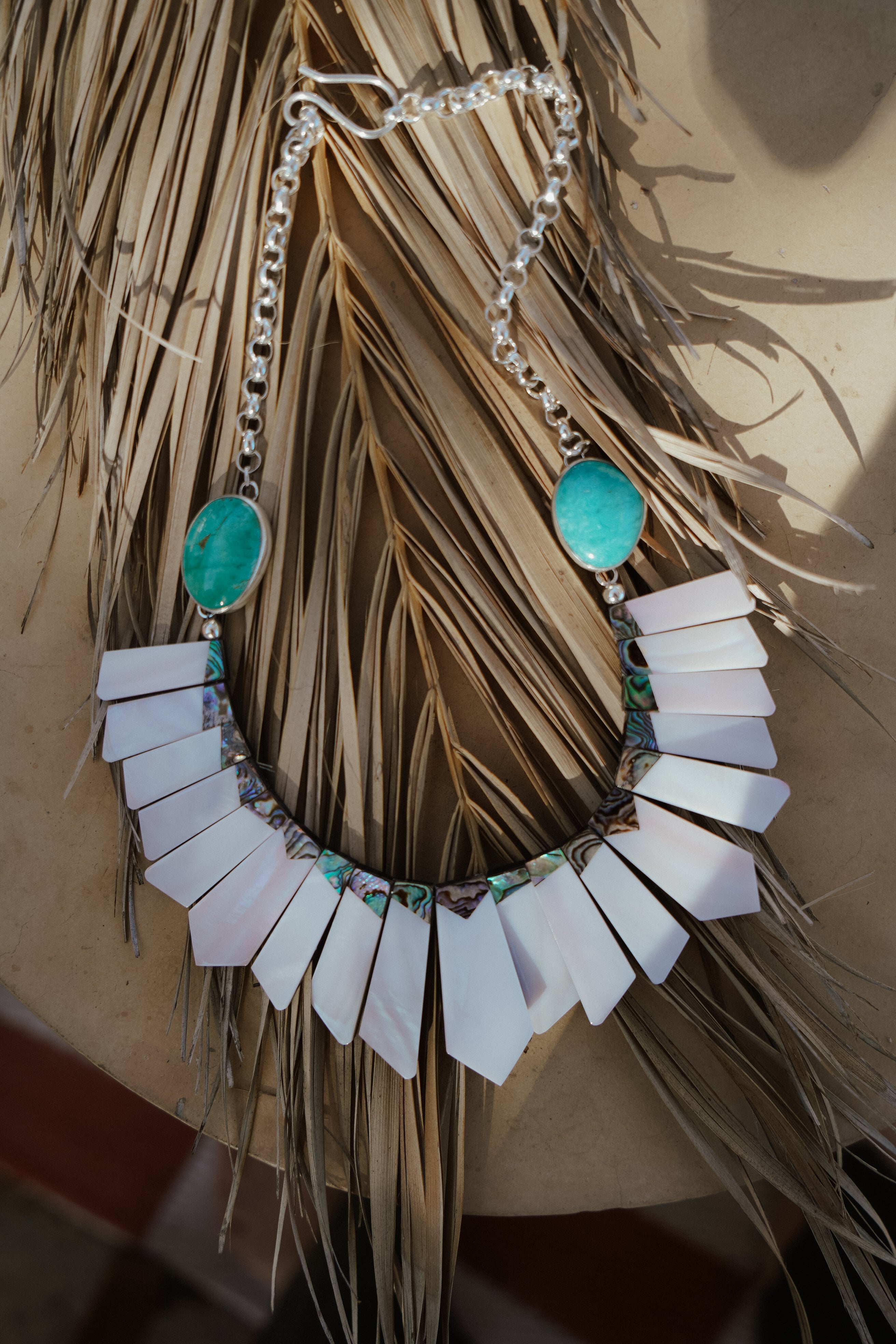 We got so excited when we found these Pearl + Shell beads from one of our favorite suppliers at this year's Tucson Gem Show. The shape and color have all the vibes. Throw in these beautiful Royston Turquoise stones and you have a one-of-a-kind collar great for adding flair to any outfit, whether at a special occasion or a regular day that needs some extra pizzazz.