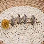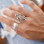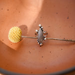 This is such a fun new ring design- we love the shape and swirly matrix of this sharp Lace Agate stone. And it's all finished off with these asymmetrical ball elements and a split, hand-stamped ring band.