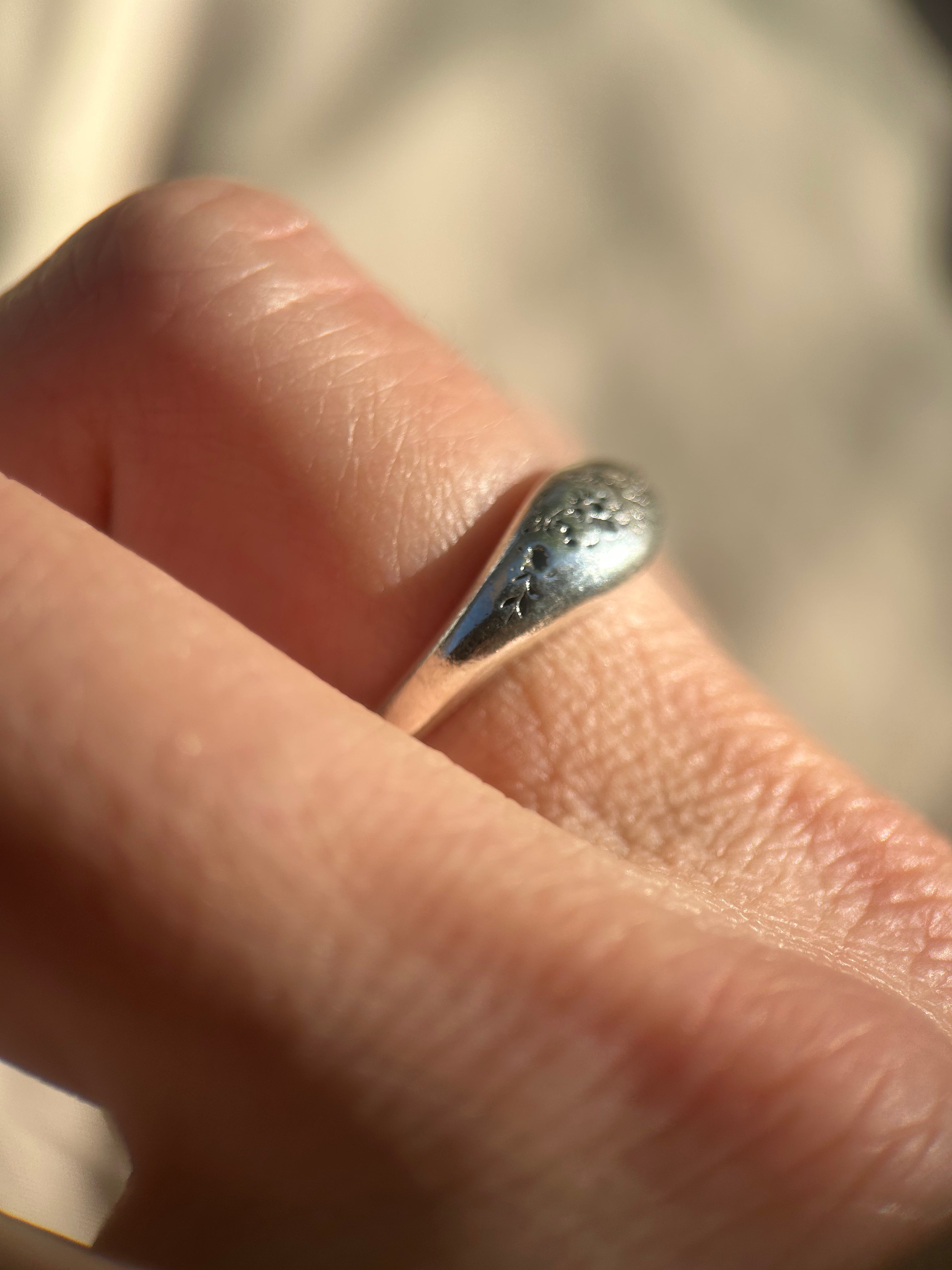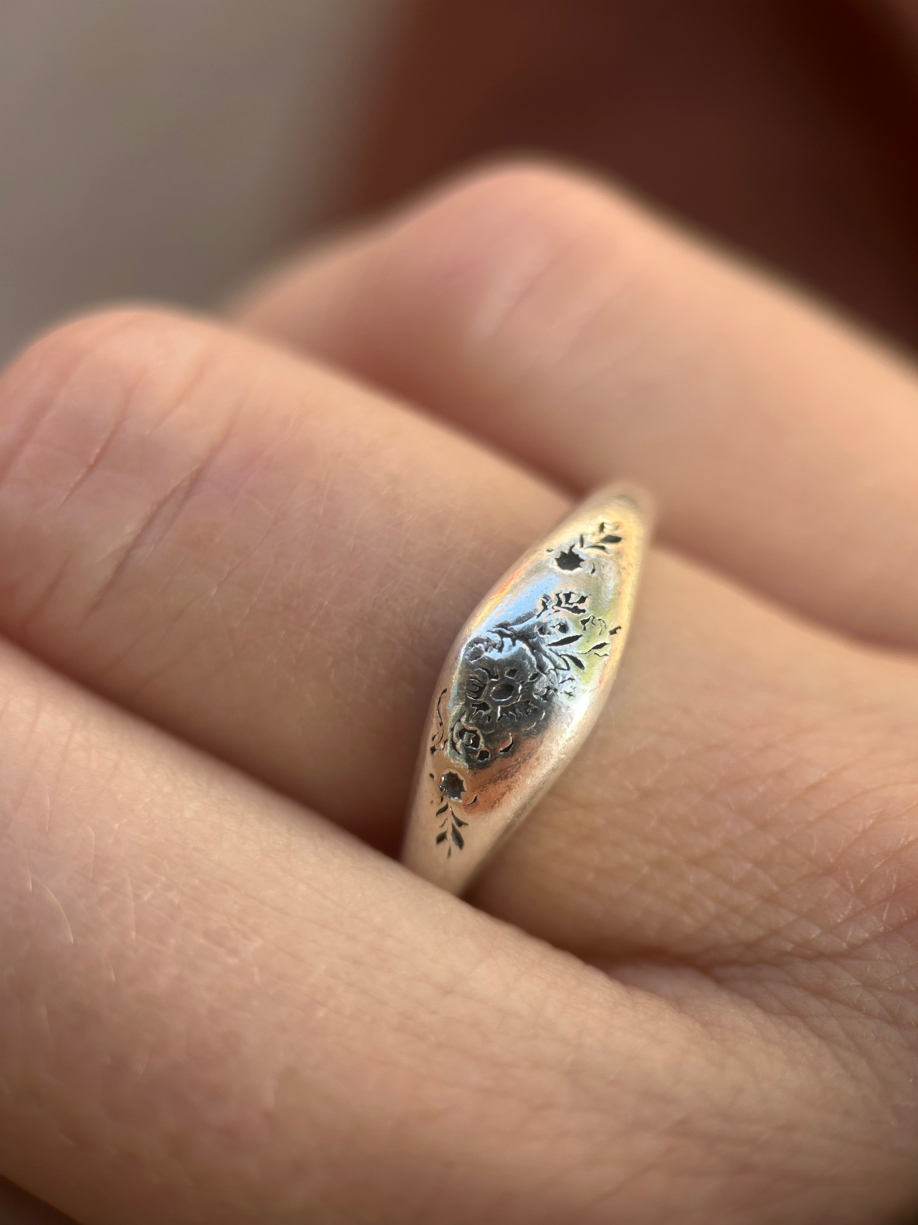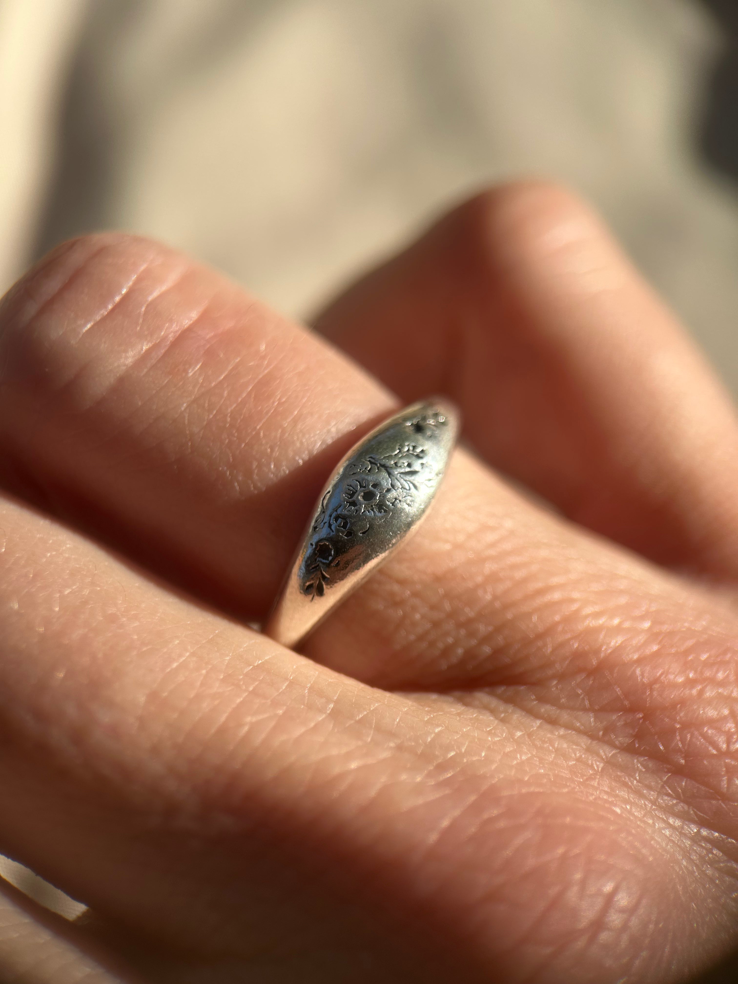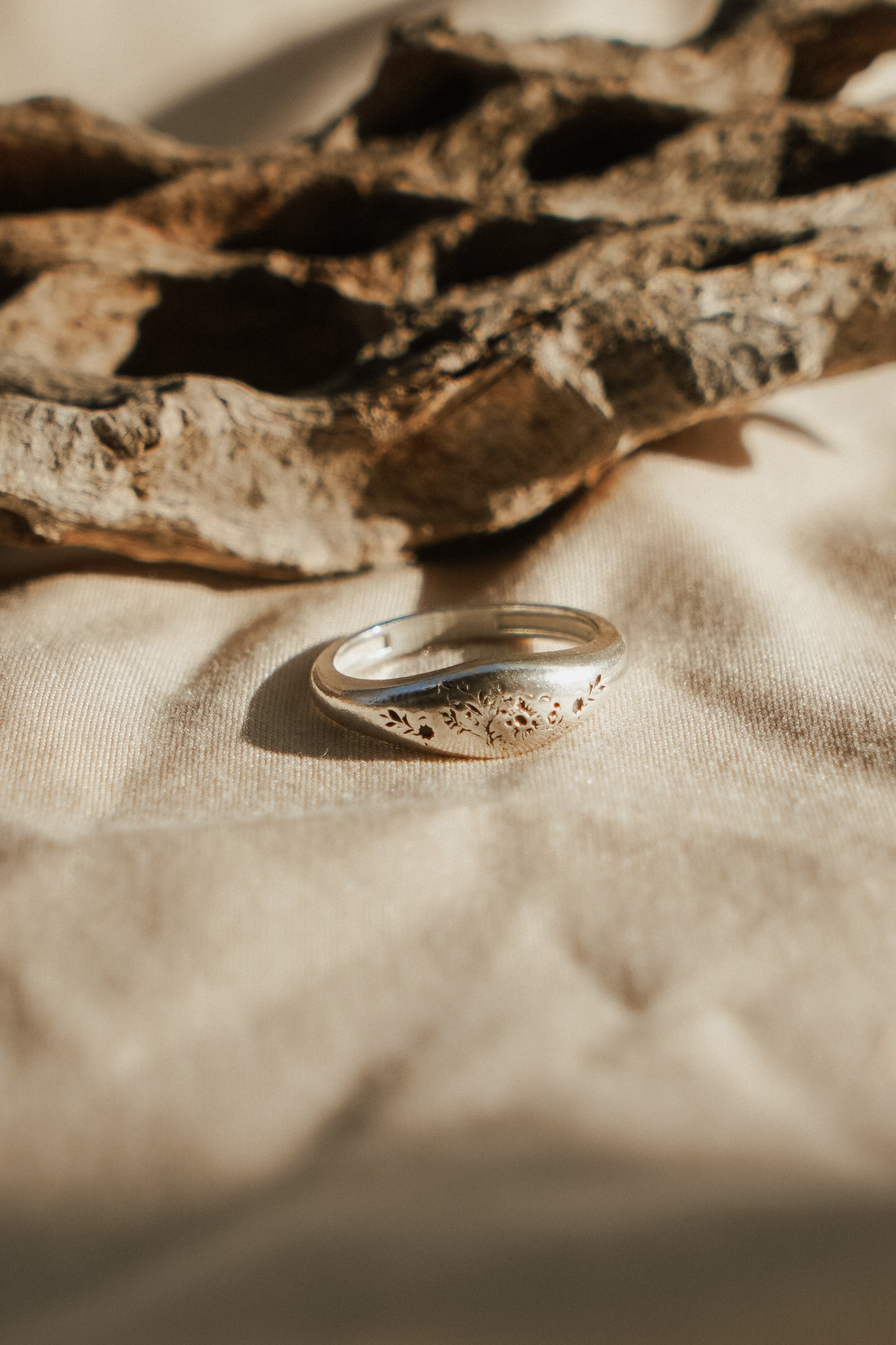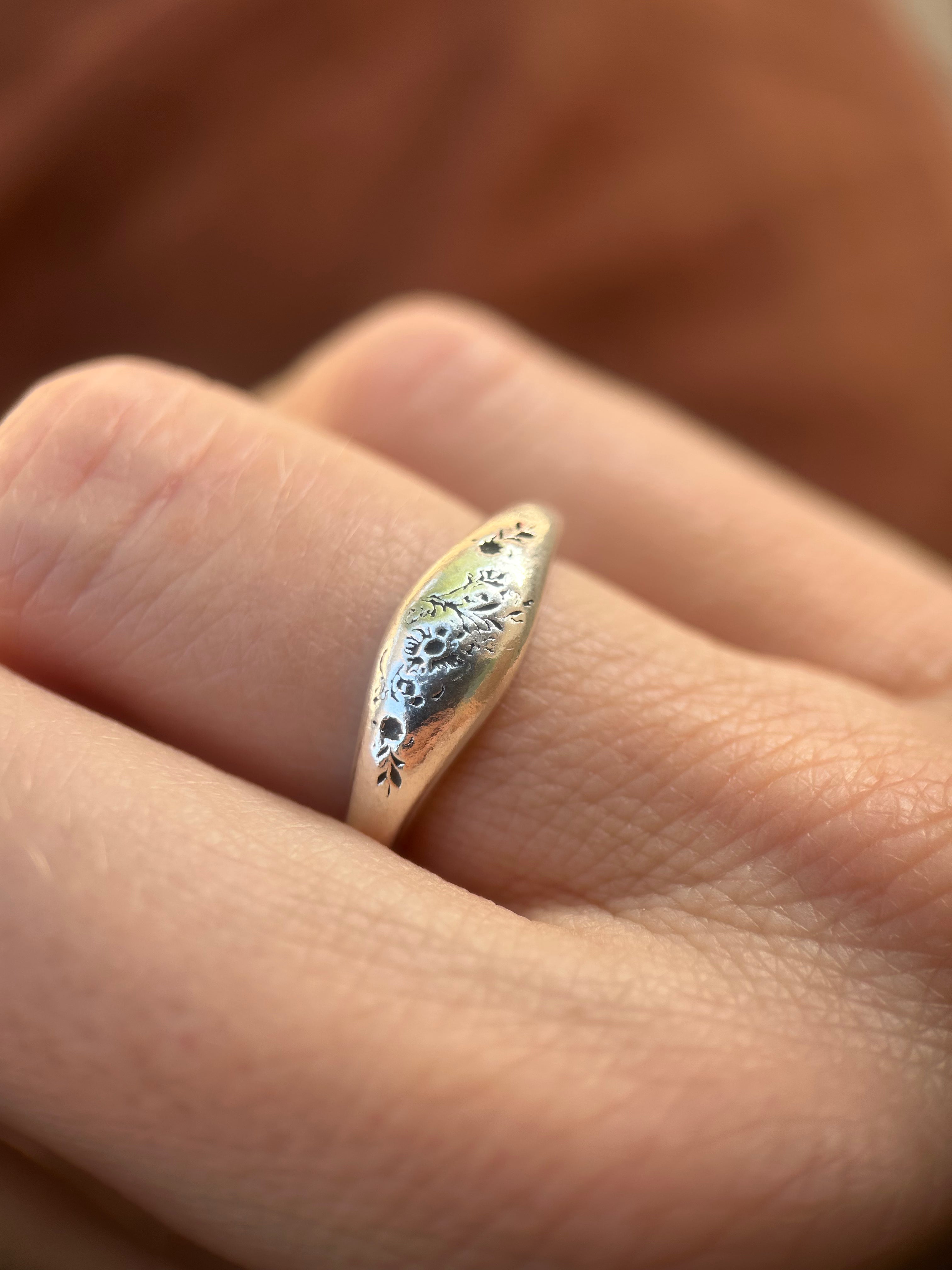 The Garden Song Ring features a subtle, etched floral design that captures a romantic, timeless elegance. Its signet style offers a classic silhouette, perfect for everyday wear or special occasions.