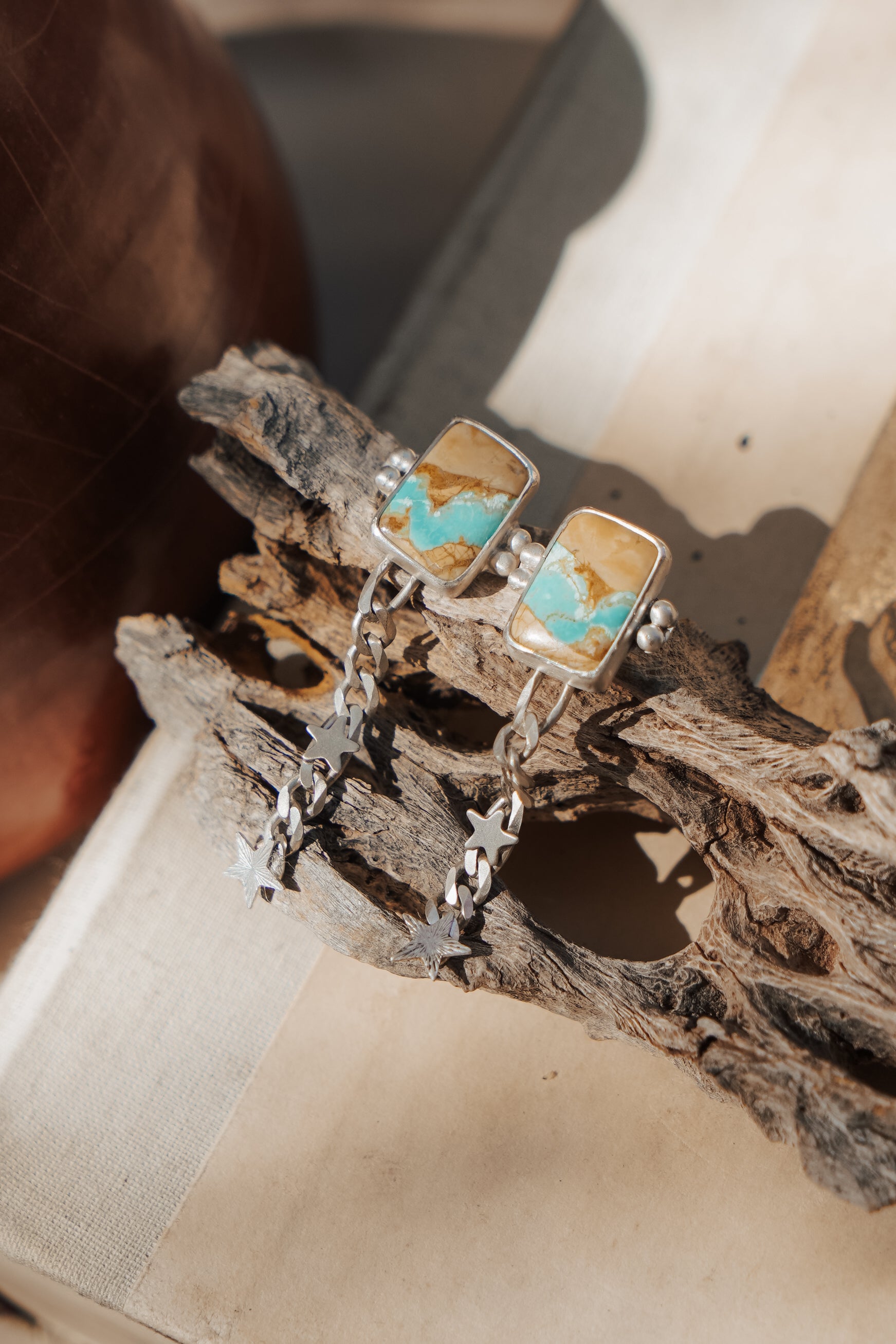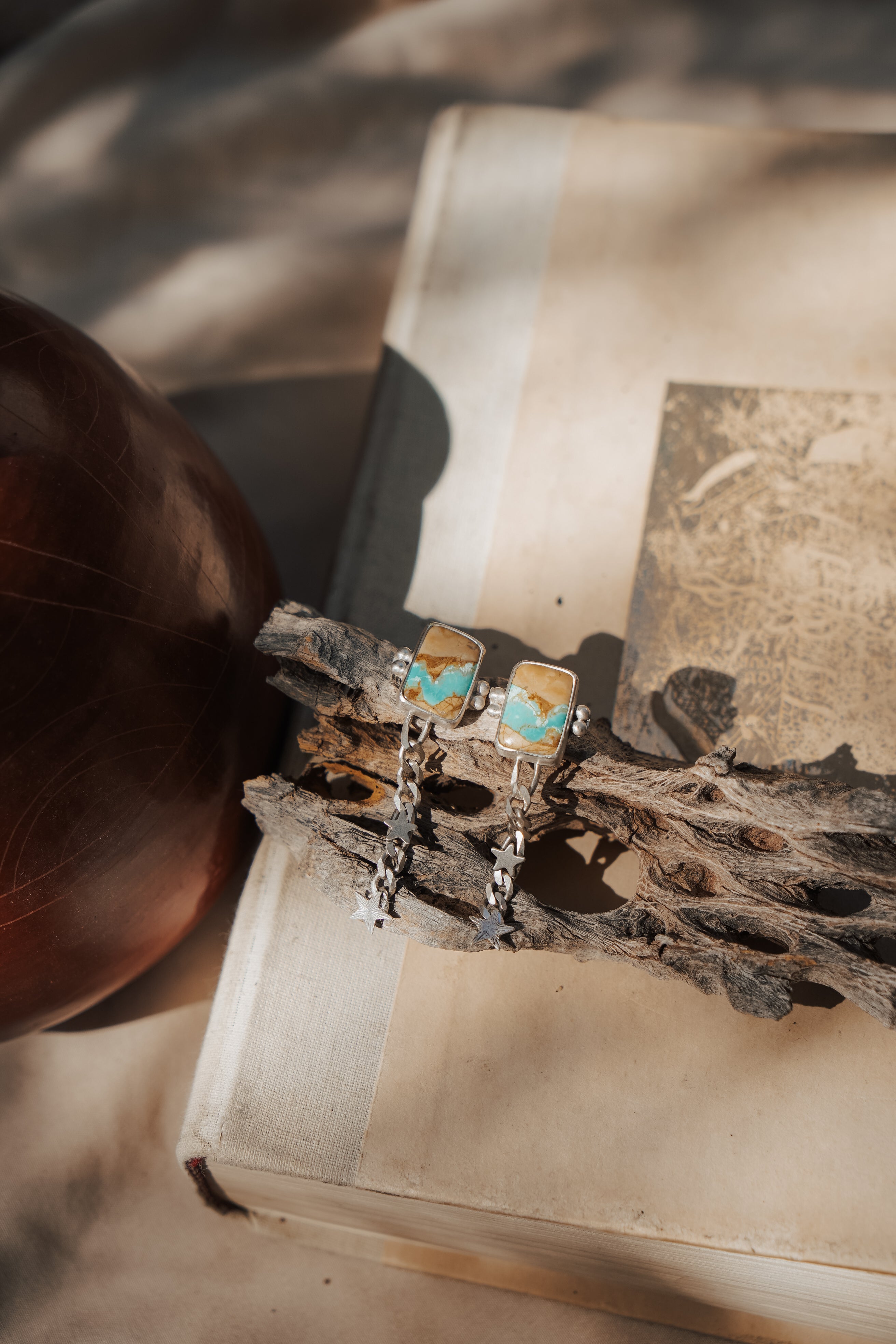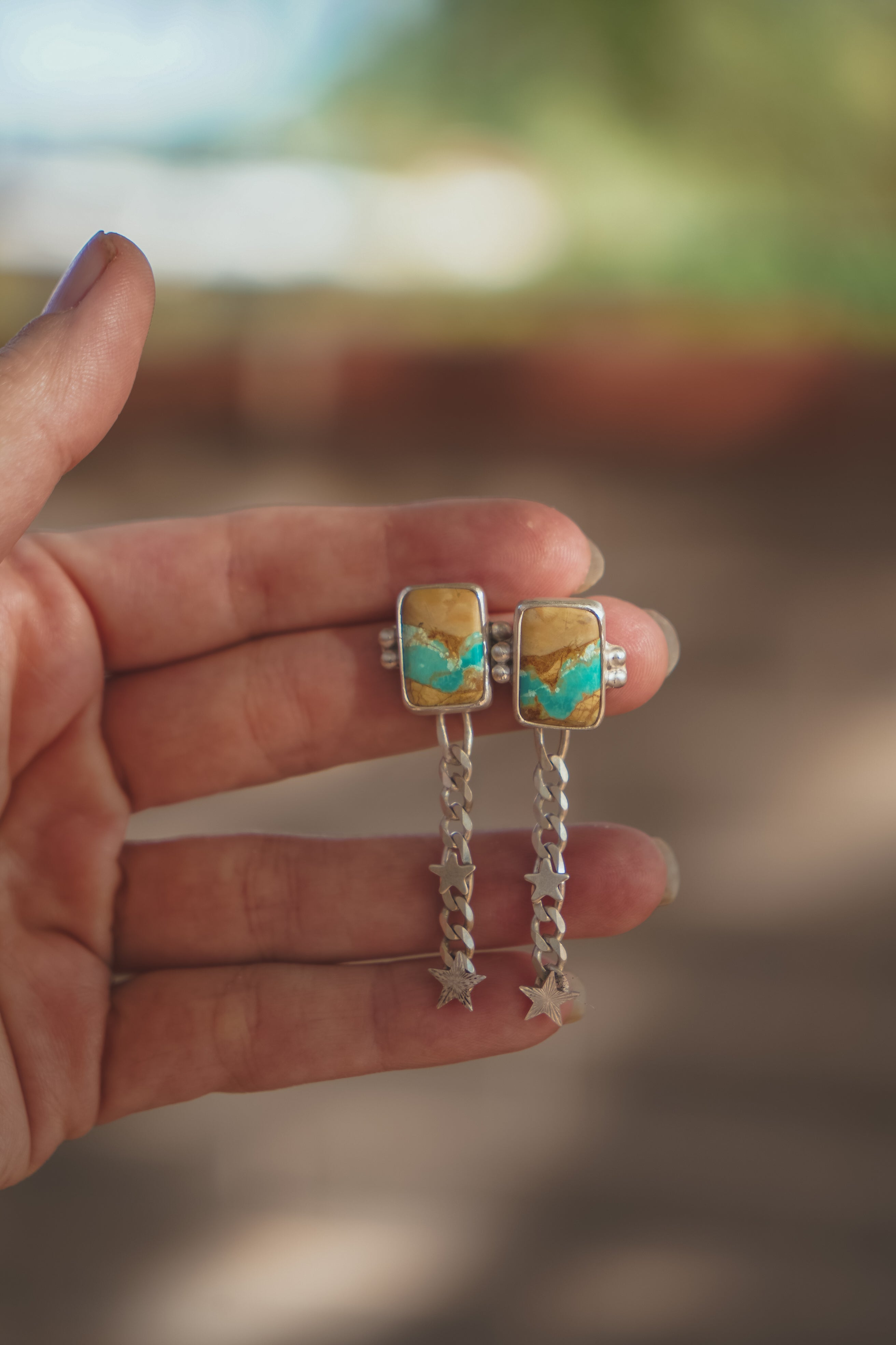 This new earring design is so fun! First of all, this Royston Ribbon is gorgeous- it looks just like a pristine, light blue river flowing along sandy shores. The curb chain drip with stars adds that extra flair and make these babes truly one-of-a-kind. Can't wait to see who ends up with them!