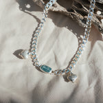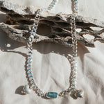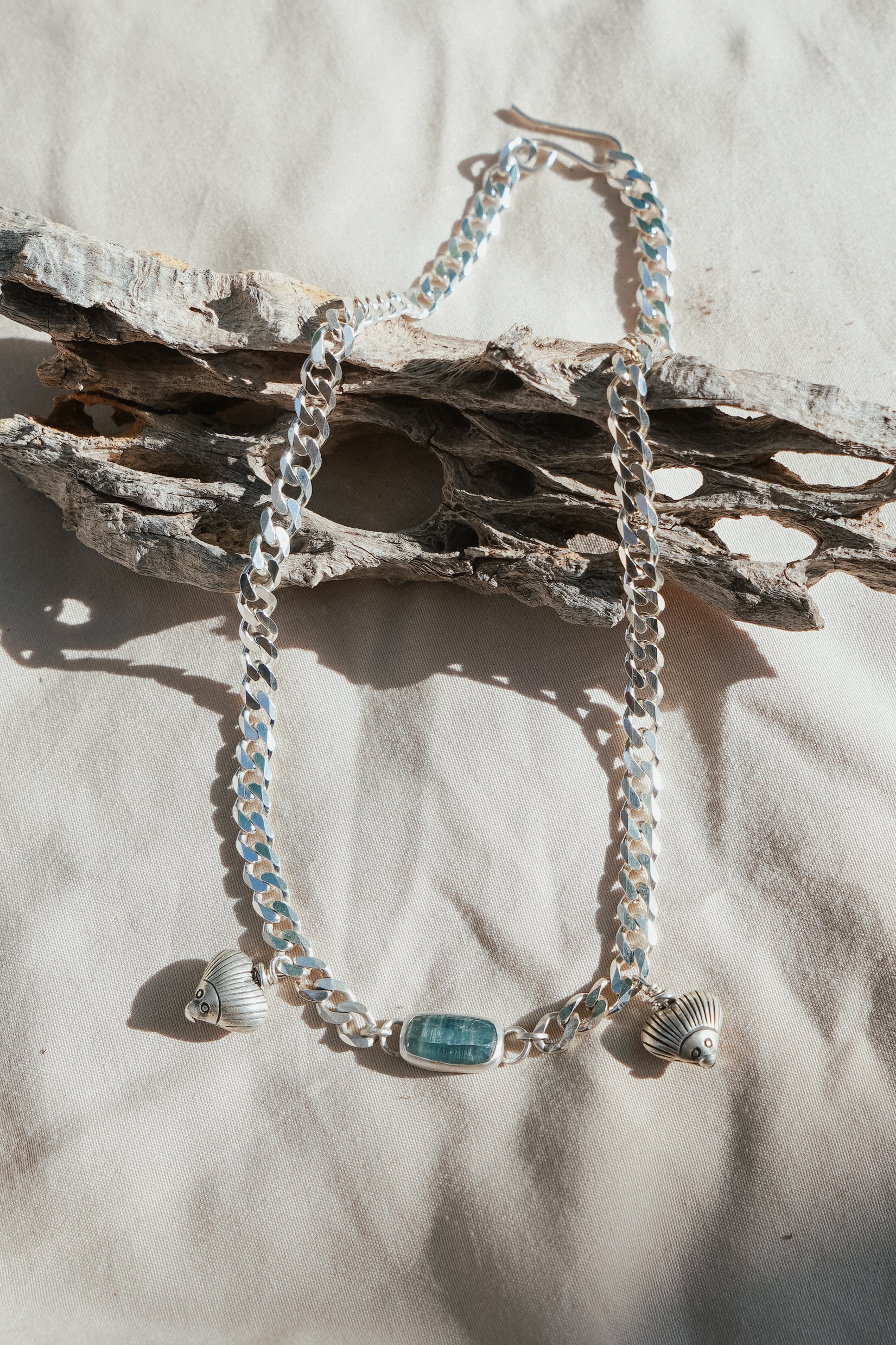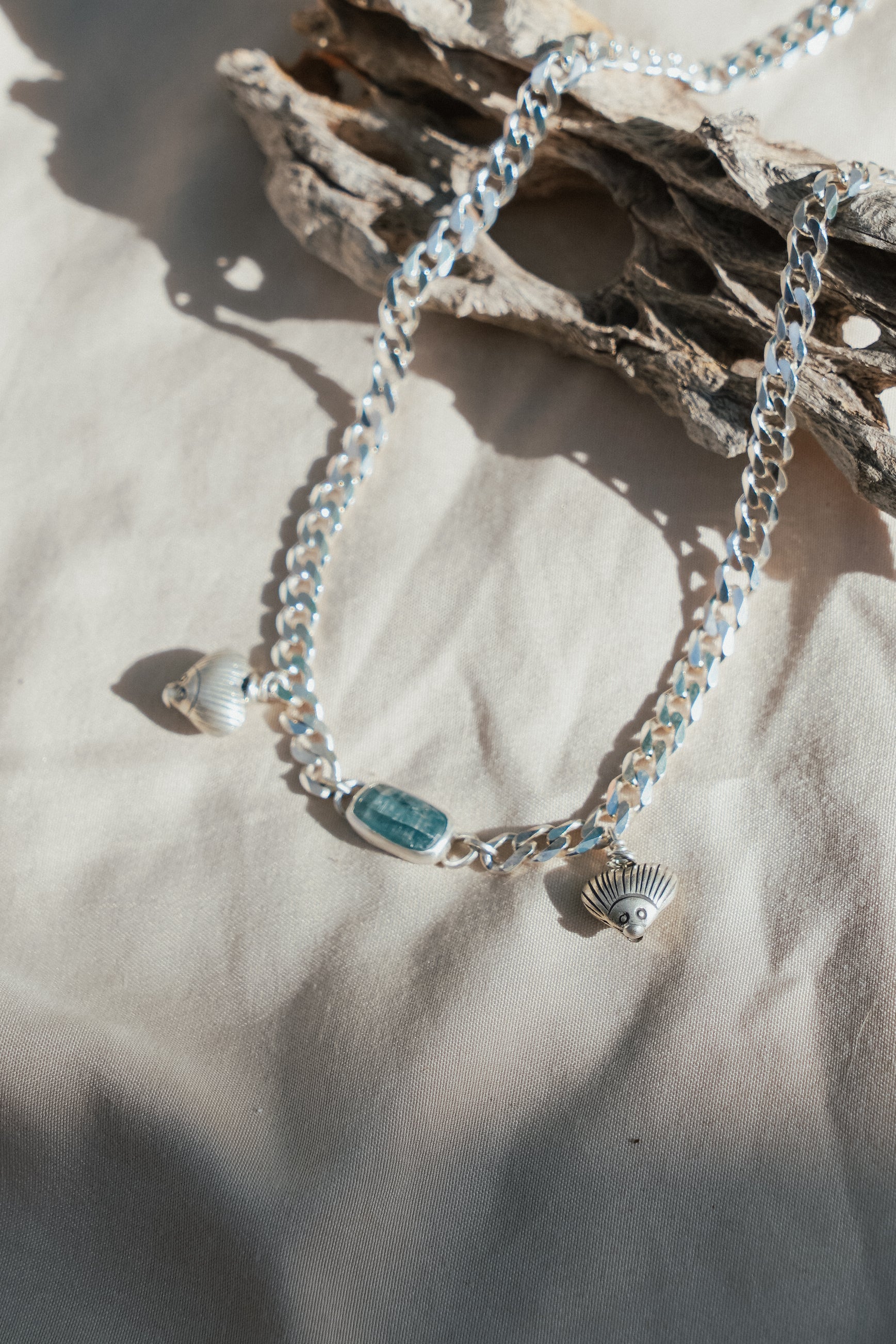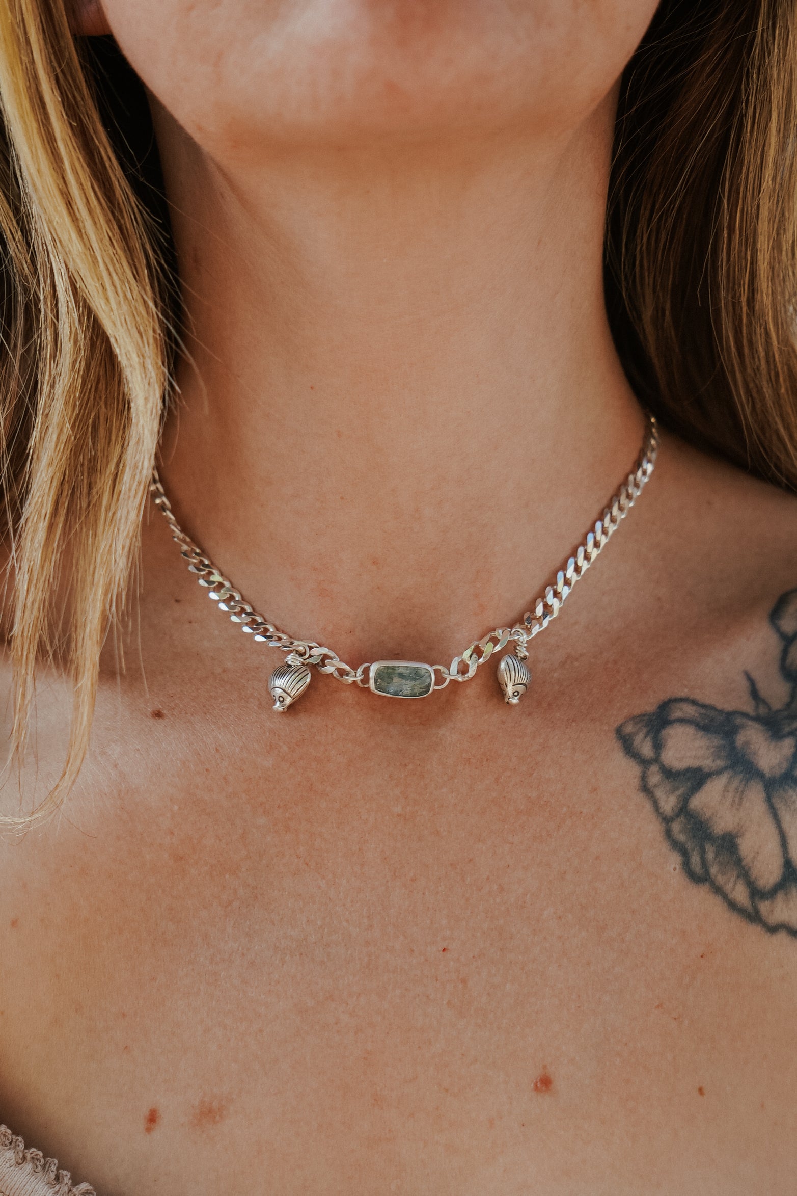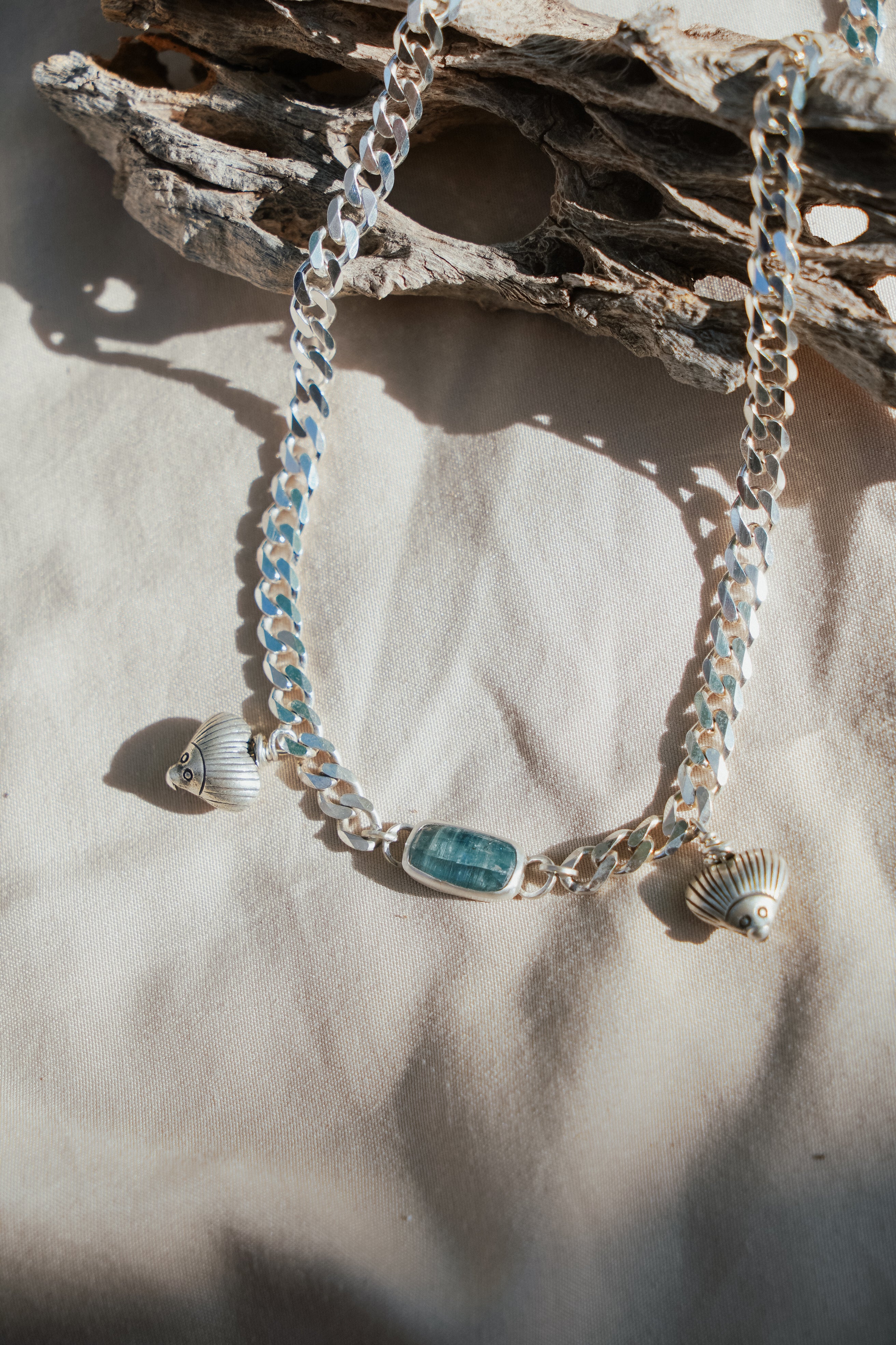 The Kyanite Necklace with Sterling Silver Beads showcases a striking kyanite gemstone paired with polished sterling silver beads on a sleek curb chain. This one-of-a-kind design brings a bright, refreshing energy to your jewelry collection, perfect for adding a confident sparkle to any outfit.
