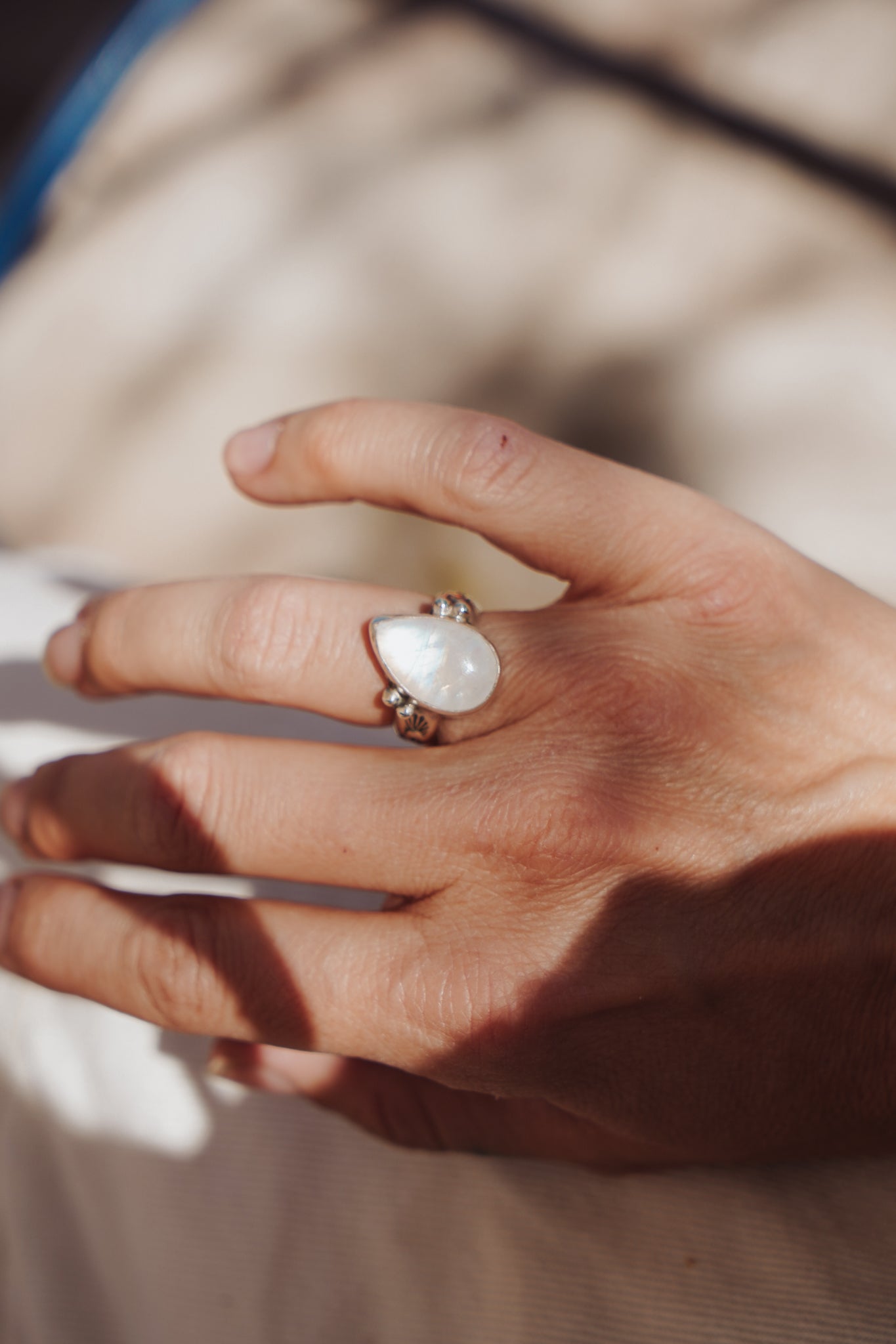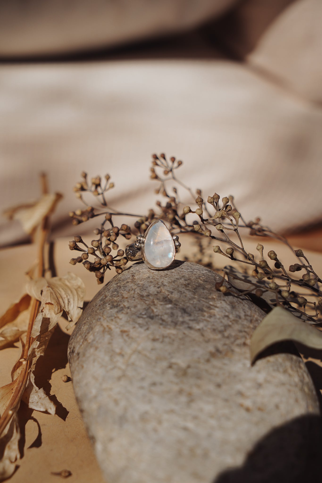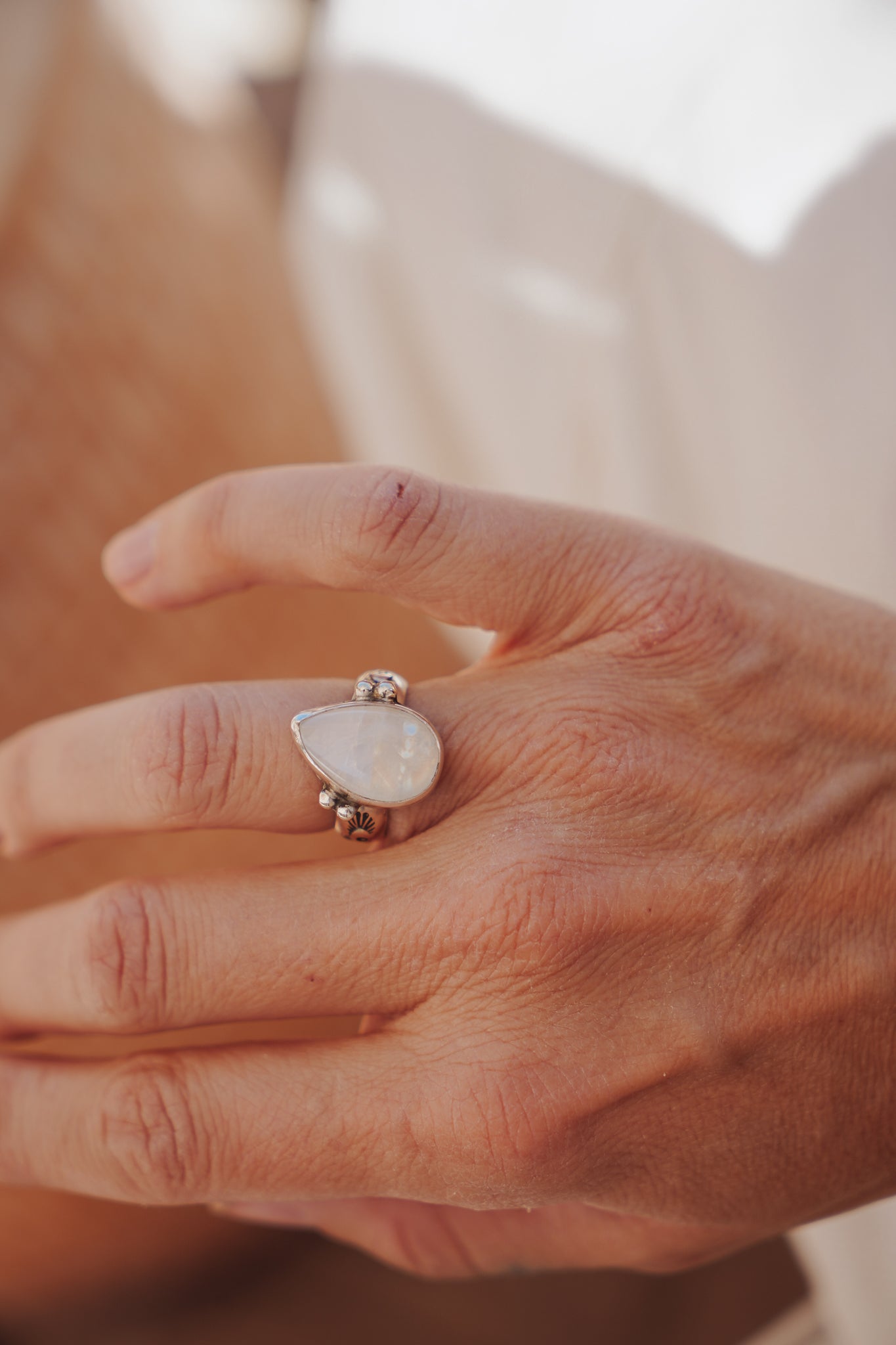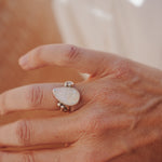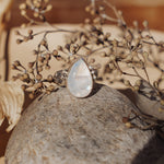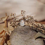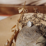 It doesn't get much better than Rainbow Moonstone- we love the way they flash in the light! We loved designing around this teardrop shaped stone with the ball elements and medium thickness, hand-stamped band. Can't wait to see who ends up with this beauty!