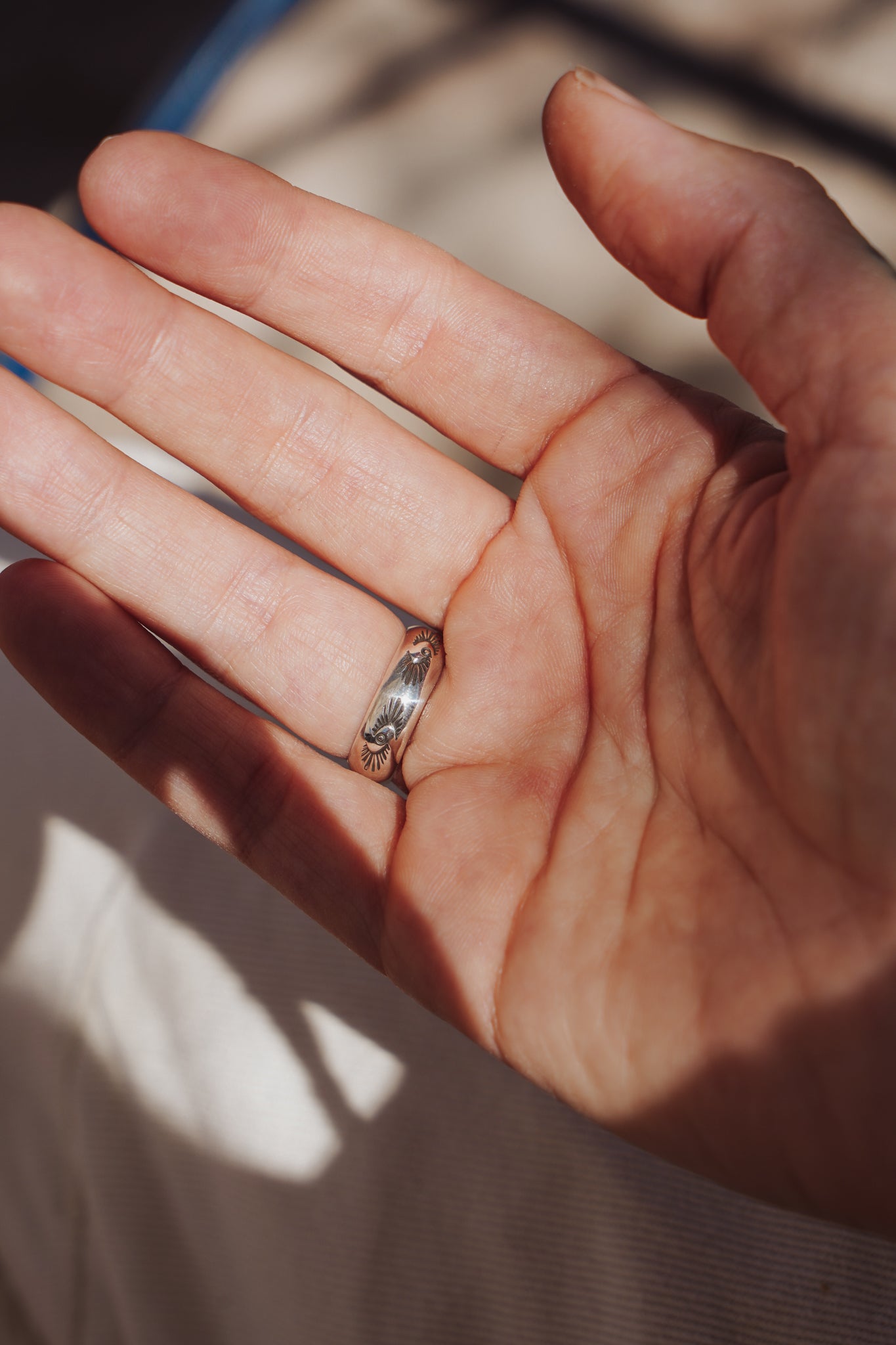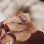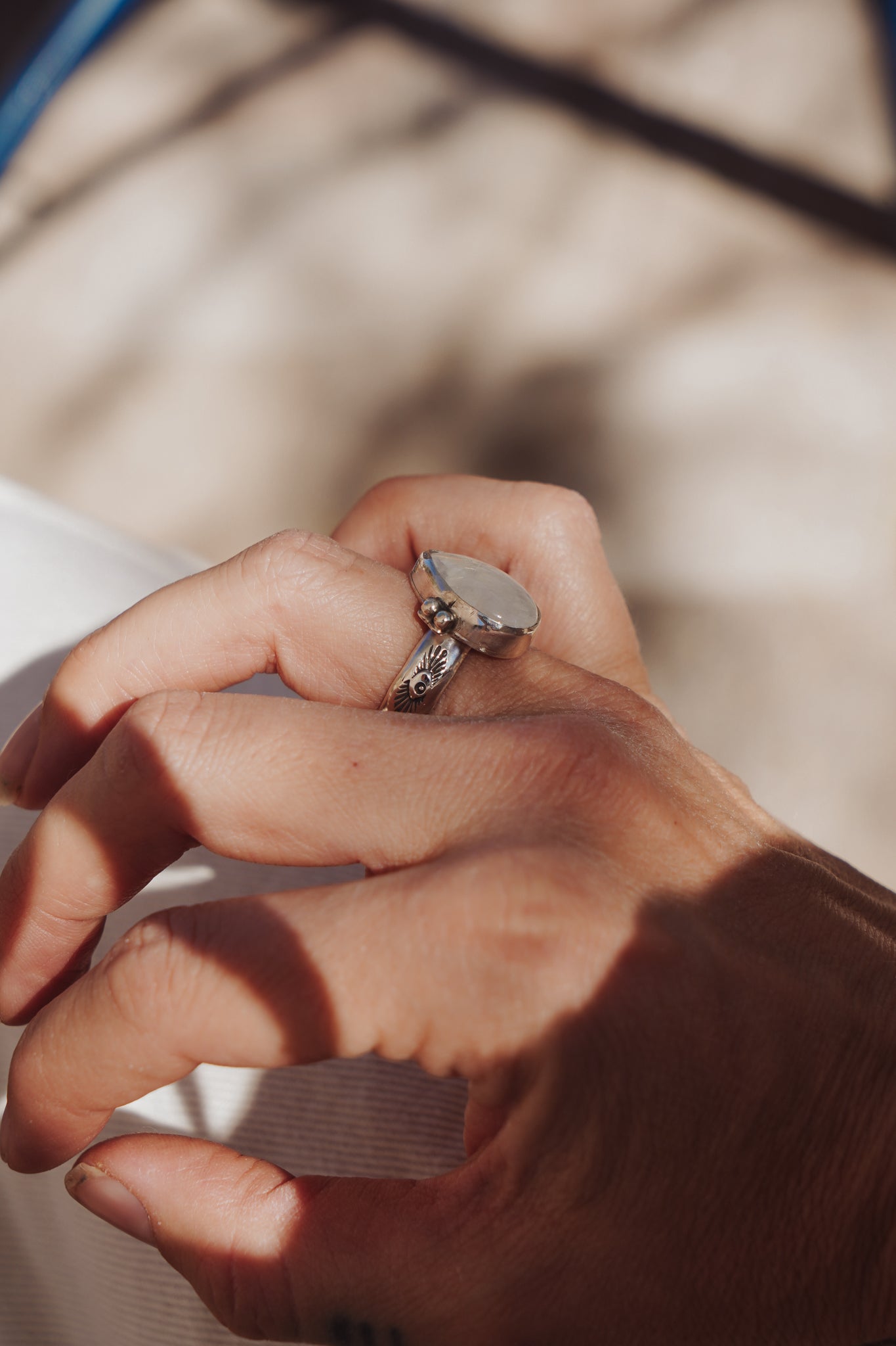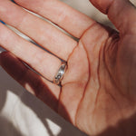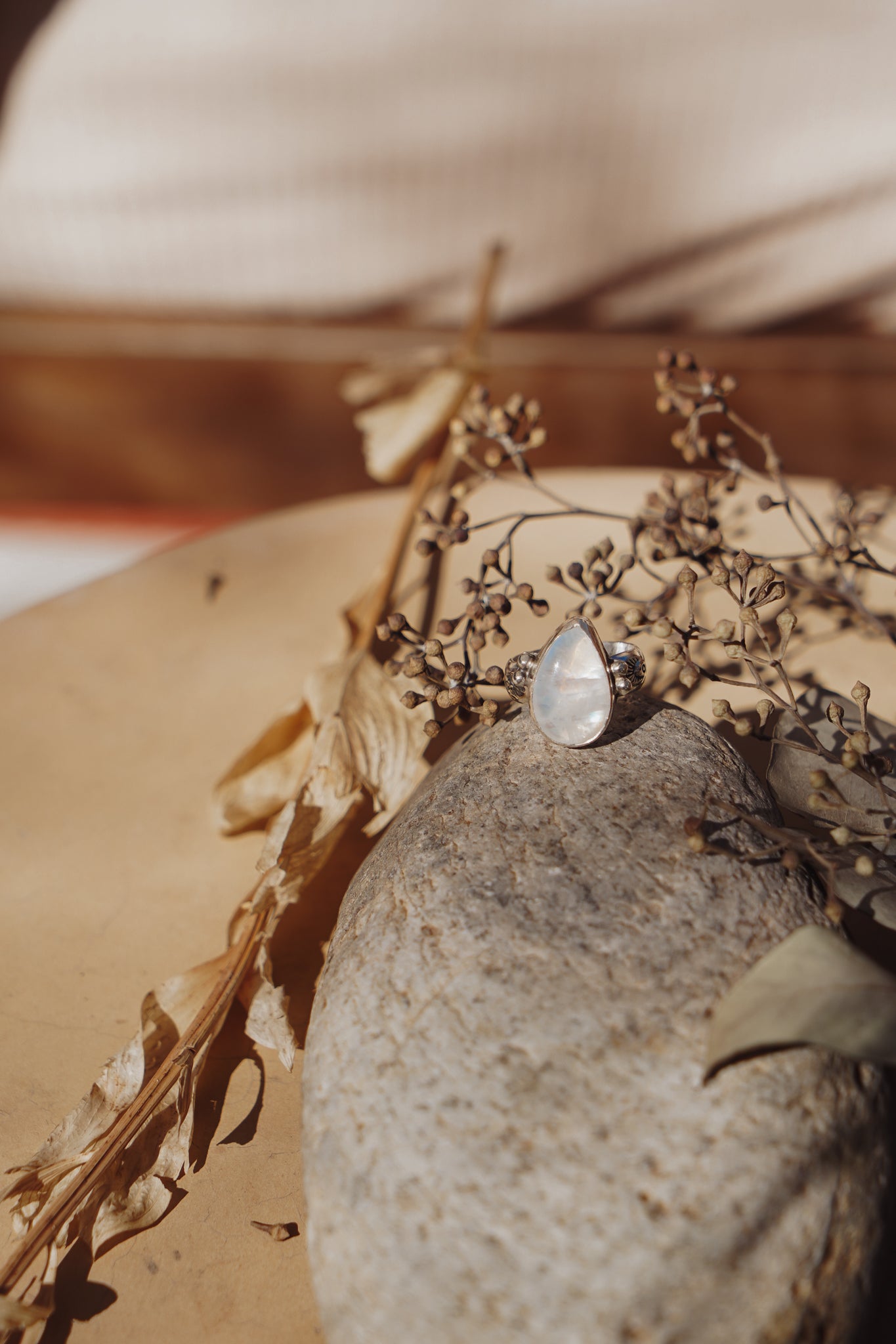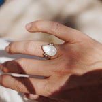 It doesn't get much better than Rainbow Moonstone- we love the way they flash in the light! We loved designing around this teardrop shaped stone with the ball elements and medium thickness, hand-stamped band. Can't wait to see who ends up with this beauty!