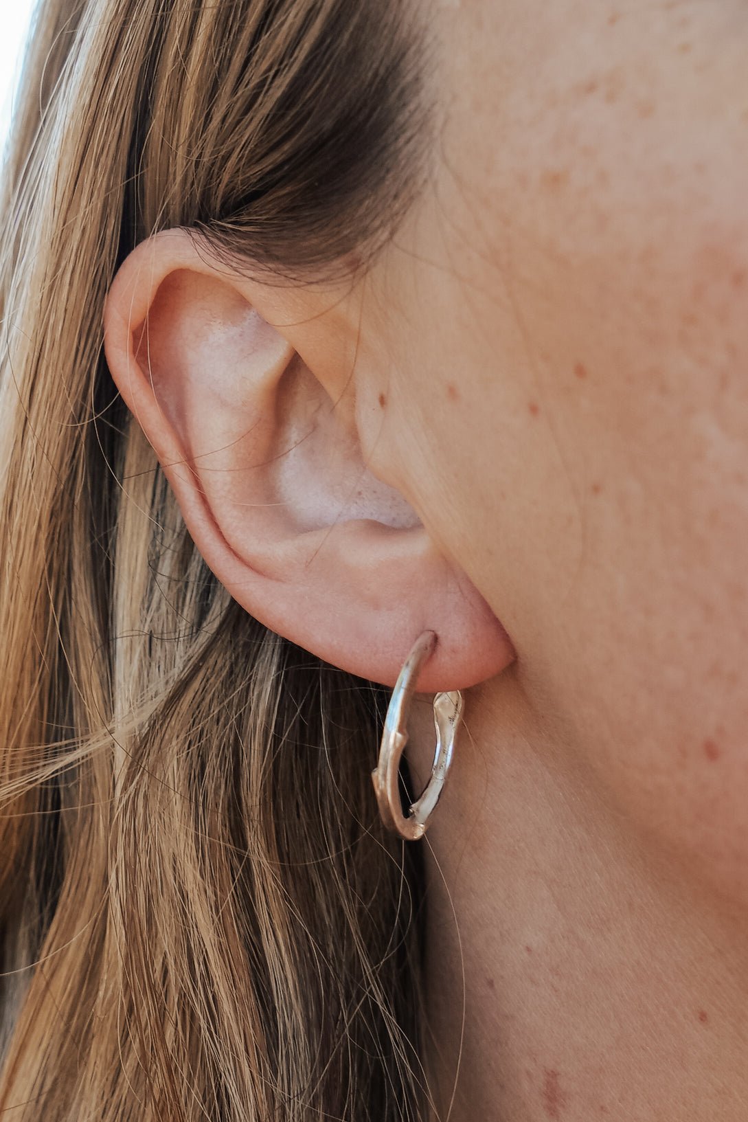 These new hoops have the organic shape and flow of a new sprouting twig. We're so excited to introduce this design into the collection. They're super light and comfortable. A great way to wear a bit of nature on your ear!