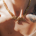 This bronze beauty is one of our favorite designs of the year! This gorgeous bird in flight with the chunky gold-plated chain are the perfect statement. We hope whoever wears it feels its free-spirit energy. Can't wait to see who ends up with this one!