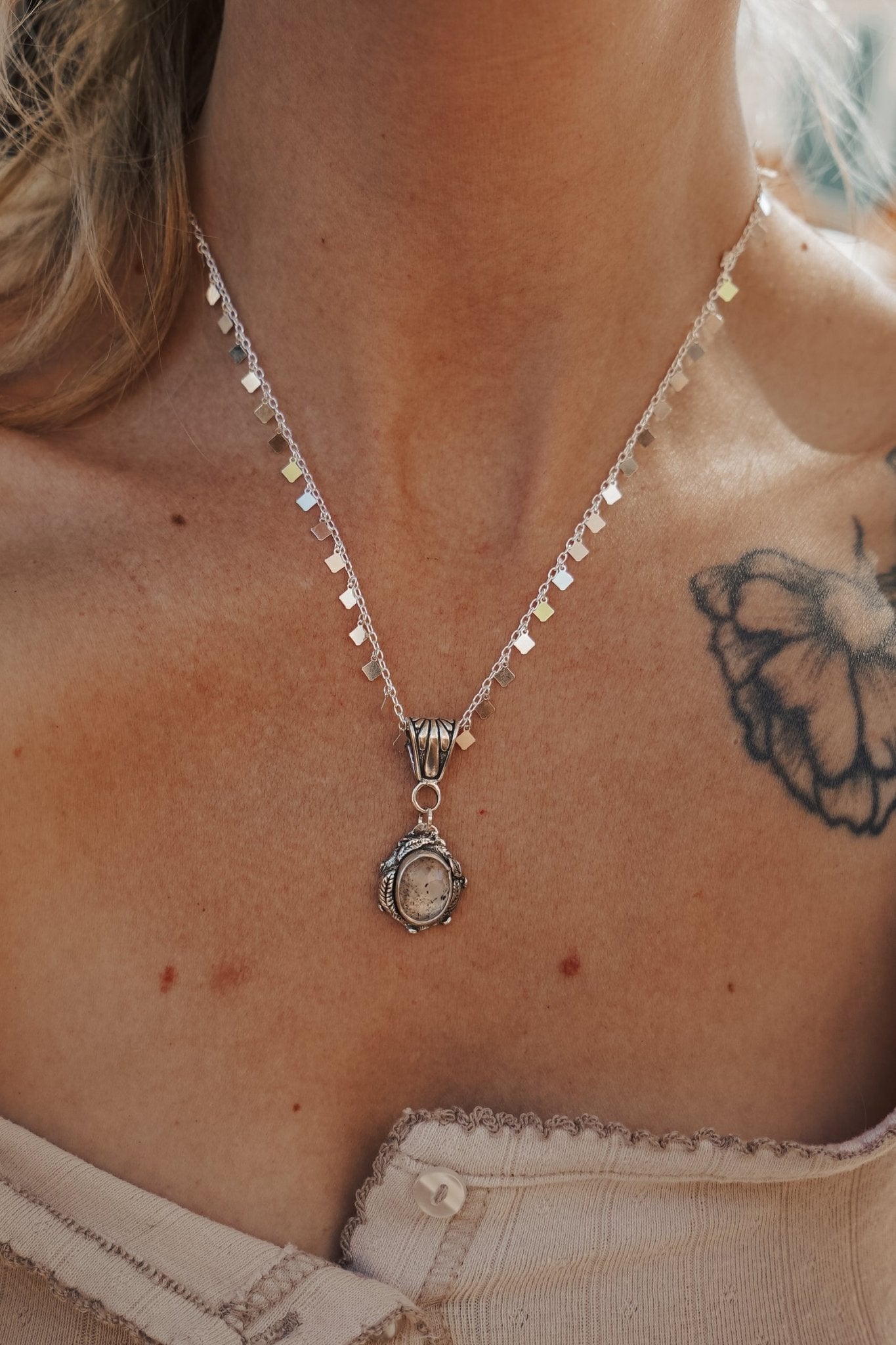 Check out the video to see the way this beauty shimmers in the light! We've had so much fun creating with a new process using .999 fine silver metal clay that we fire in our small kiln. We sculpted and carved this piece by hand from metal clay, fired it up, and this gorgeous pendant was the result. This stone, decorative bail, and disco ball chain all make magic in natural light.