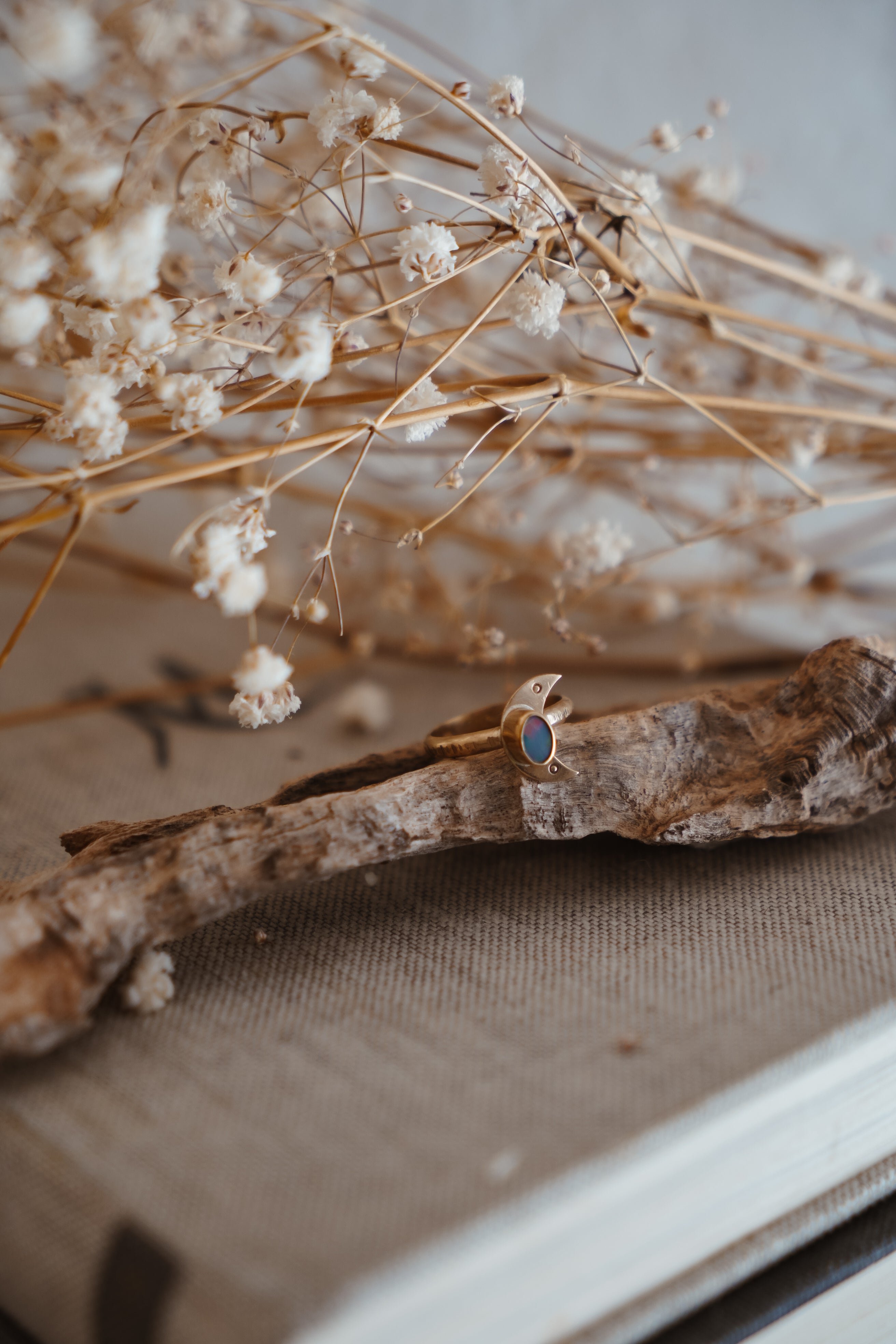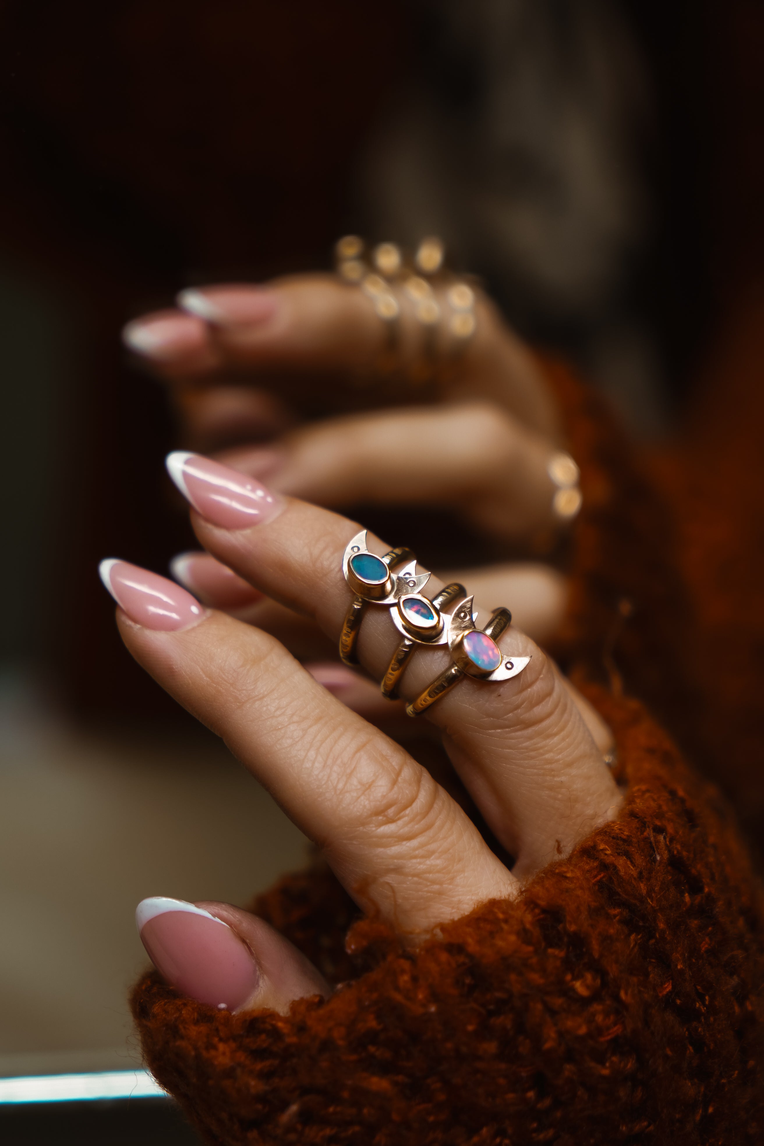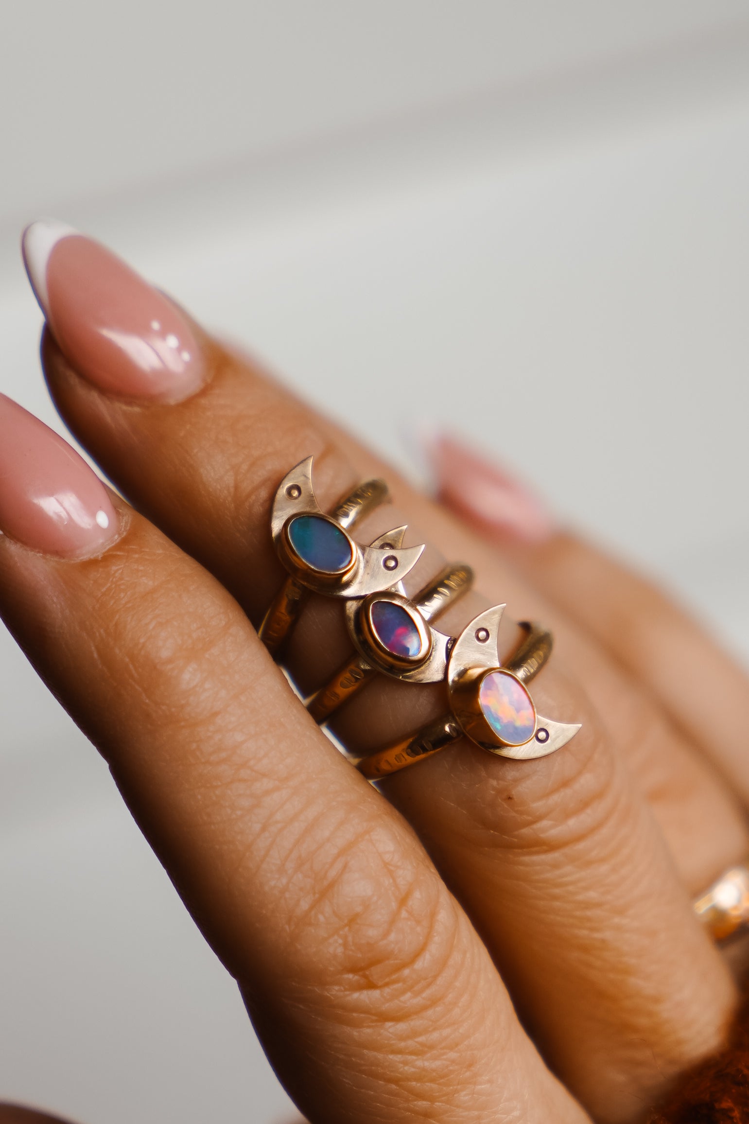 New design! This dainty moon shaped beauty has all the magic with these flashy boulder opals. Put them in the light and watch them shimmer! We had a vision for this design and they exceeded our expectations. Can't wait to see who ends up with this beauty!