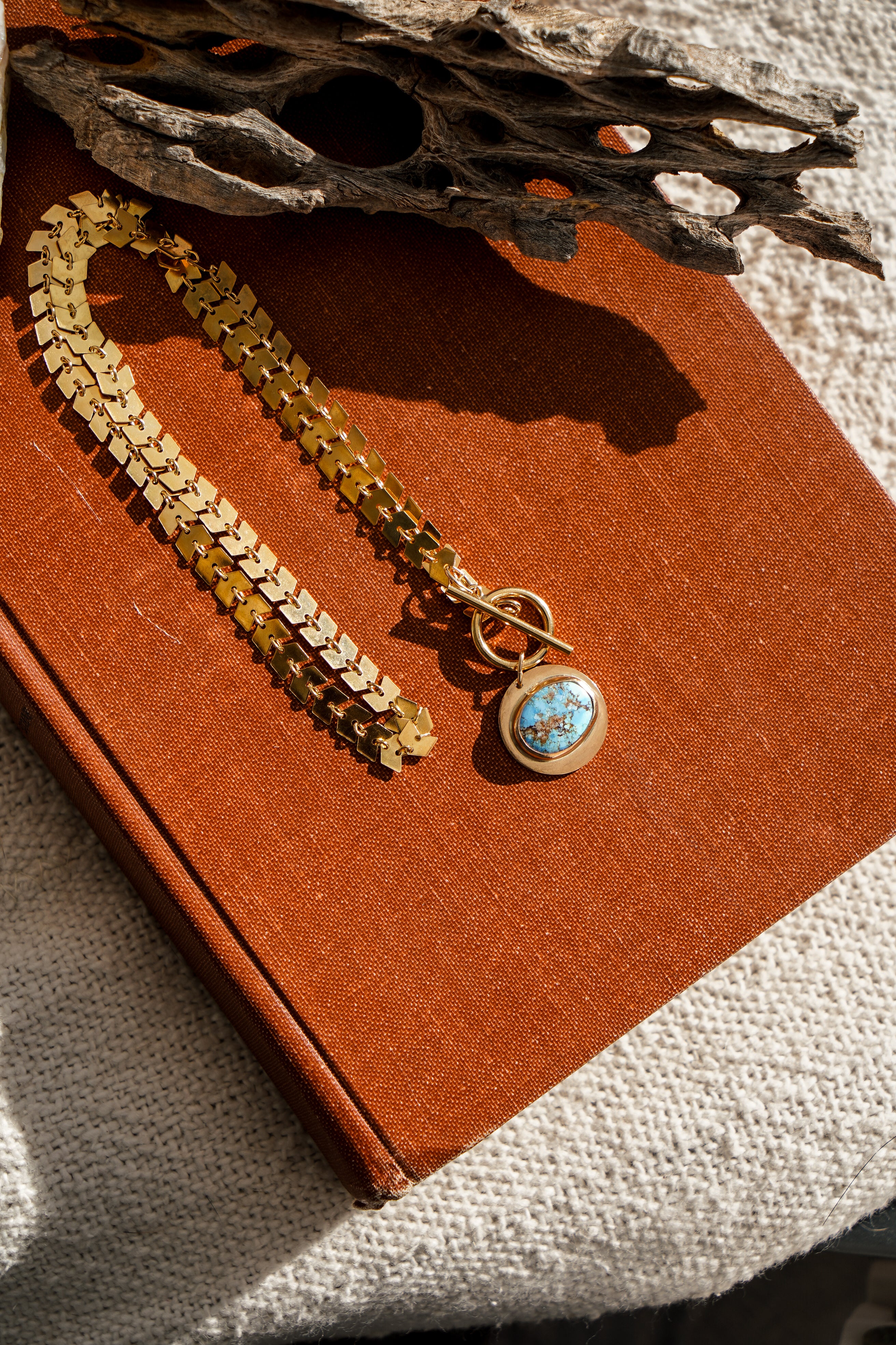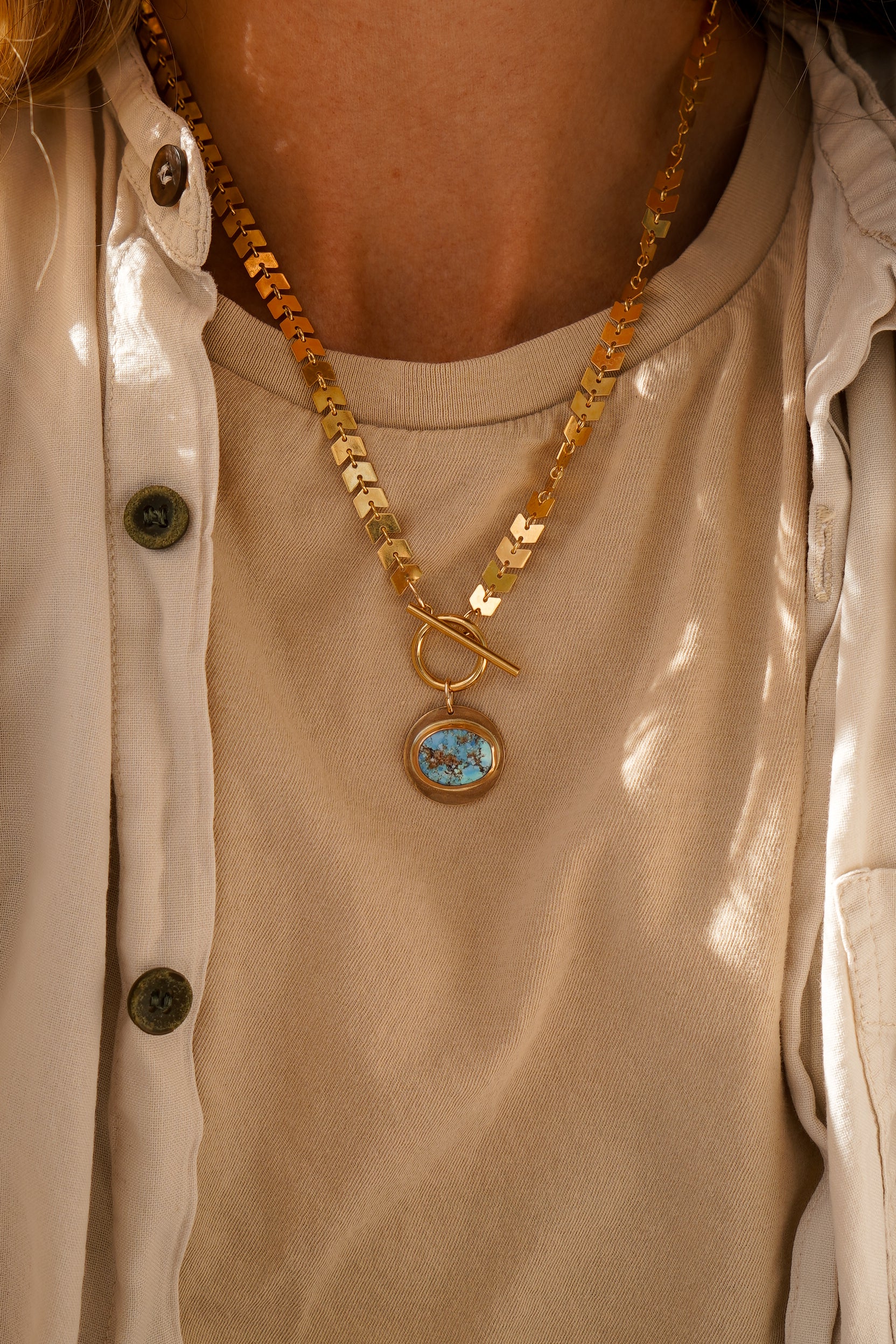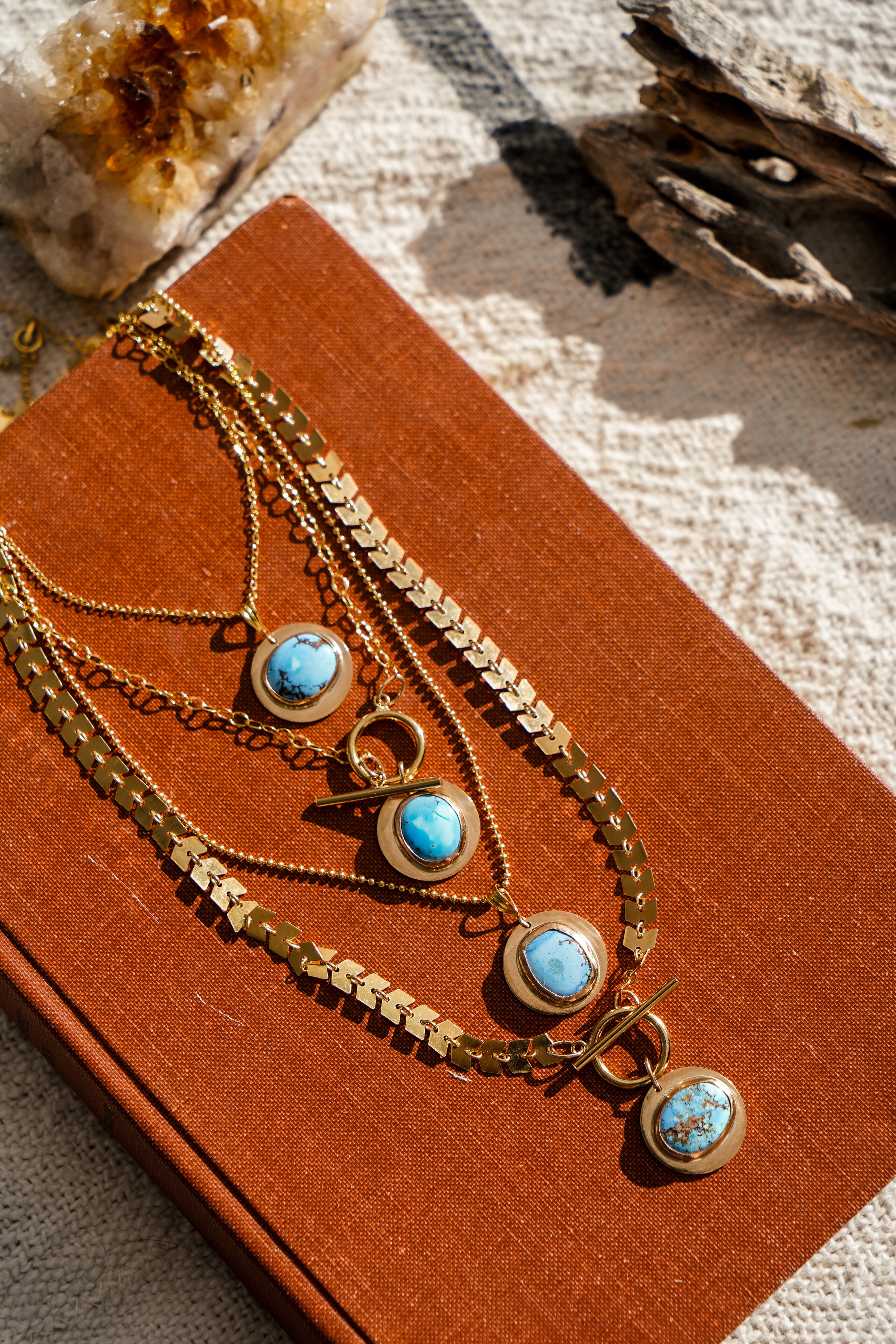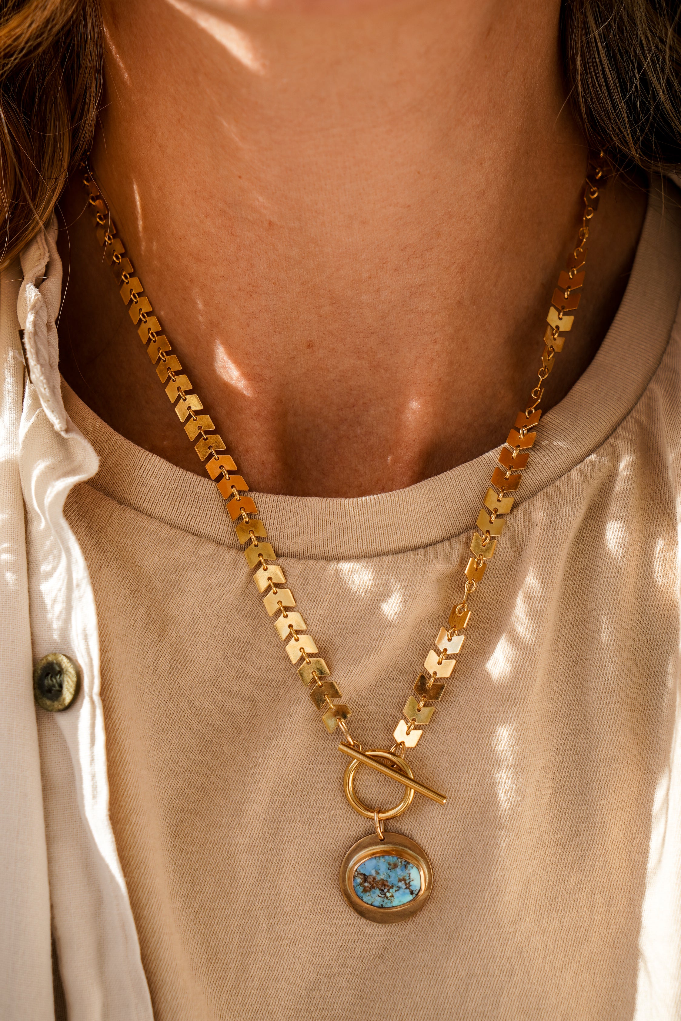 This gold-fill chain and pendant is such a vibe with this lovely light blue Golden Hills stone. The arrow chain and front toggle clasp add a unique flair to this one. We've been so excited about all the great feedback we got from you guys on these gold-fill necklaces. This is a piece that can be worn with a dress for a special occasion or just as easily for casual everyday wear. Can't wait to see who ends up with this it!