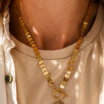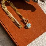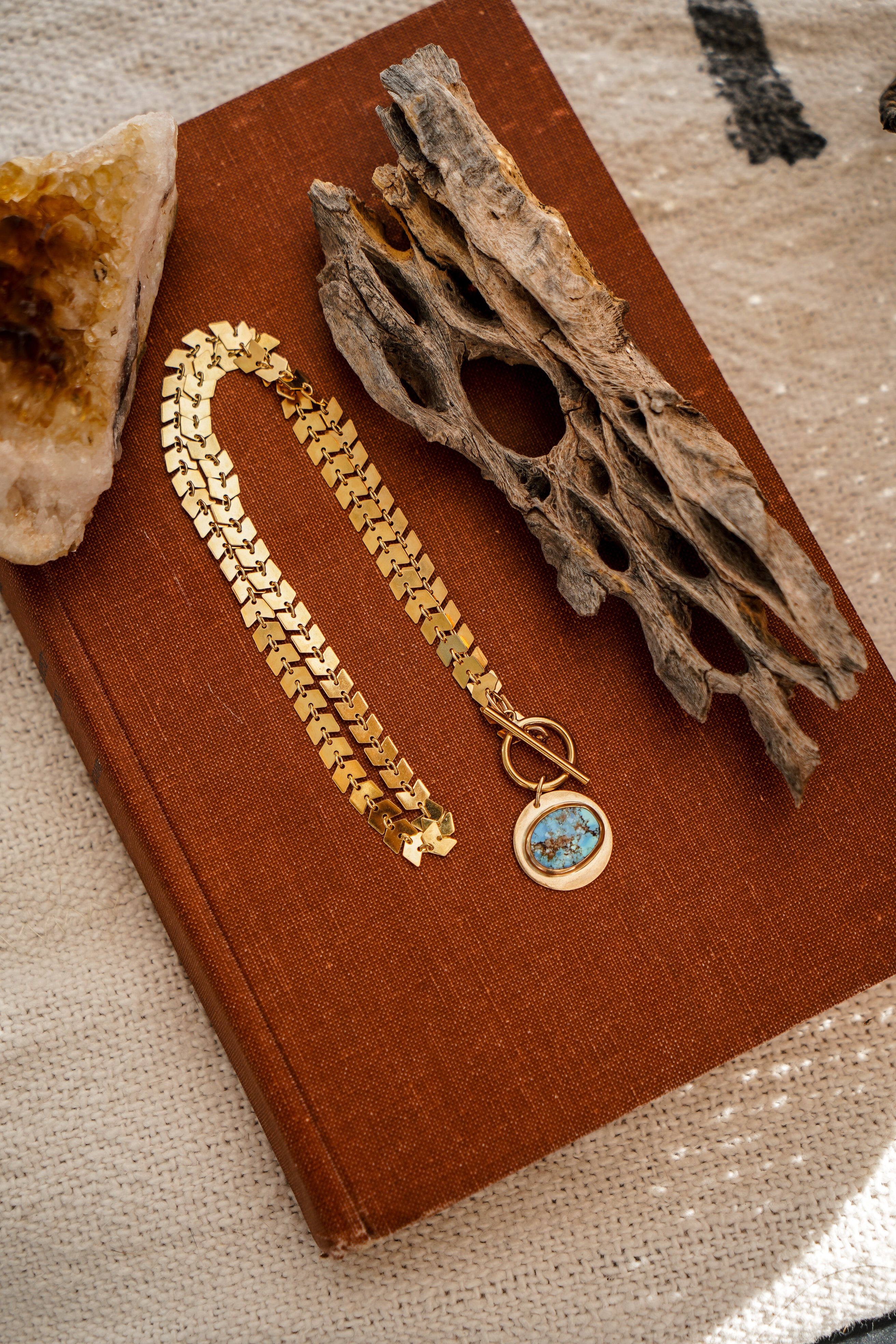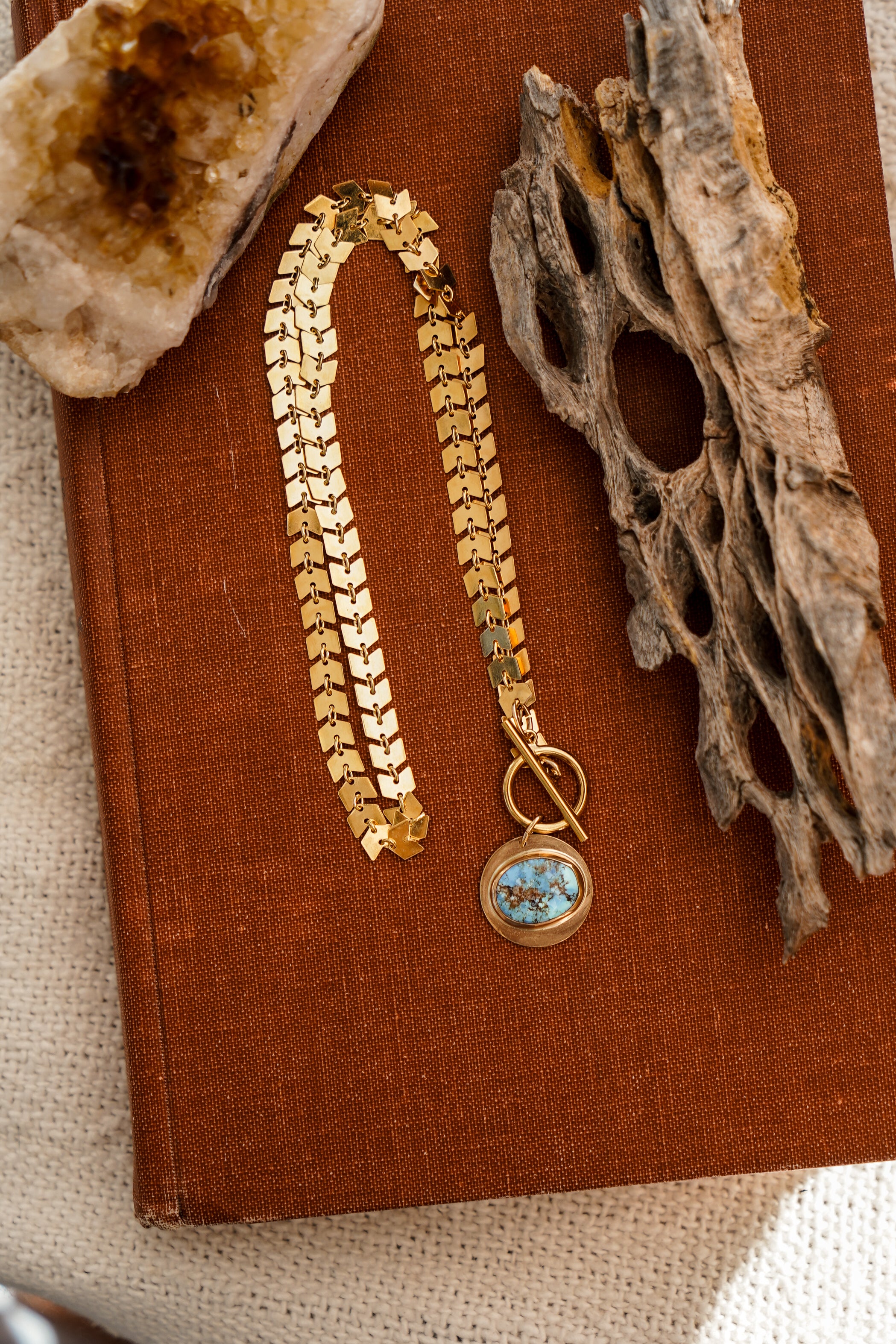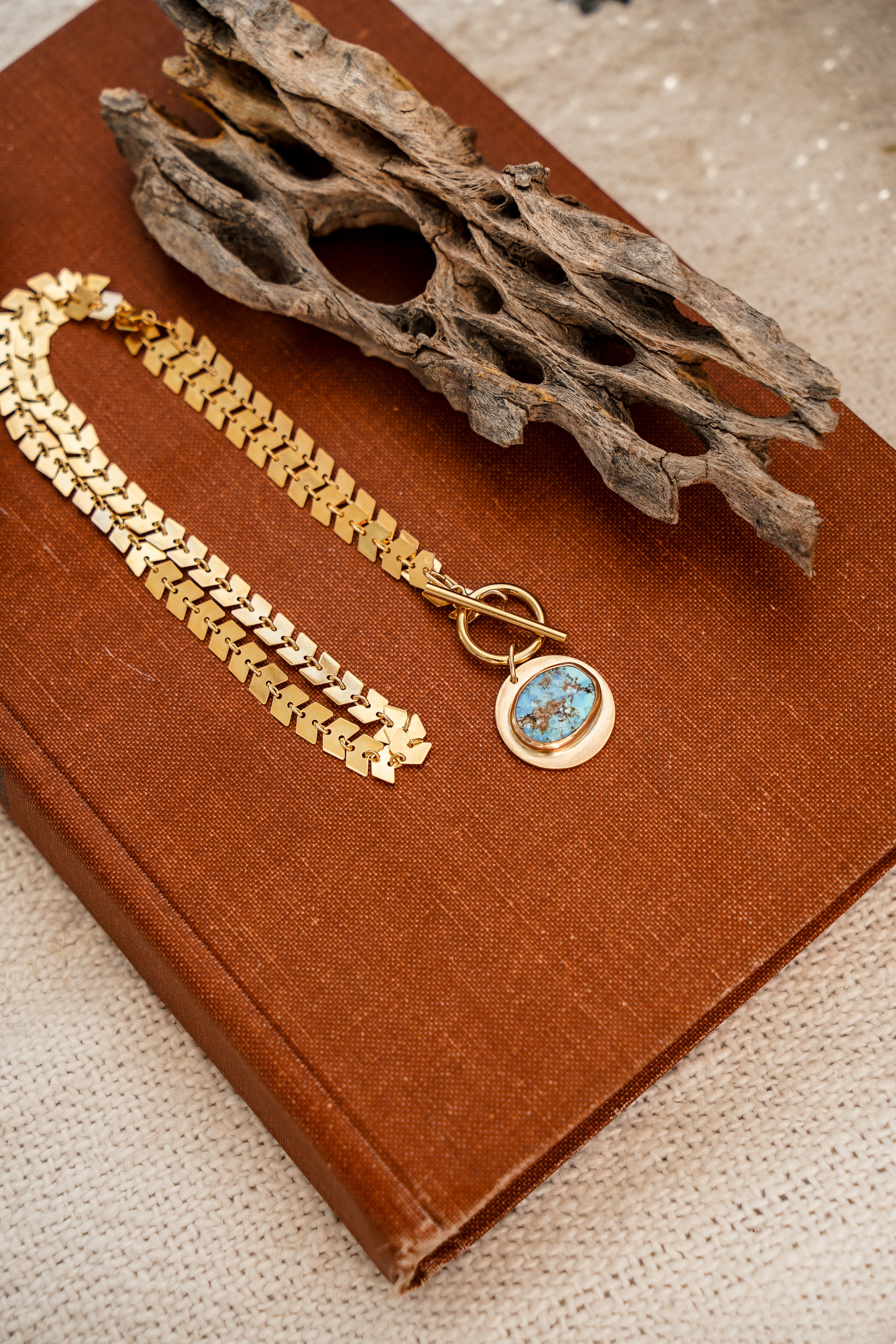 This gold-fill chain and pendant is such a vibe with this lovely light blue Golden Hills stone. The arrow chain and front toggle clasp add a unique flair to this one. We've been so excited about all the great feedback we got from you guys on these gold-fill necklaces. This is a piece that can be worn with a dress for a special occasion or just as easily for casual everyday wear. Can't wait to see who ends up with this it!