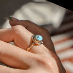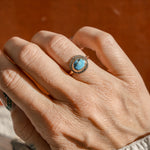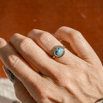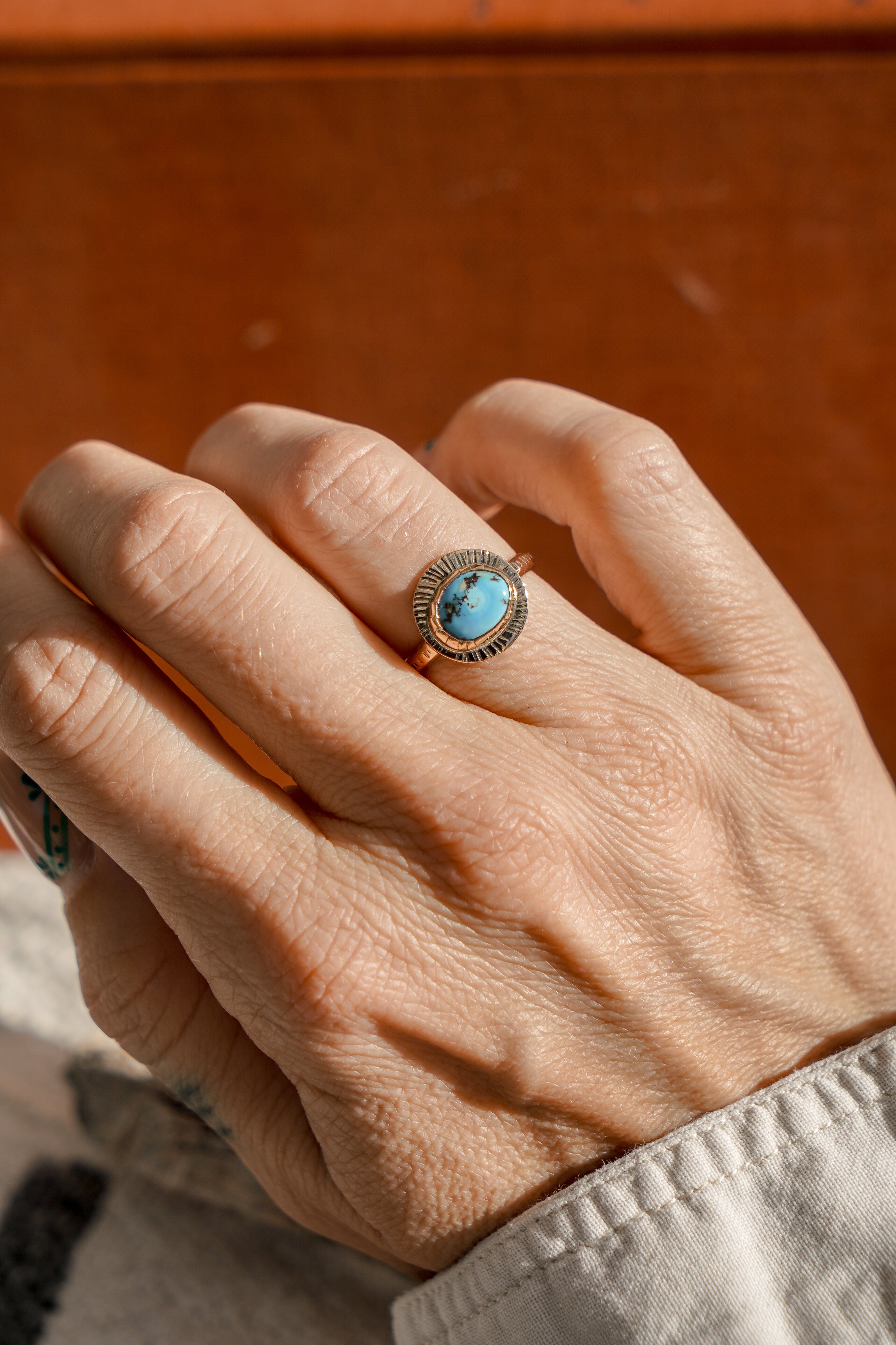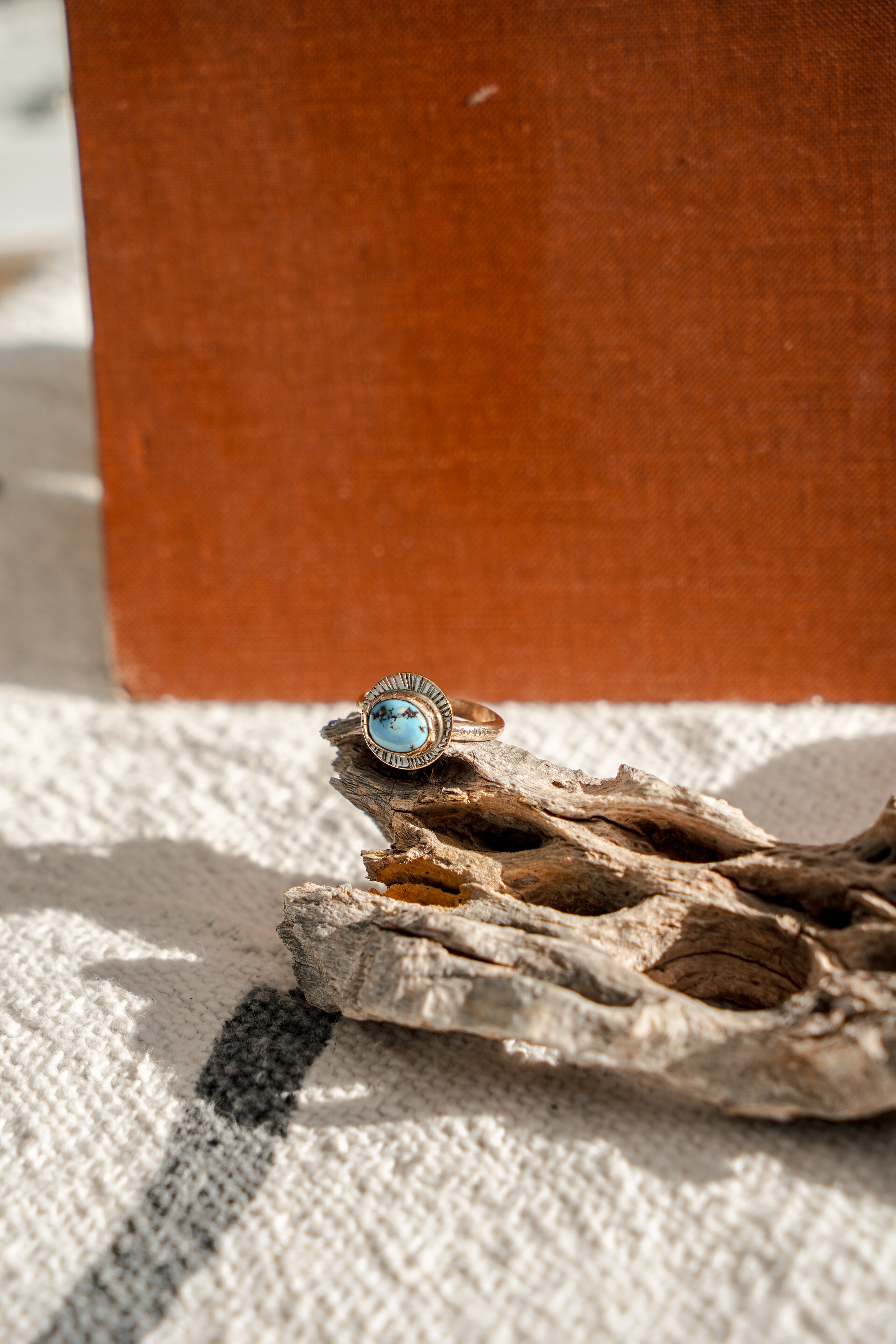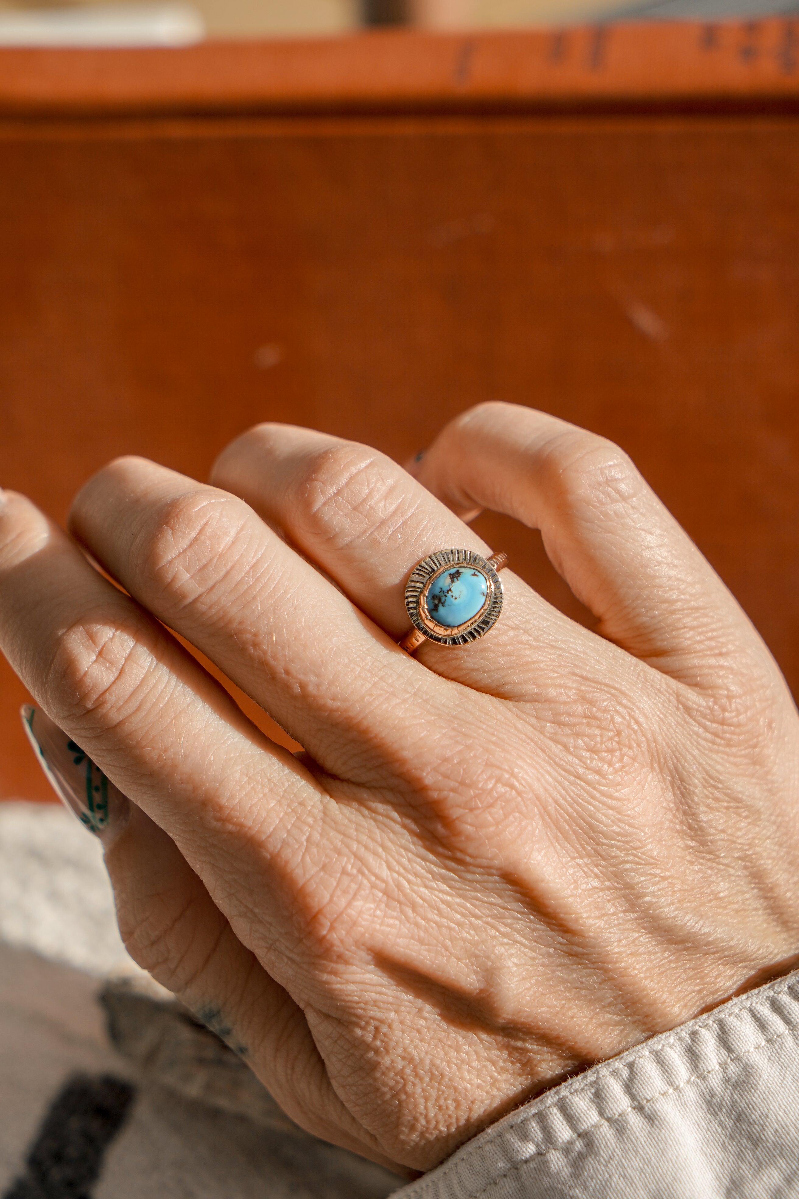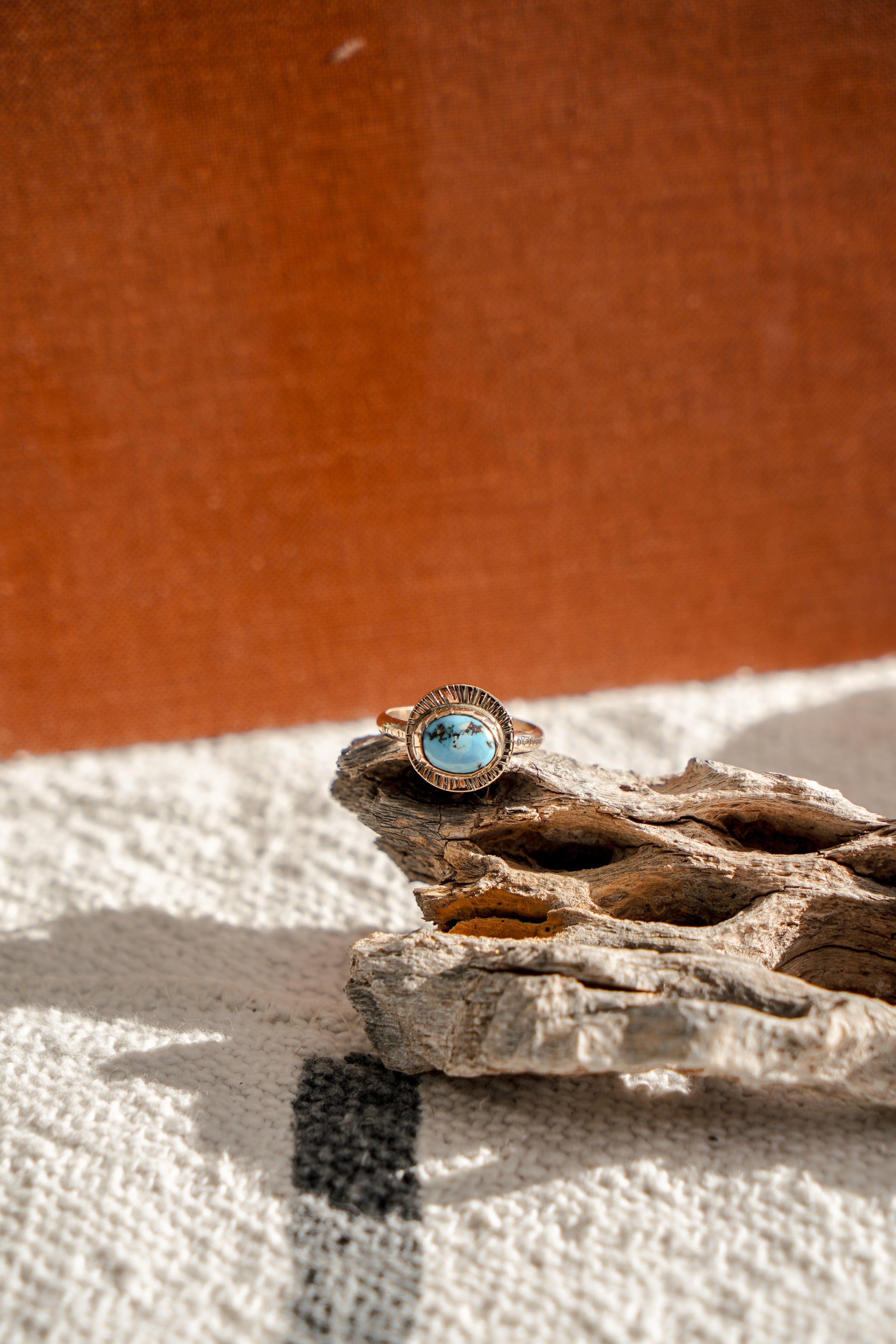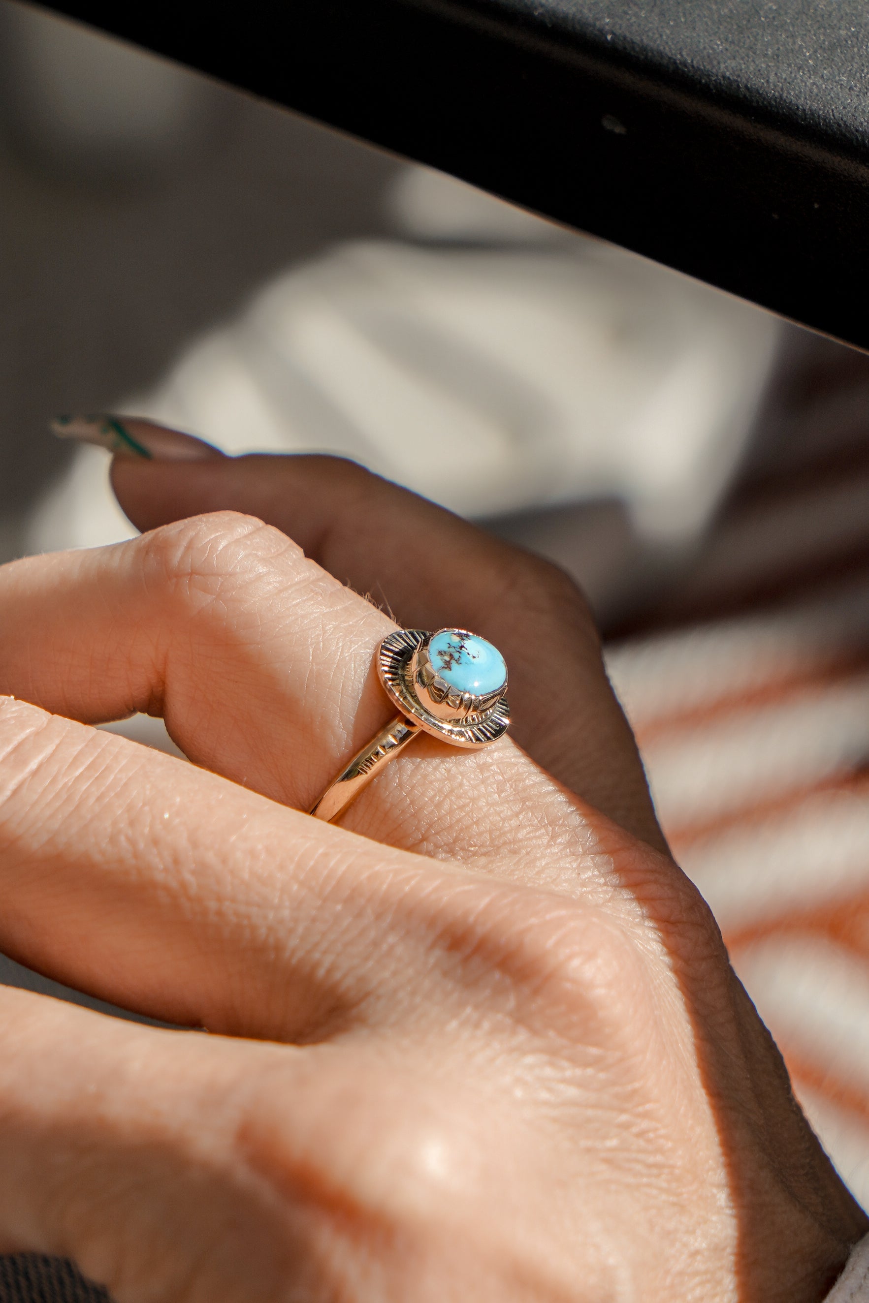 We've loved working with 14k gold-fill in recent collections and were so excited when you guys asked for more! Well, here you go. This dainty 14k gold-fill ring with hand stamped sun rays has us drooling. The light blue and matrix of this high-quality Golden Hills Turquoise makes this piece truly one-of-a-kind.
