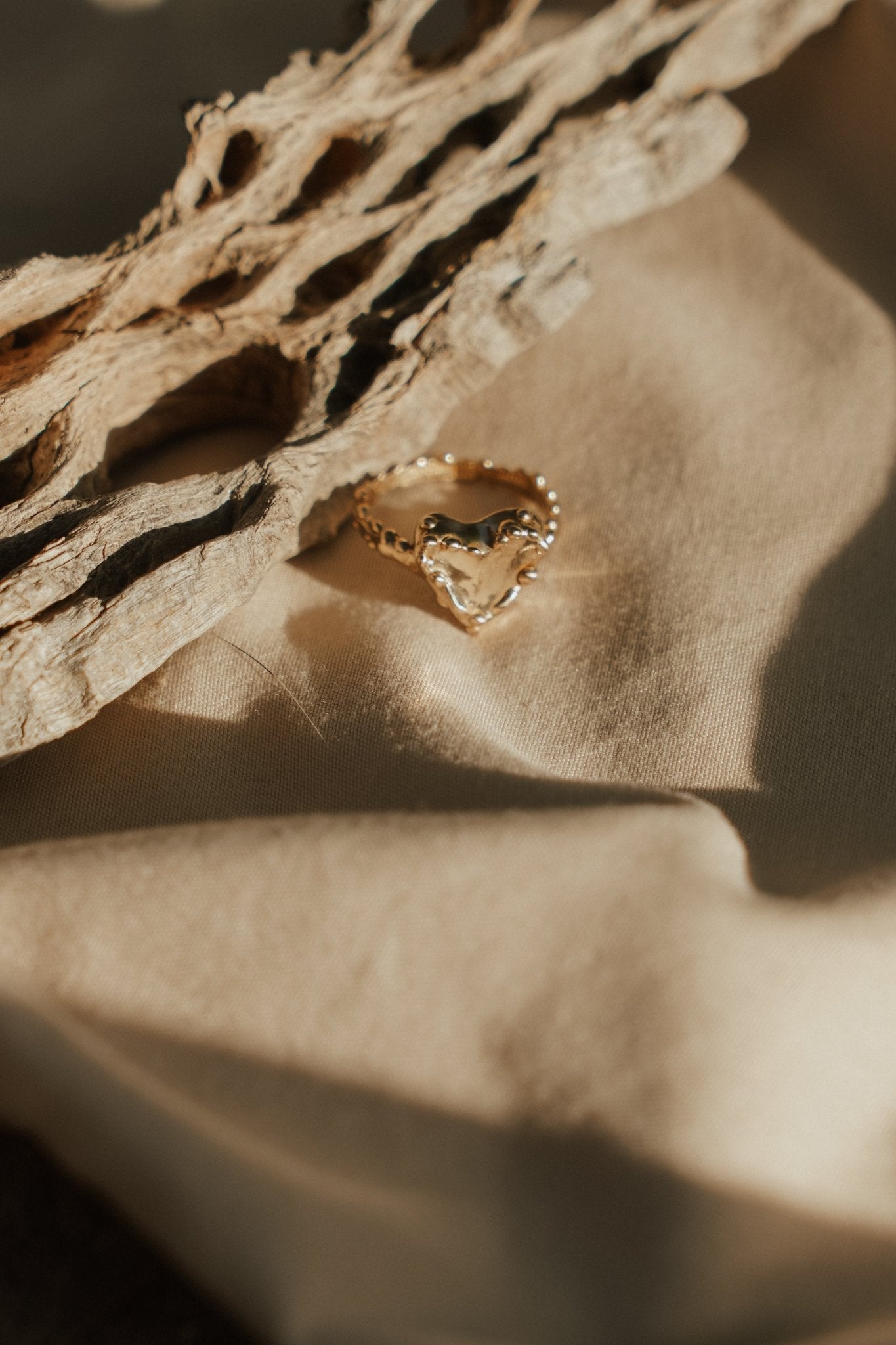 The Rooted Love Ring features a delicate heart design inspired by natural forms and textured details. Its intricate craftsmanship evokes the organic beauty of intertwined roots, symbolizing enduring connection and growth.
