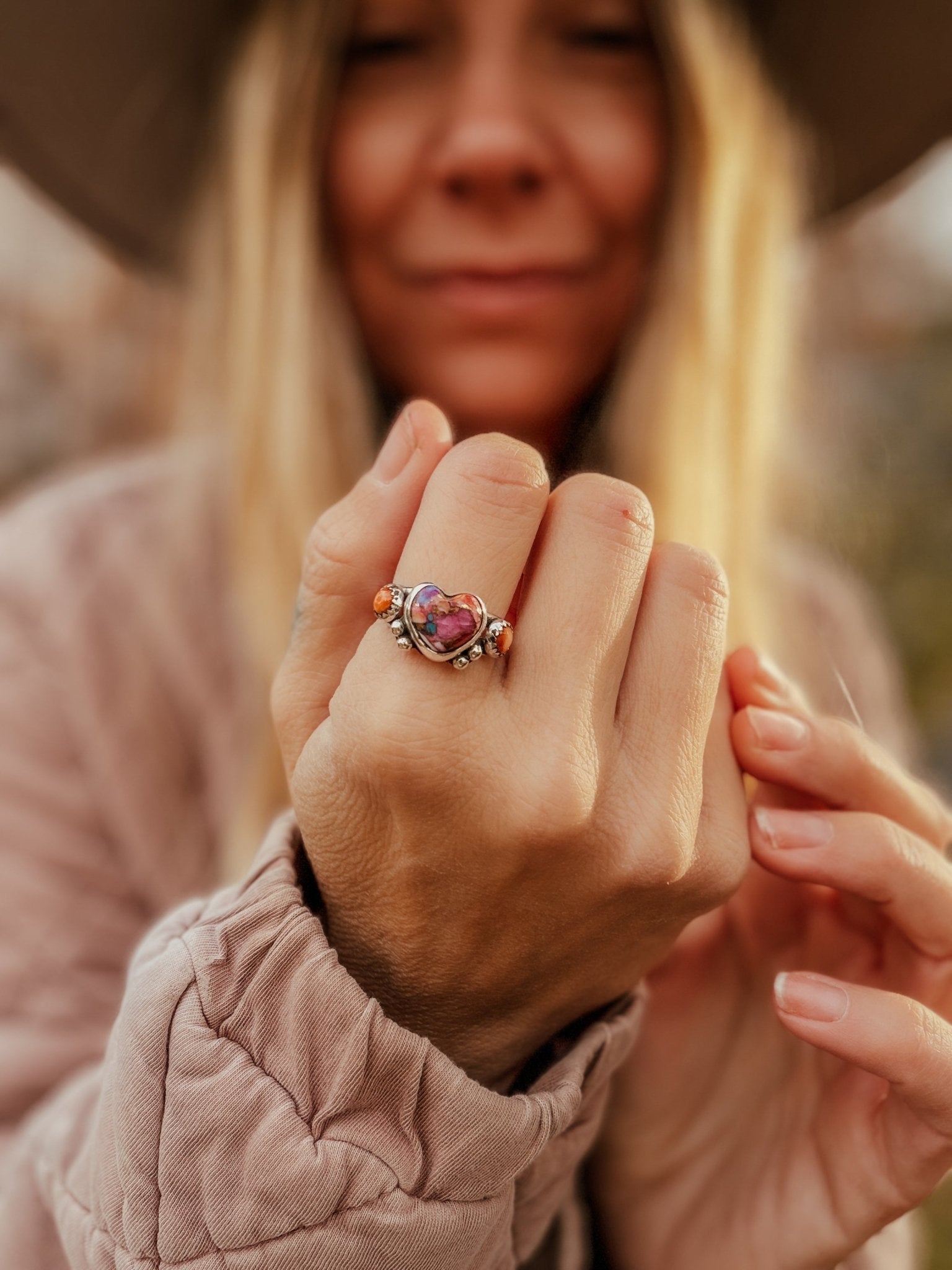 We're so glad you guys have been loving the heart ring designs and we're so excited to make them available in this beautiful Pink Dahlia stone with Spiny Oyster stones on the band. They were crafted with care and intention with the hope that they'll serve as a symbol and reminder of the ones you love, of love itself, of beauty- whatever you need it to be for you.