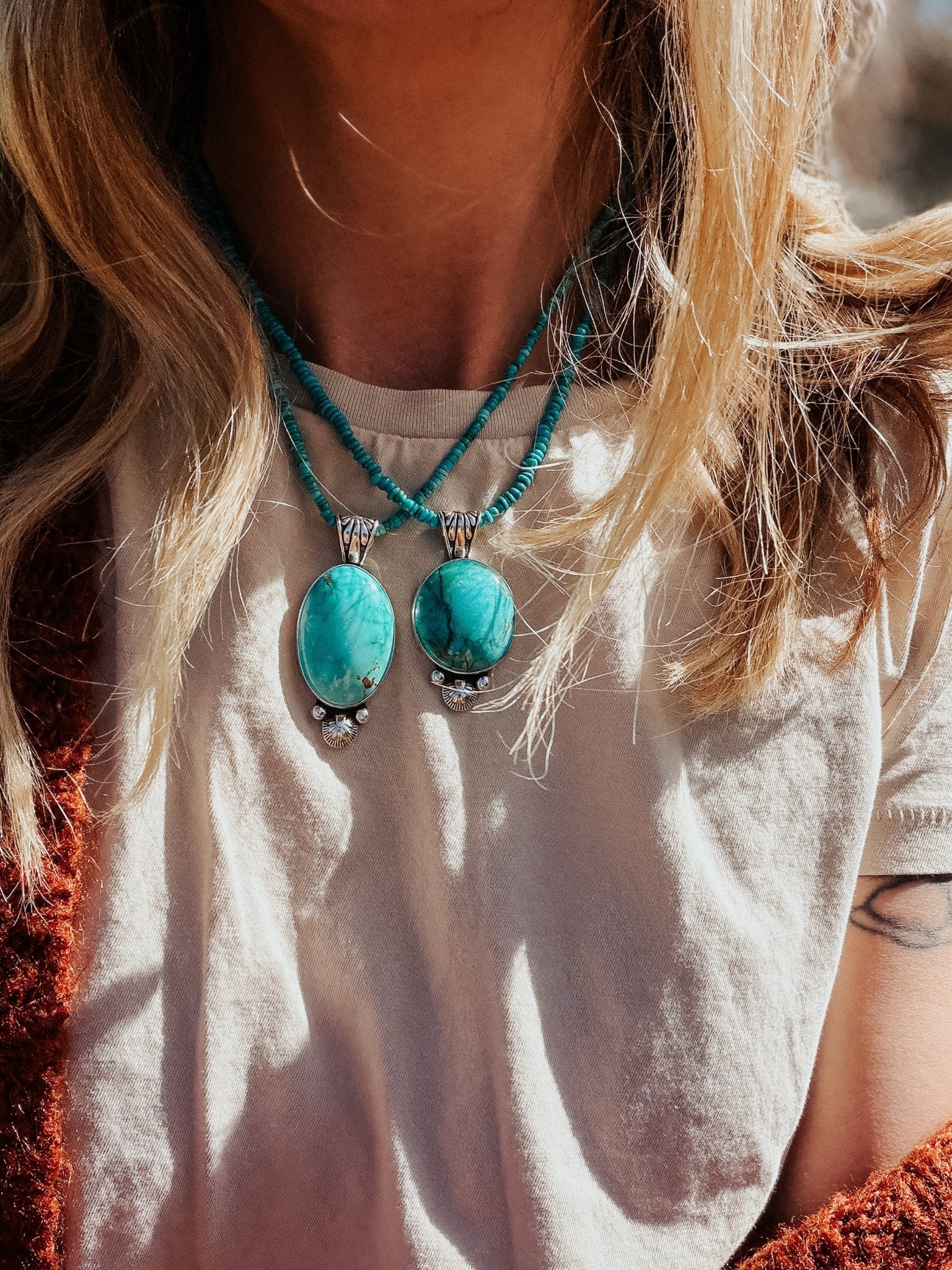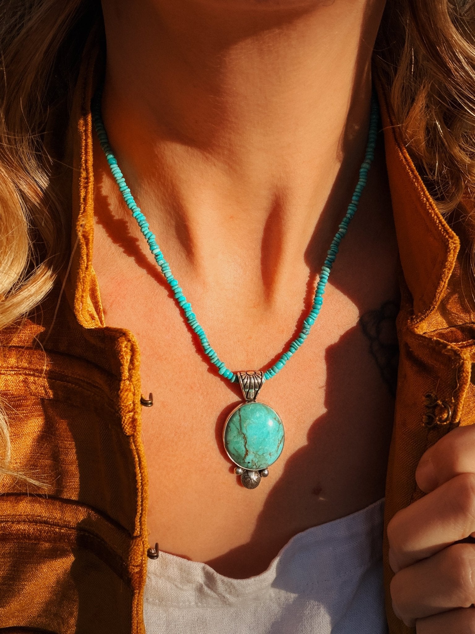 Pendant in Royston Turquoise w/ Turquoise Bead Chain - Golden Road Crafted