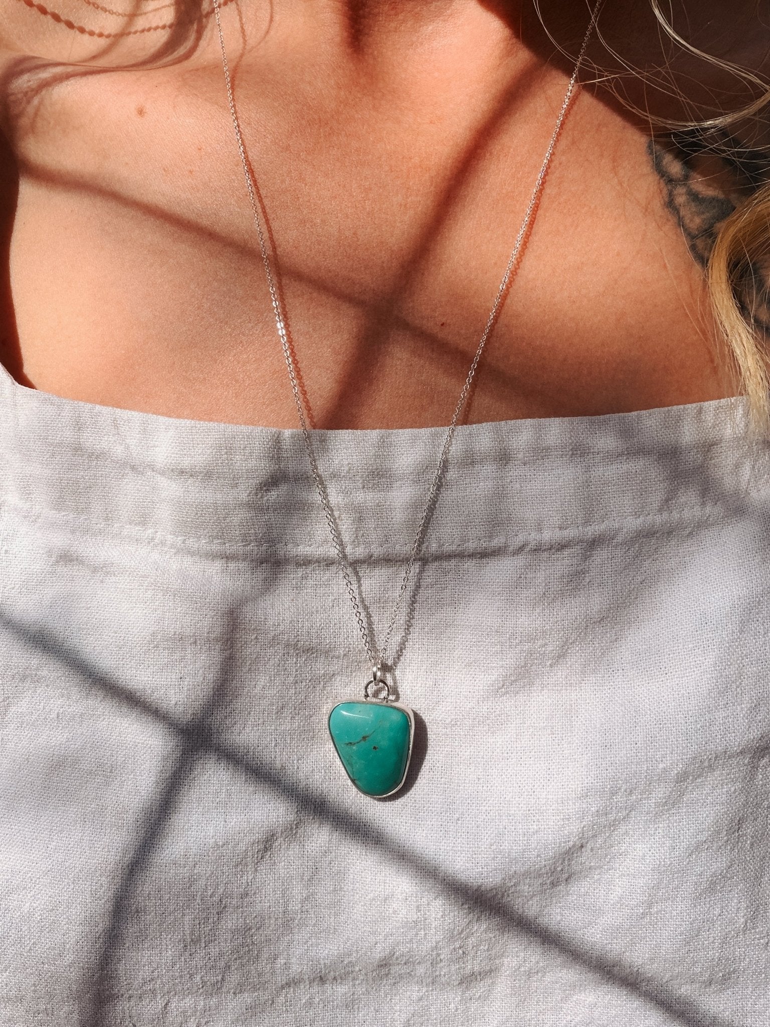 This turquoise is so gorgeous we wanted to let it do all the talking in a simple, straightforward piece. This lovely pendant was the outcome. Can't wait to see who gets this one!