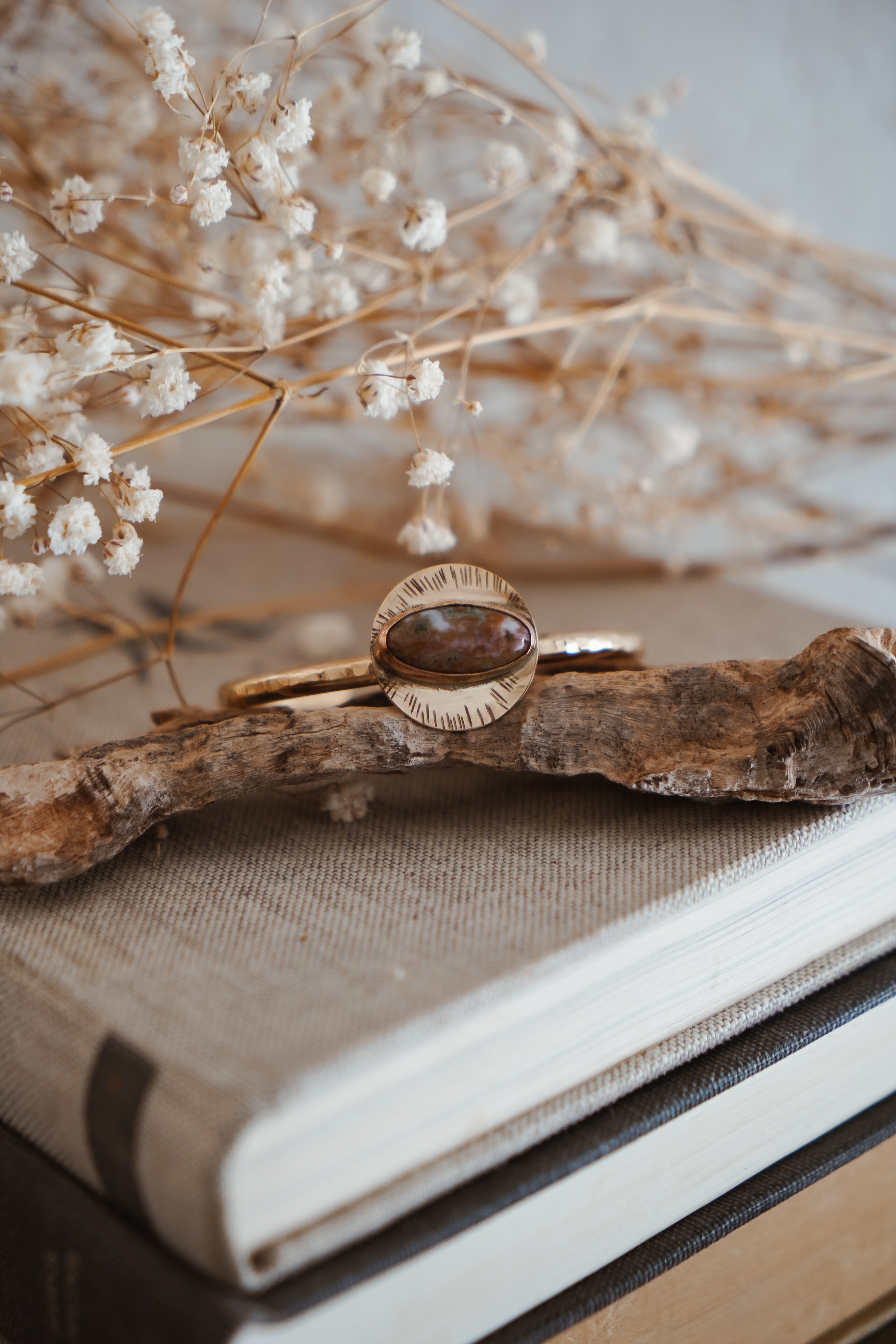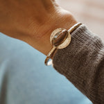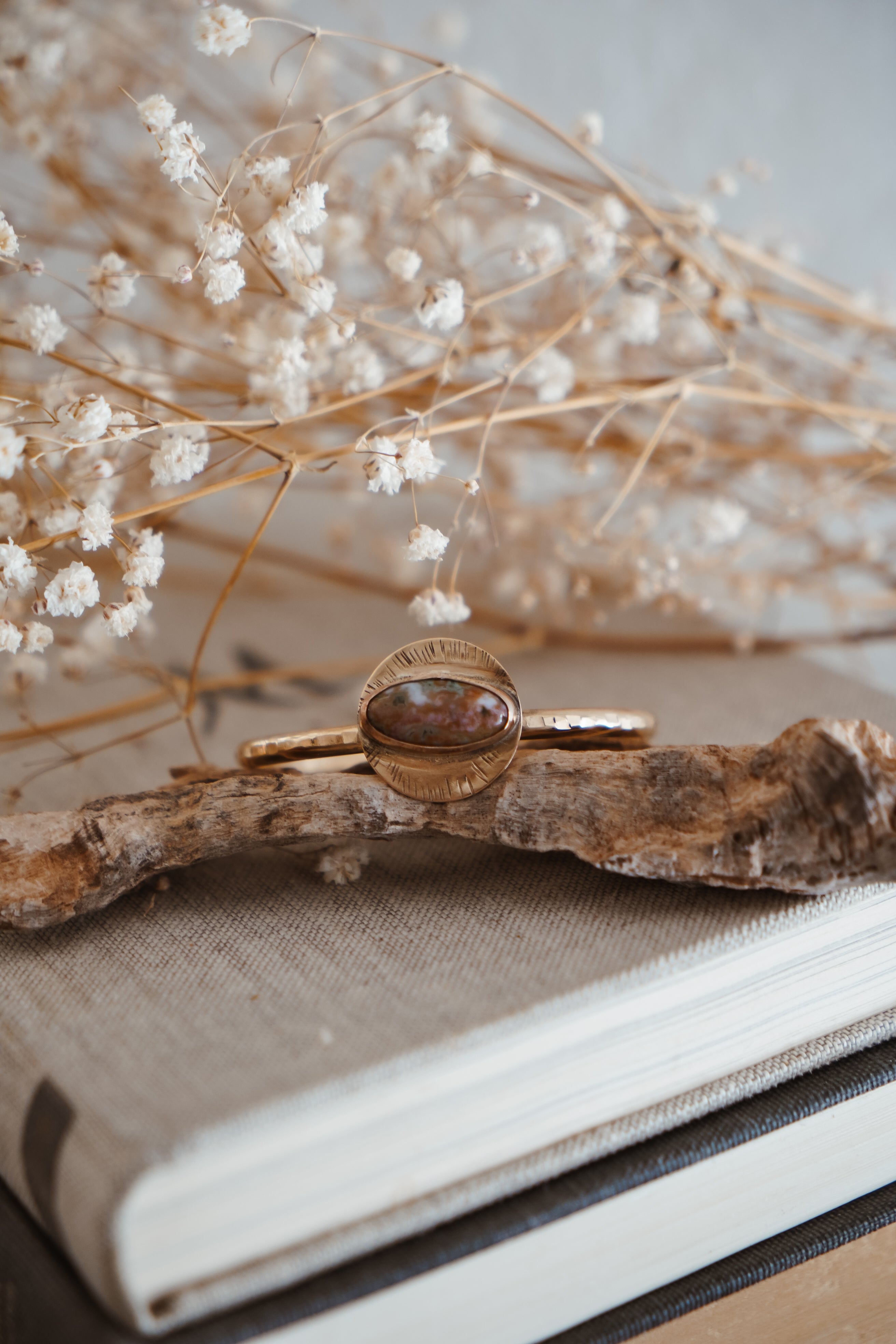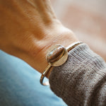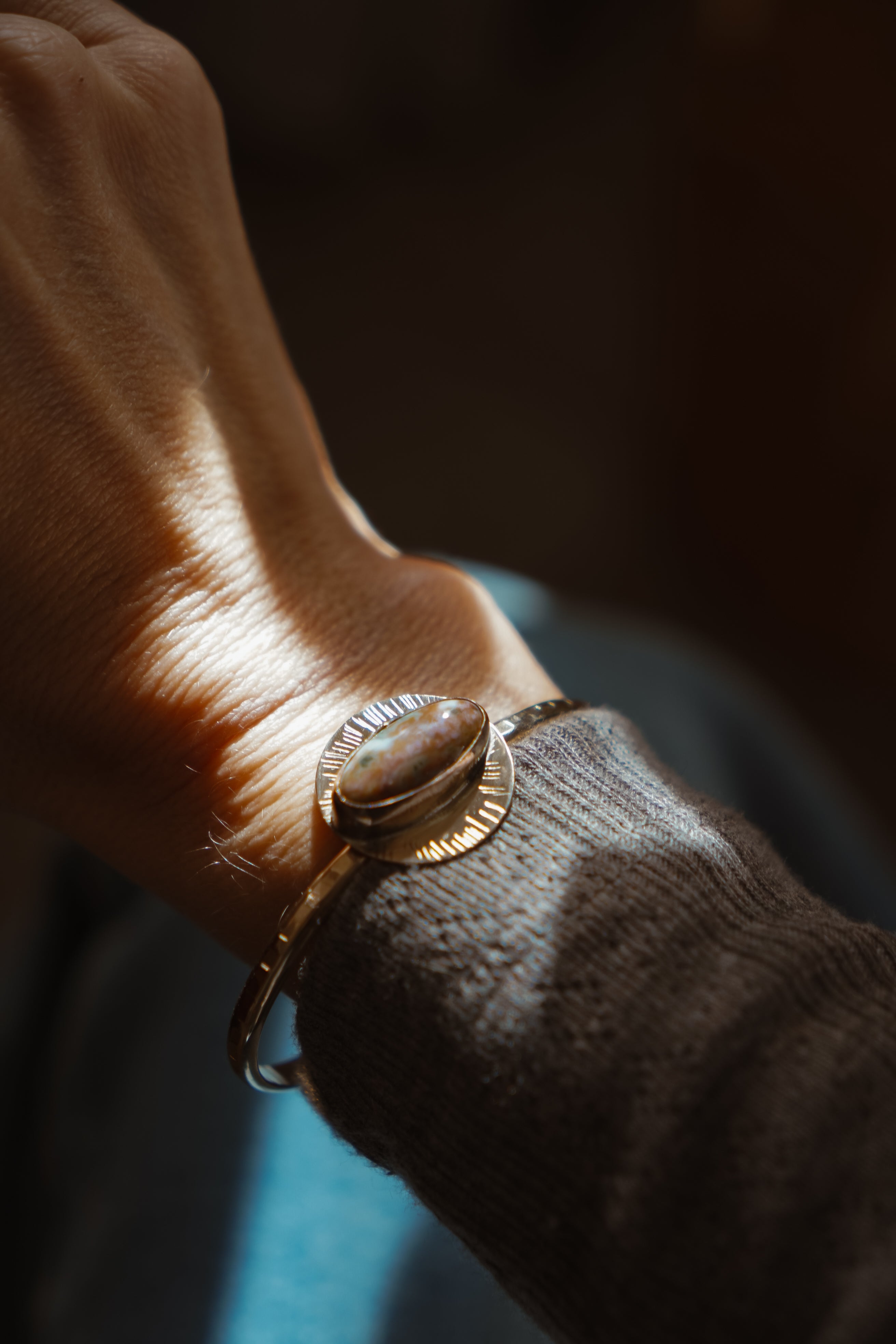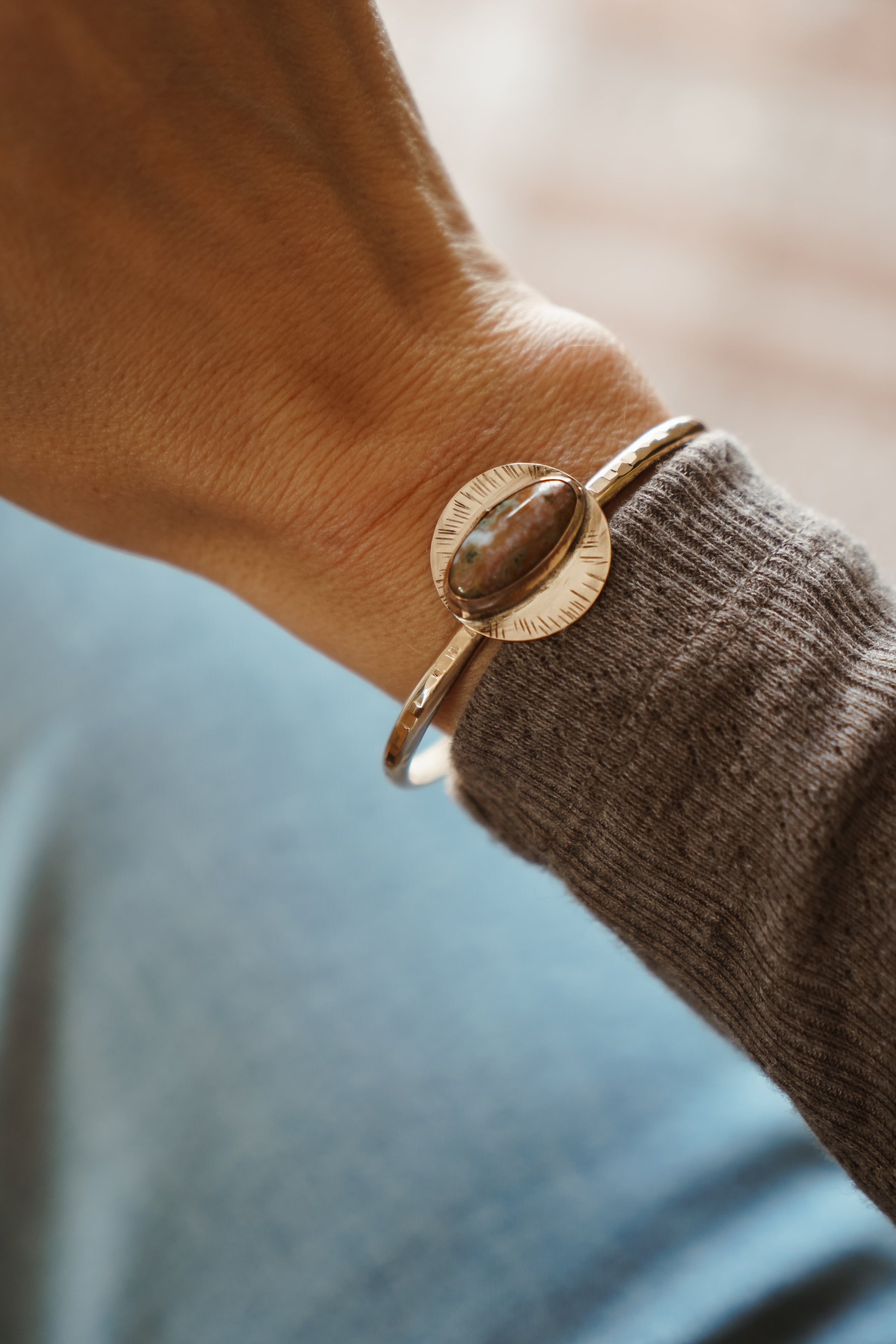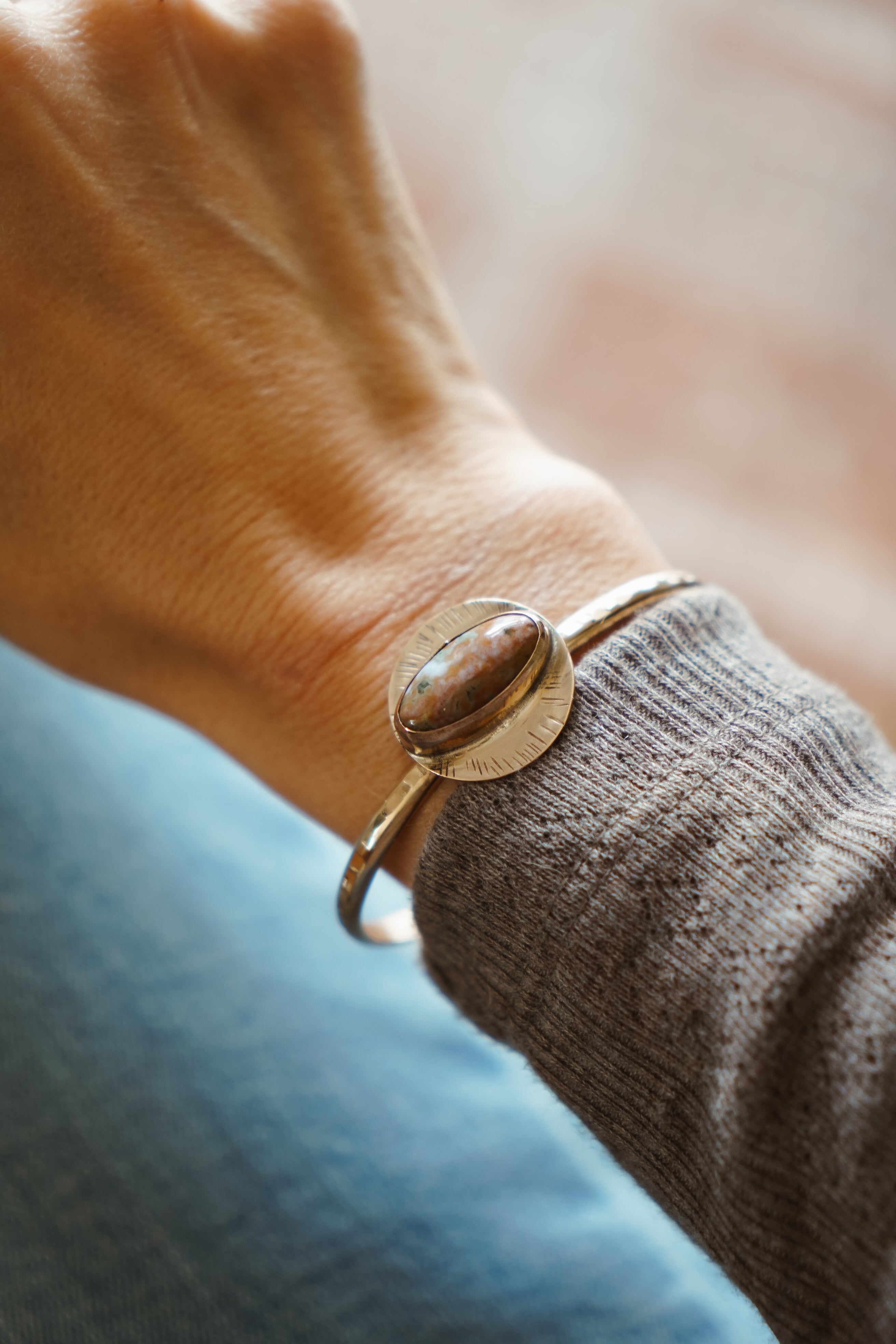 These are the first gold-fill cuffs we've ever made and we couldn't be more excited with how they turned out! The gold with Ocean Jasper combo gives such amazing earthy vibes. We've just been staring at these pictures for days. Can't wait to see who ends up with this one!