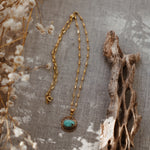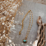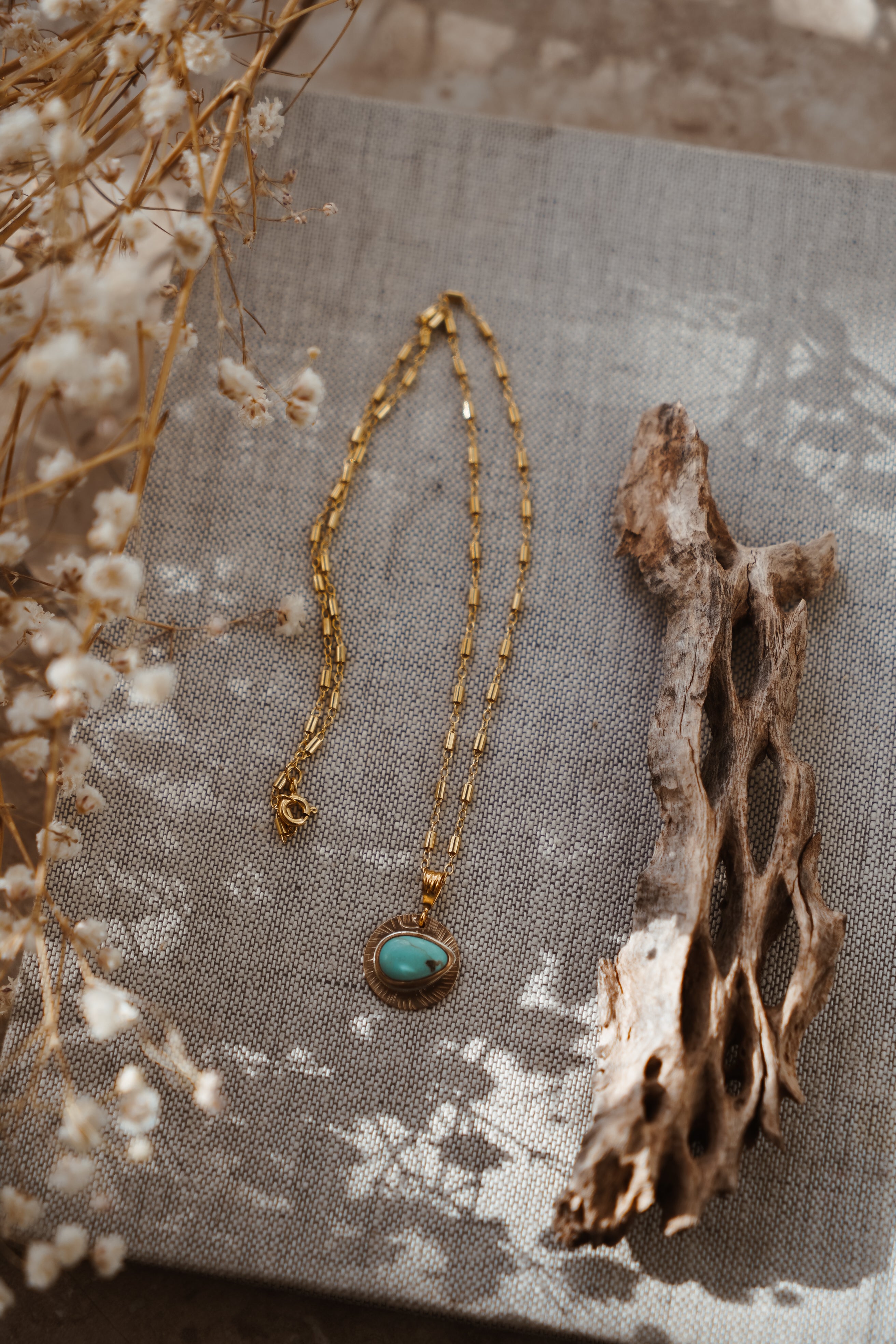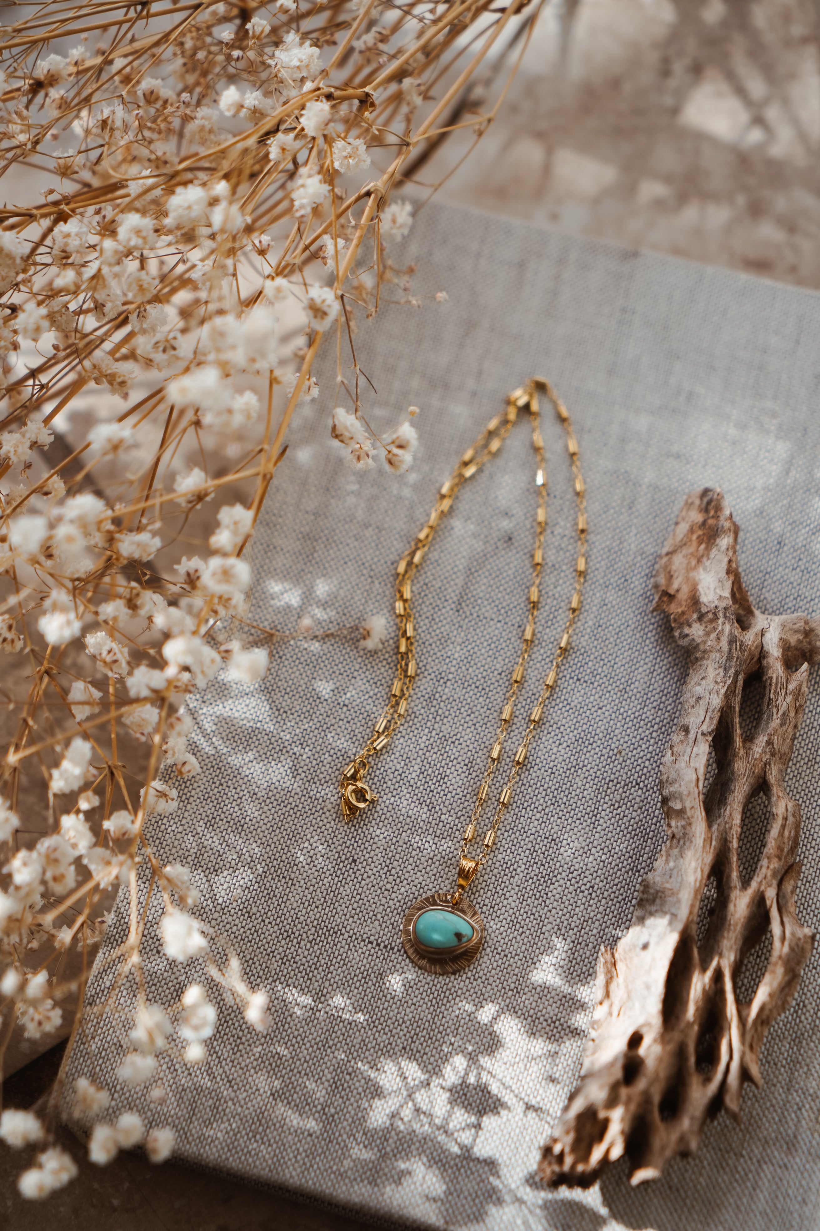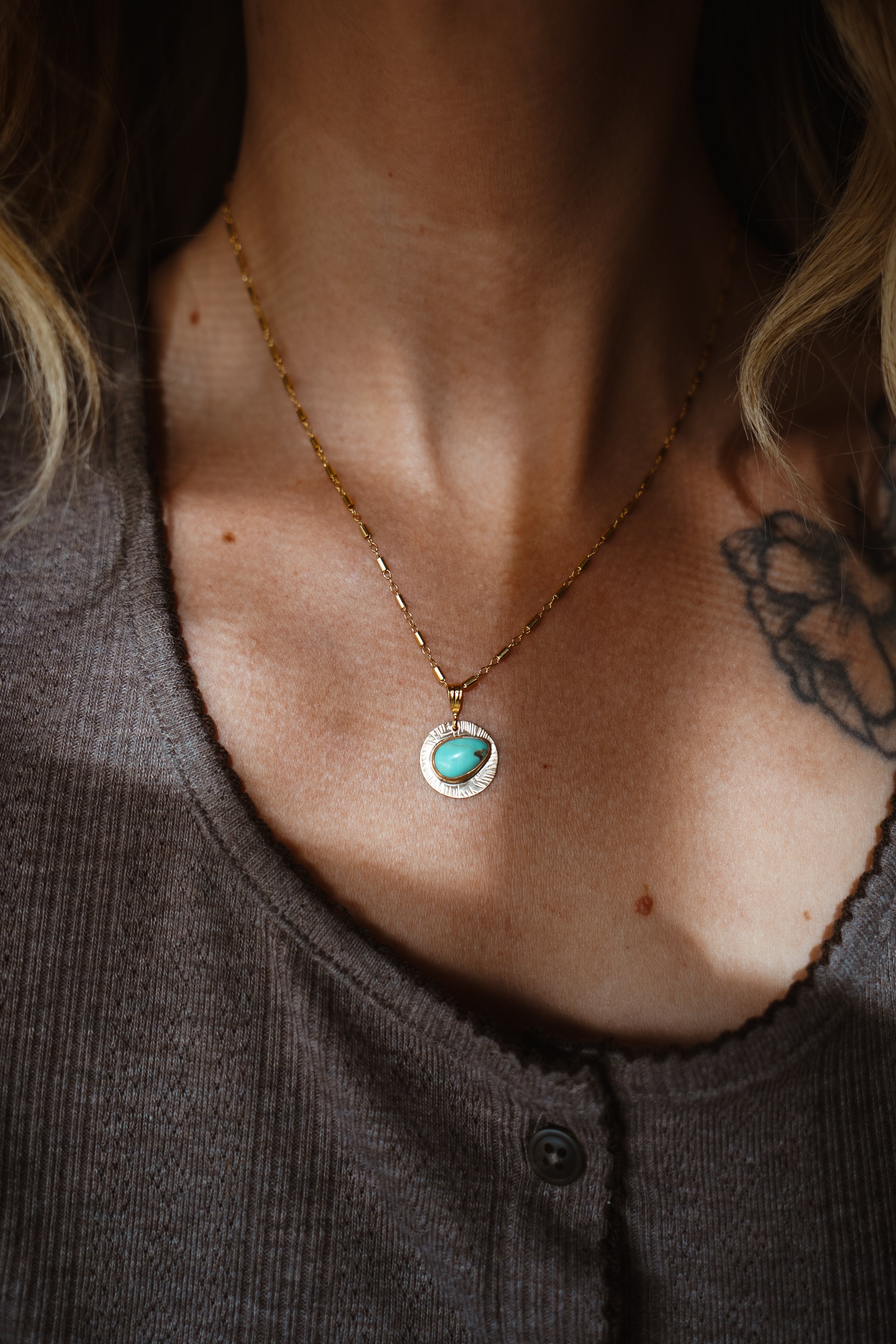 This gold-fill chain and pendant is such a vibe with this lovely light blue Campitos stone. We've been so excited about all the great feedback we got from you guys on these gold-fill necklaces. This is a piece that can be worn with a dress for a special occasion or just as easily for casual everyday wear. Can't wait to see who ends up with this it!