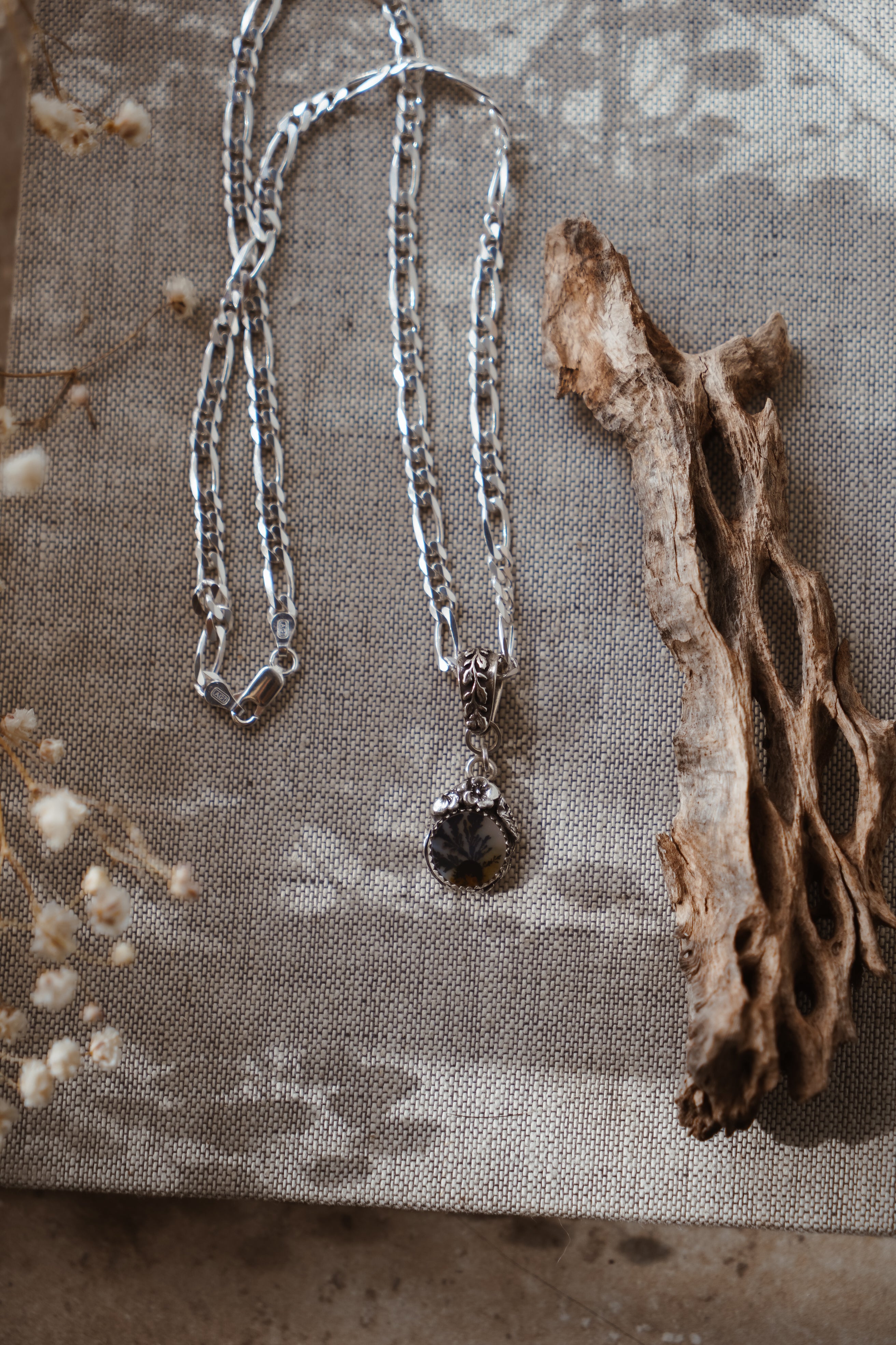 We've had so much fun creating with a new process using .999 fine silver metal clay that we fire in our small kiln. We sculpted and carved this piece by hand from metal clay, fired it up, and this gorgeous pendant was the result. This one-of-a-kind agate formed over millions of years, decorative bail, and Figaro chain all make magic in natural light.