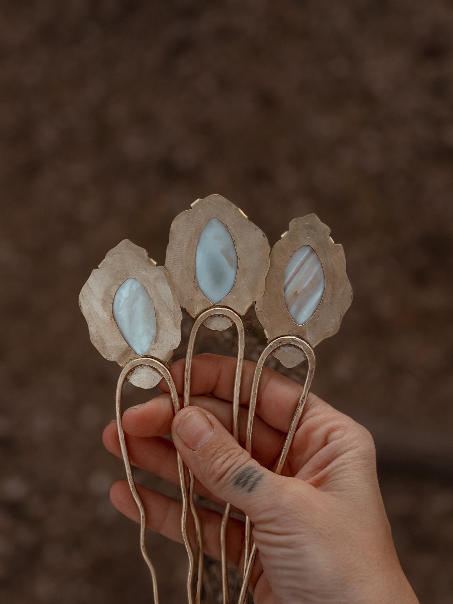 This is our first time to use Abalone Shell in a design and wowza- we're obsessed! They called to us when we passed them at the recent gem show and it feels like they were meant to be in these hair forks. These brass hair forks are perfect with the swirly, psychedelic patterns of these shells.