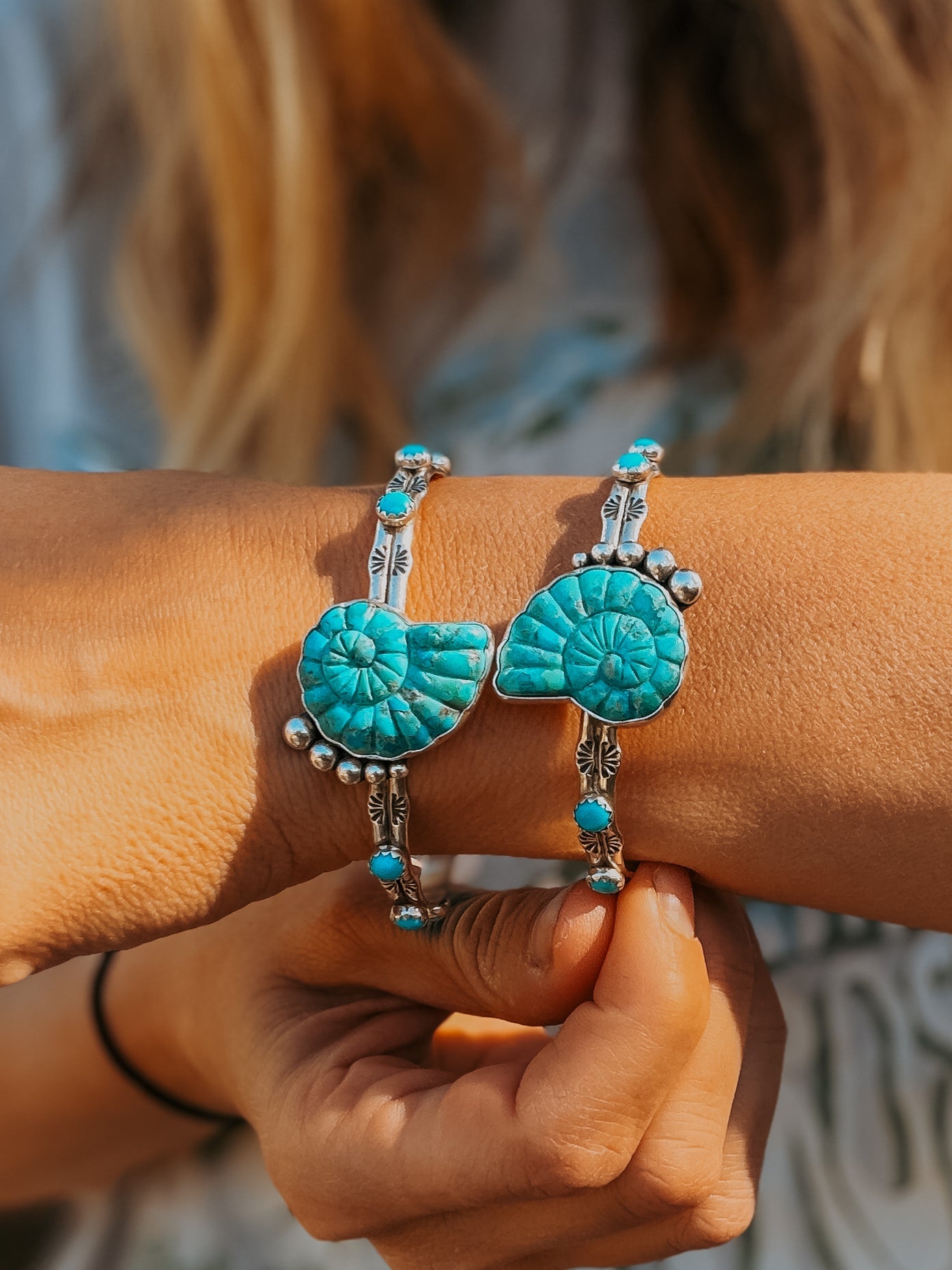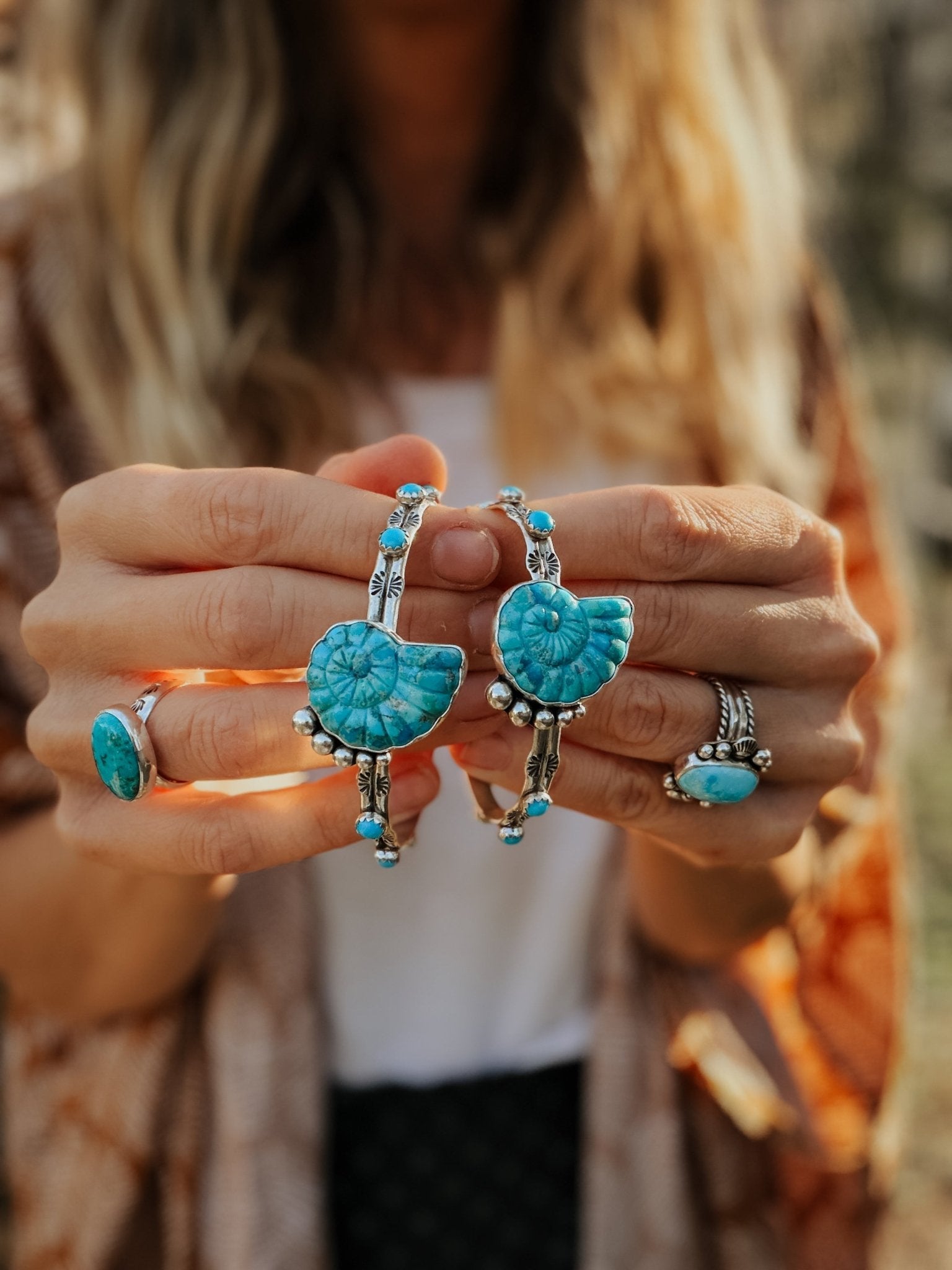 This is one of those designs that drips with fun. We love this cleanly set turquoise stone carved into an ammonite shell pattern. Add in the hand-stamping and blue turquoise stones going down the cuff band and this one is one of those truly special pieces.
